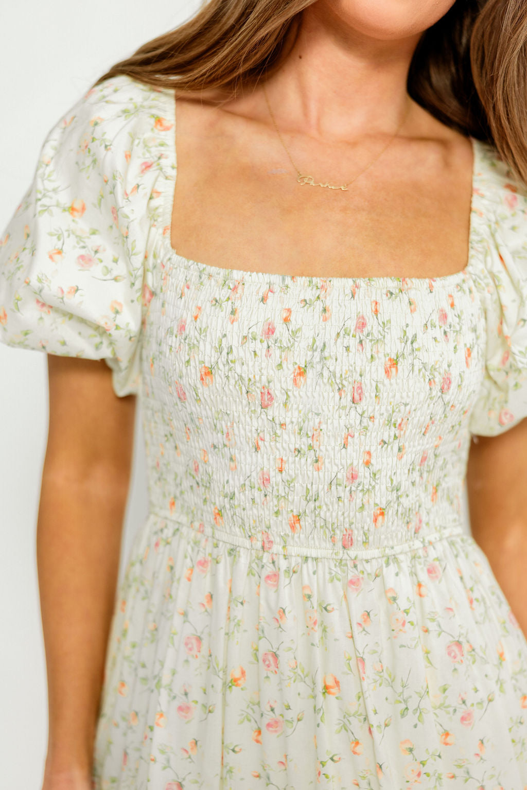 Eliana Floral Puff Sleeve Midi Dress in Off White Multi