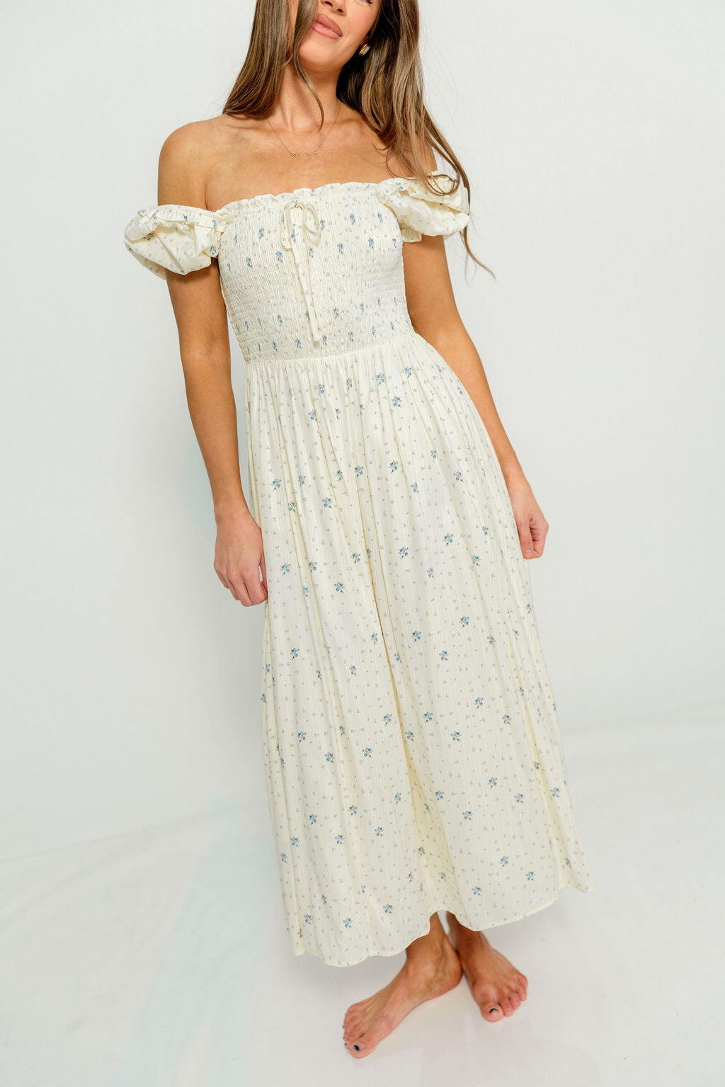 Nya 100% Cotton Smocked Midi Dress in Cream Blue Floral