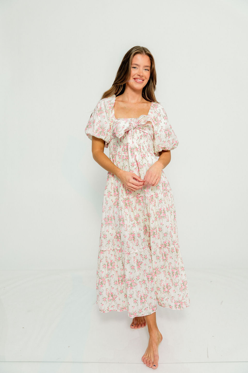 Junie Puff Sleeve Floral Midi Dress in Off-White/Pink