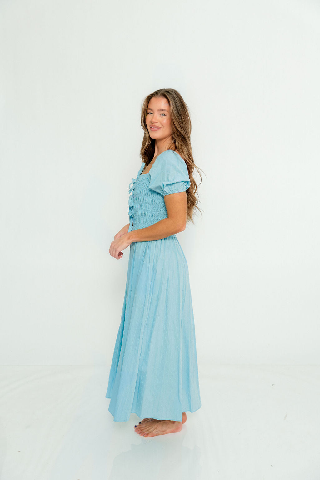 Arabelle Smocked Bow Detail Maxi Dress in Blue Aura