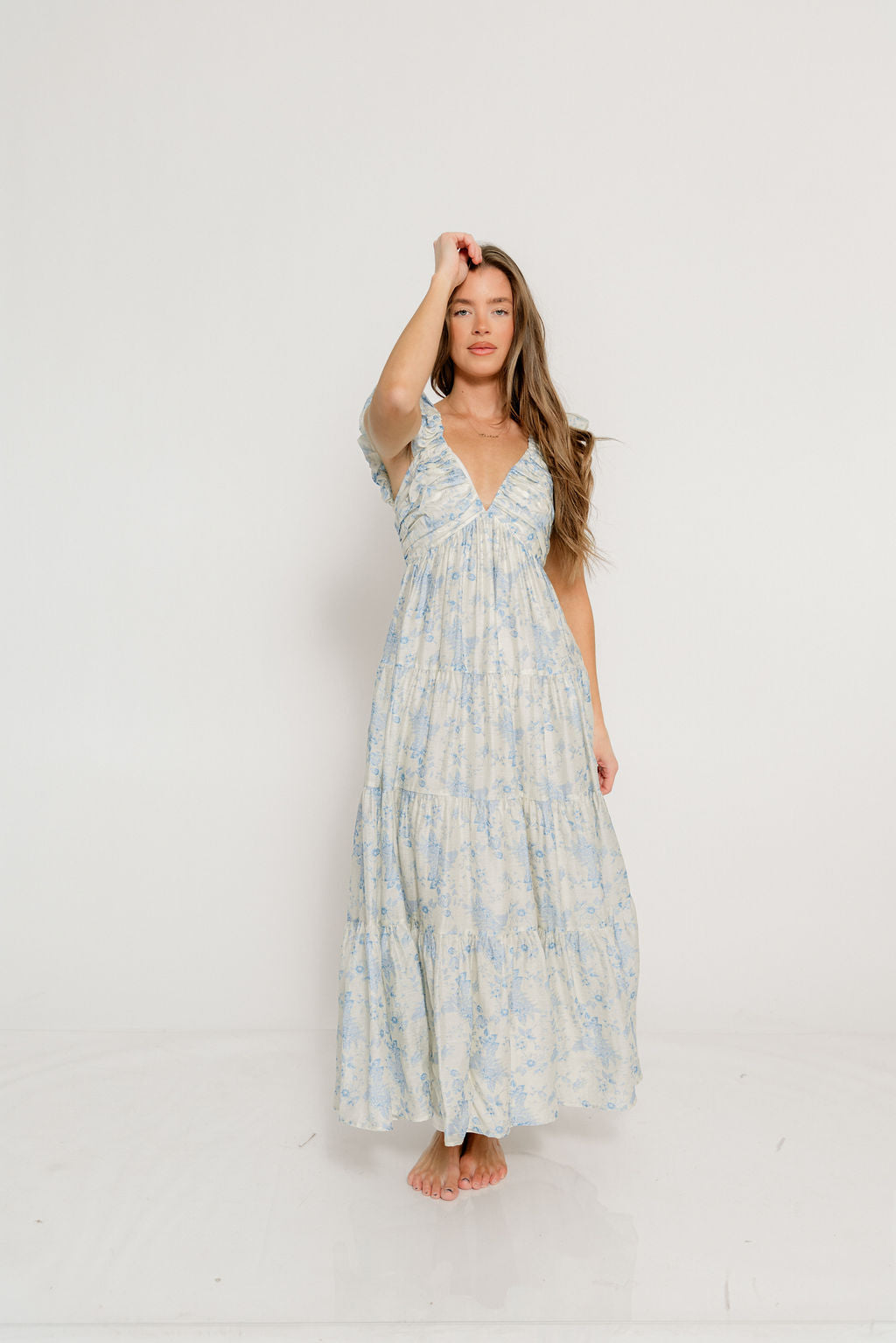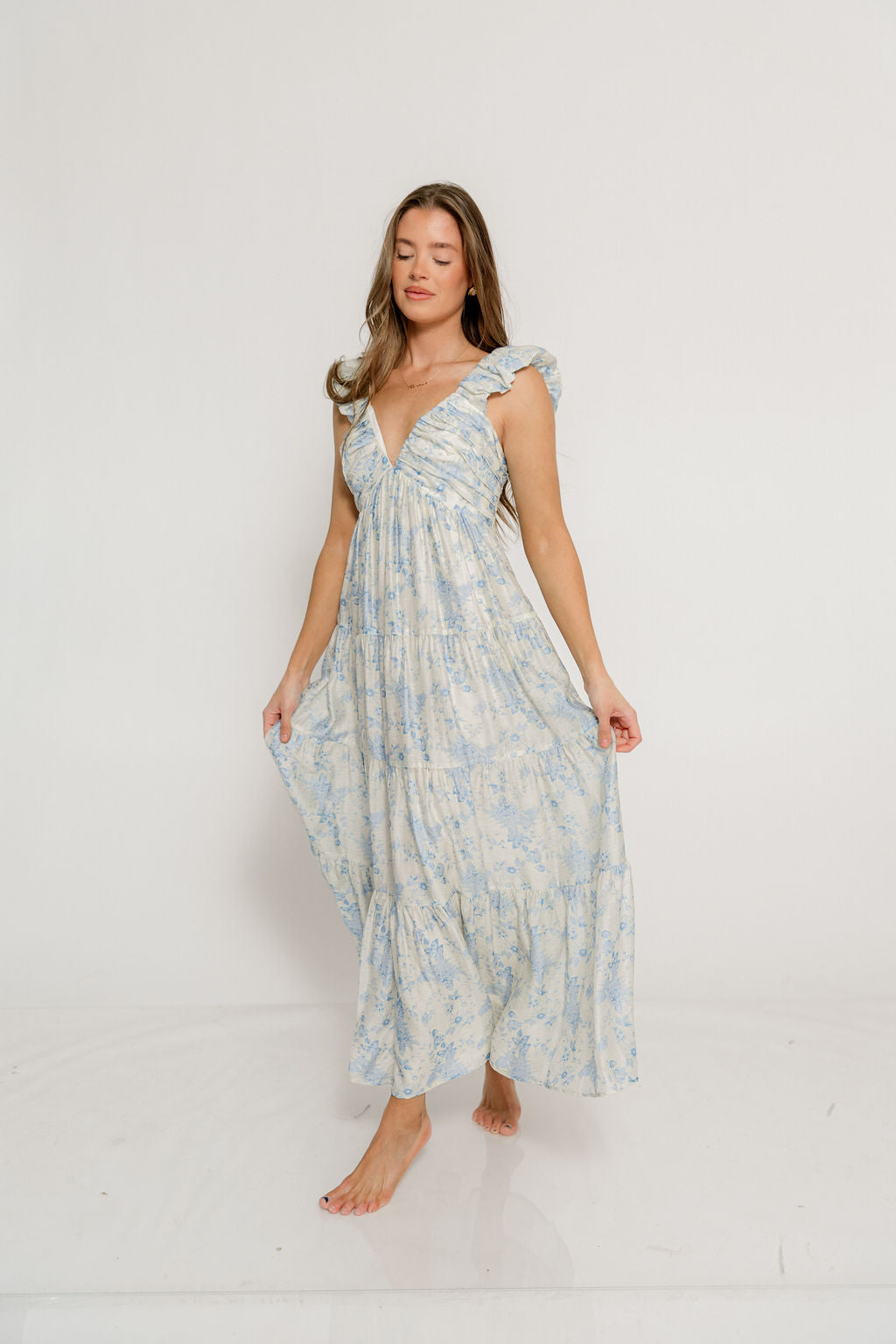 Katy Pleated Bodice Maxi Dress in Blue Floral