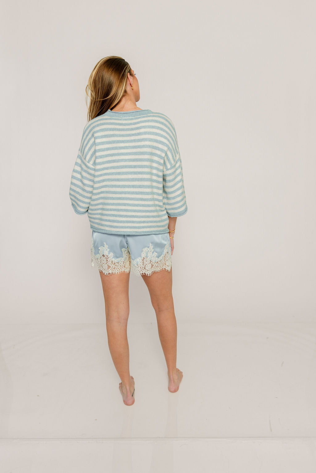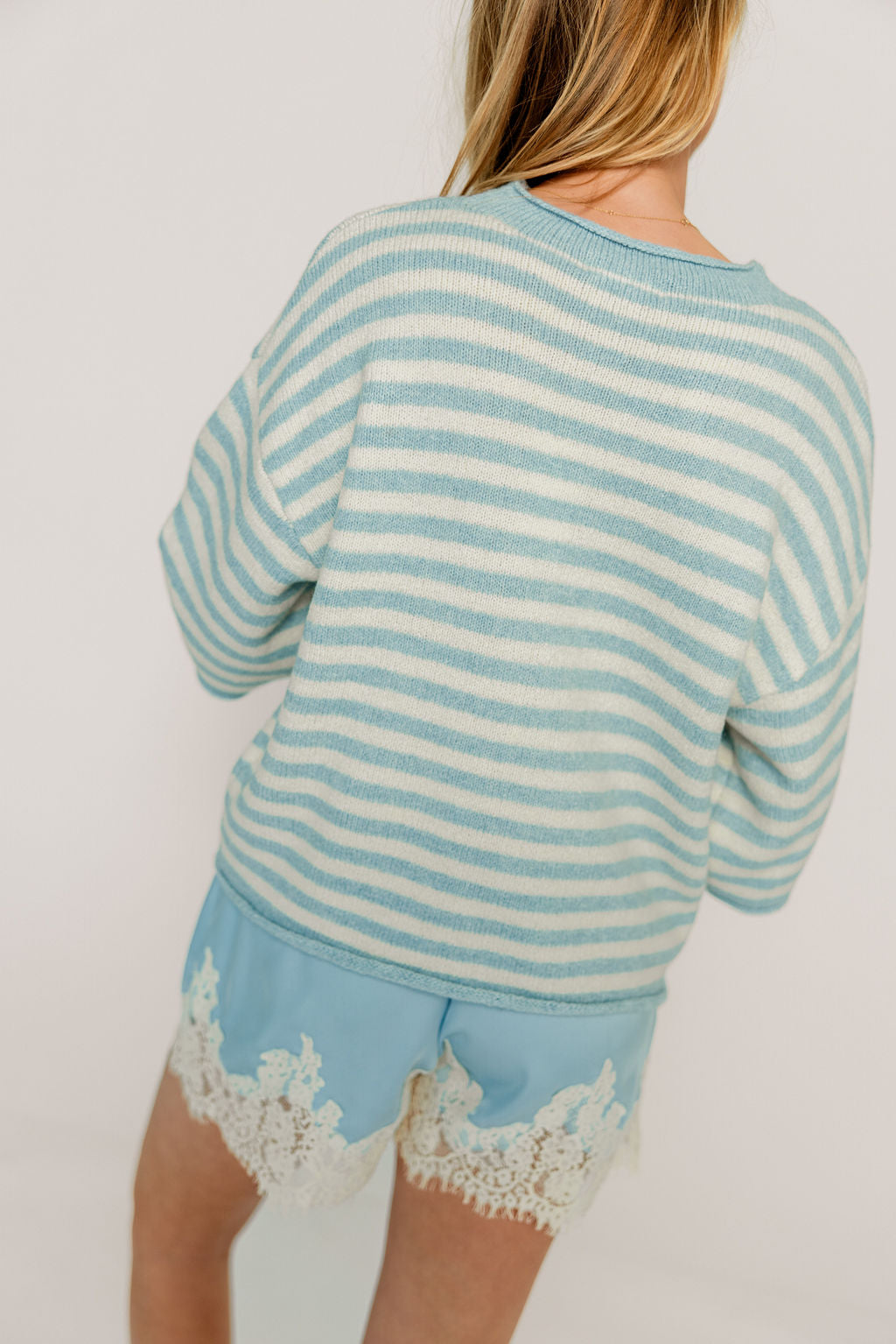 Imogen Striped 3/4 Sleeve Cardigan Top in Light Blue Ivory