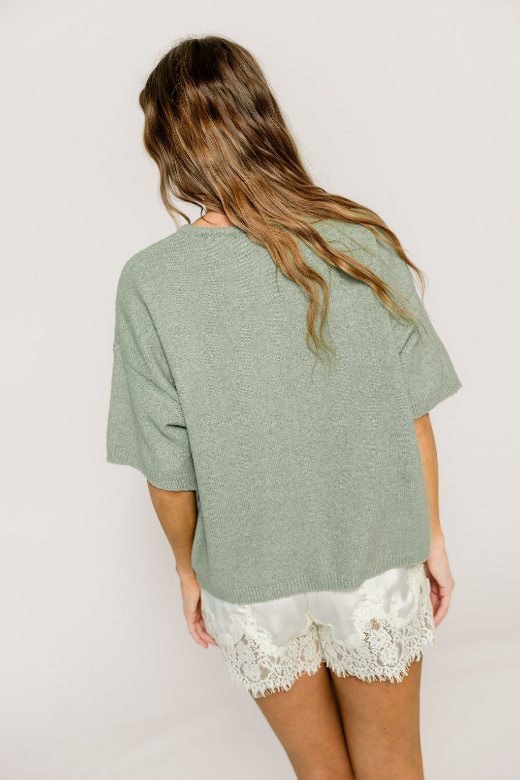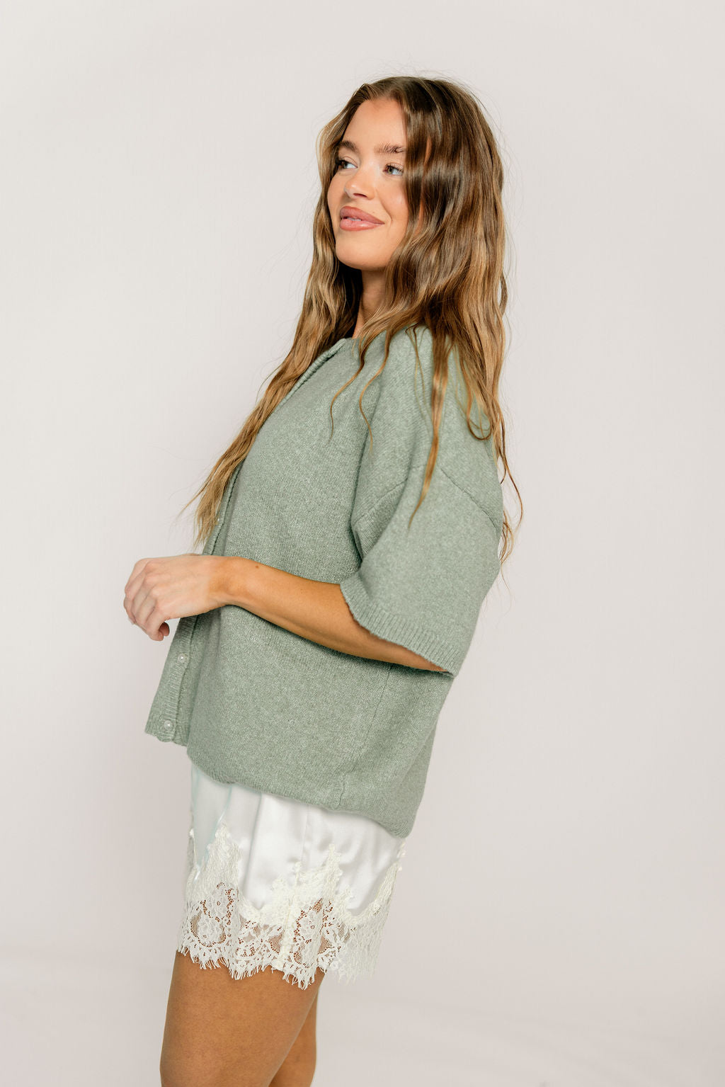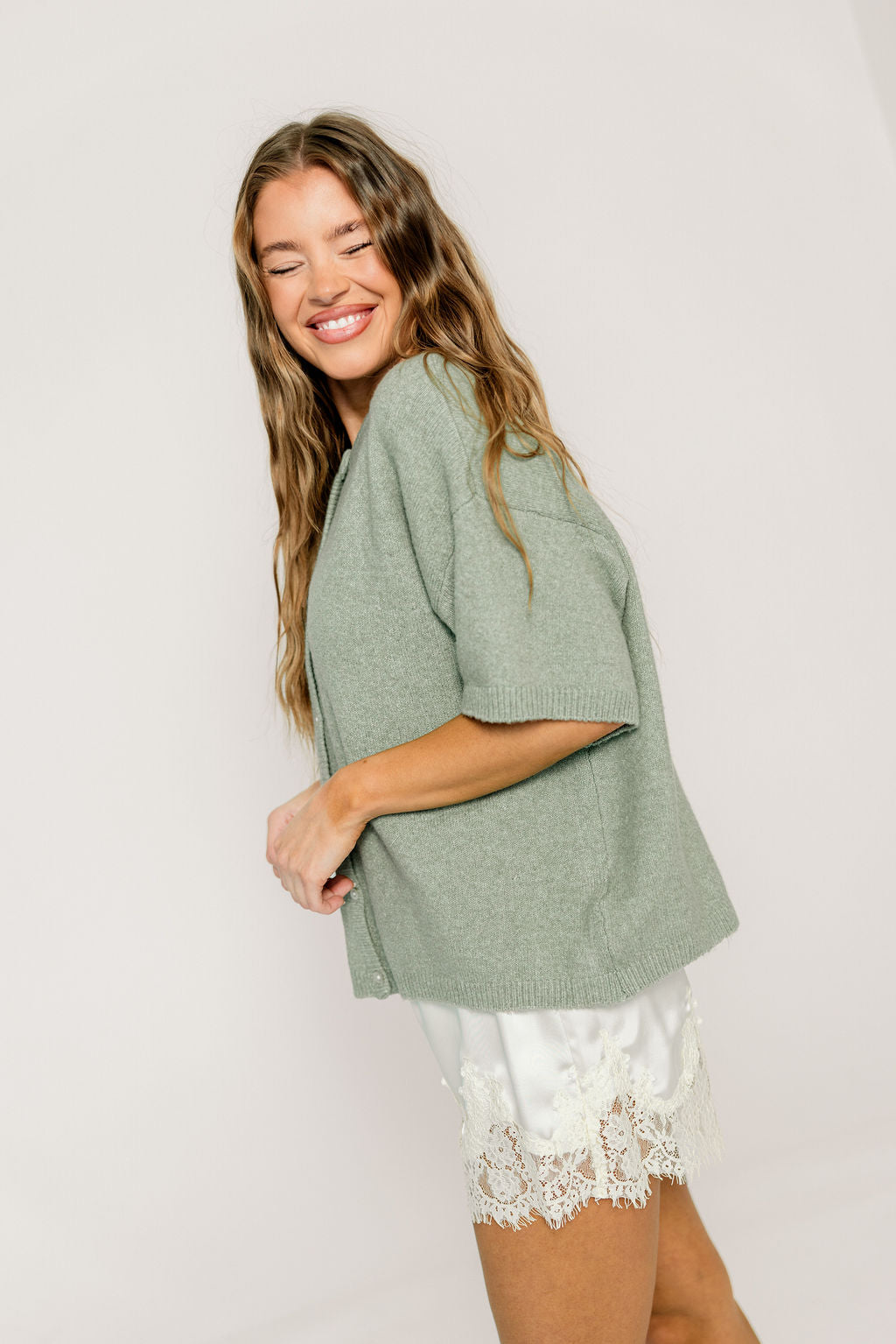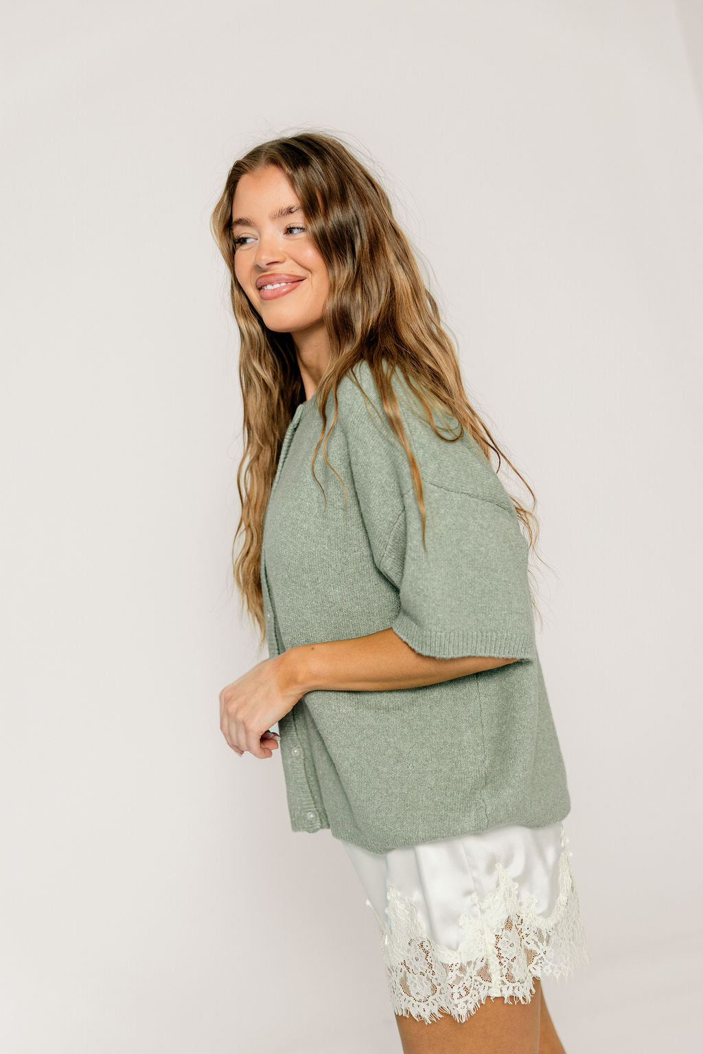 Paula Short Sleeve Cardigan Sweater Top in Light Green