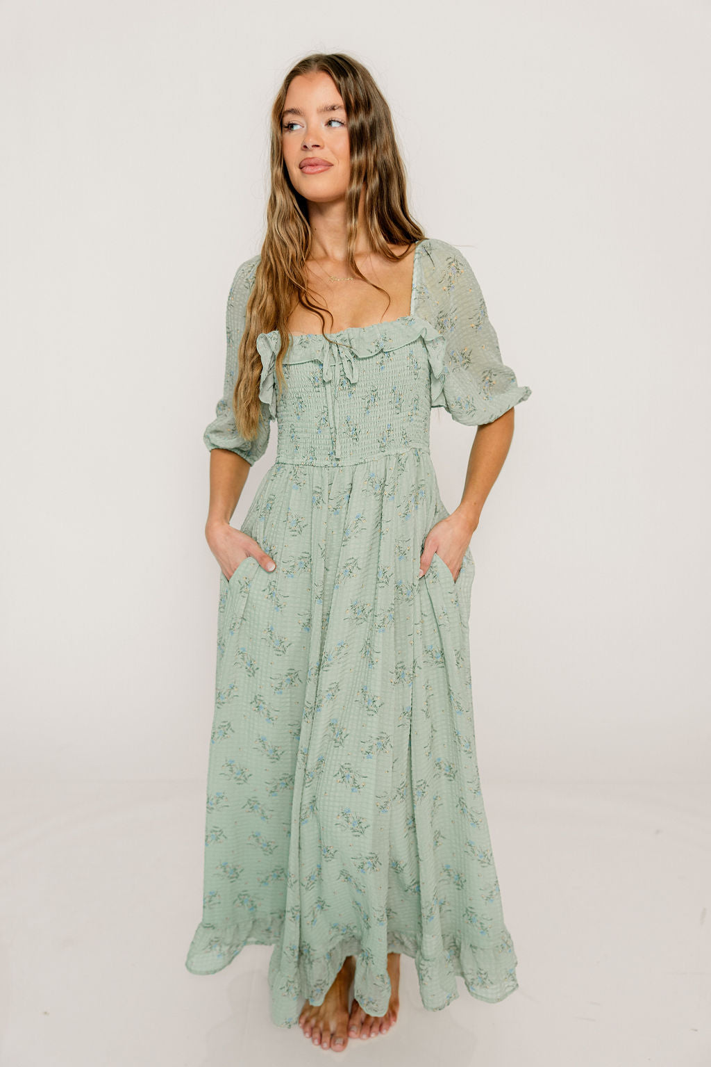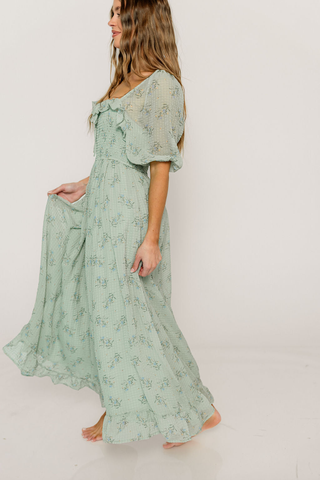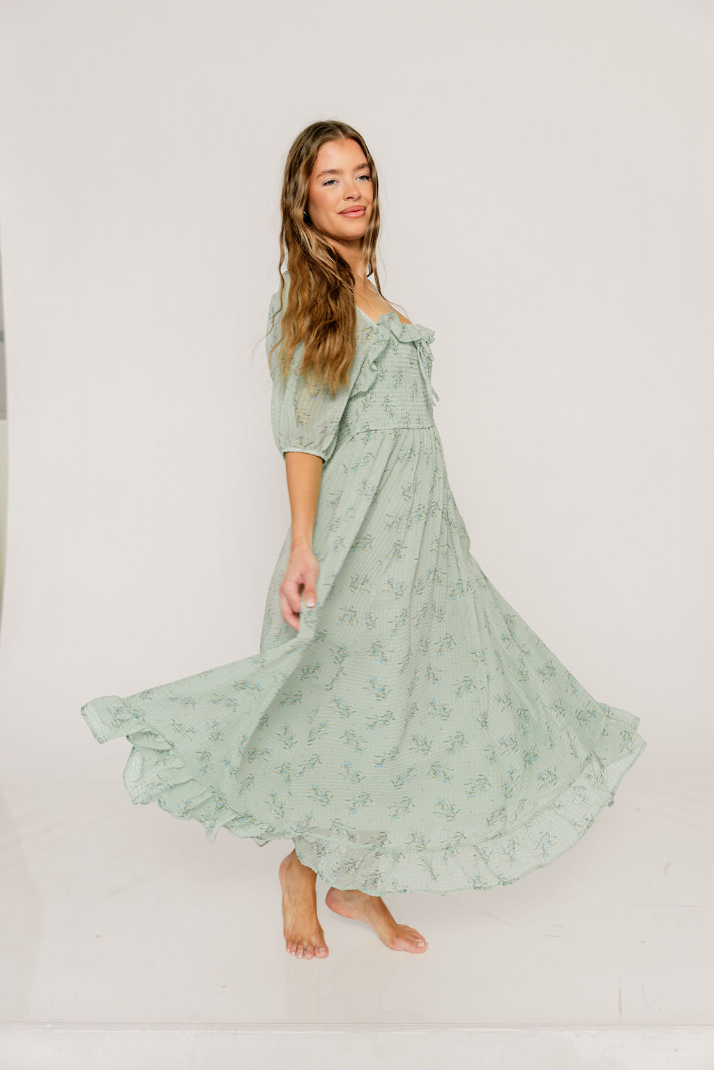 Elle Smocked Floral Ruffle Maxi Dress in Green Tea Floral