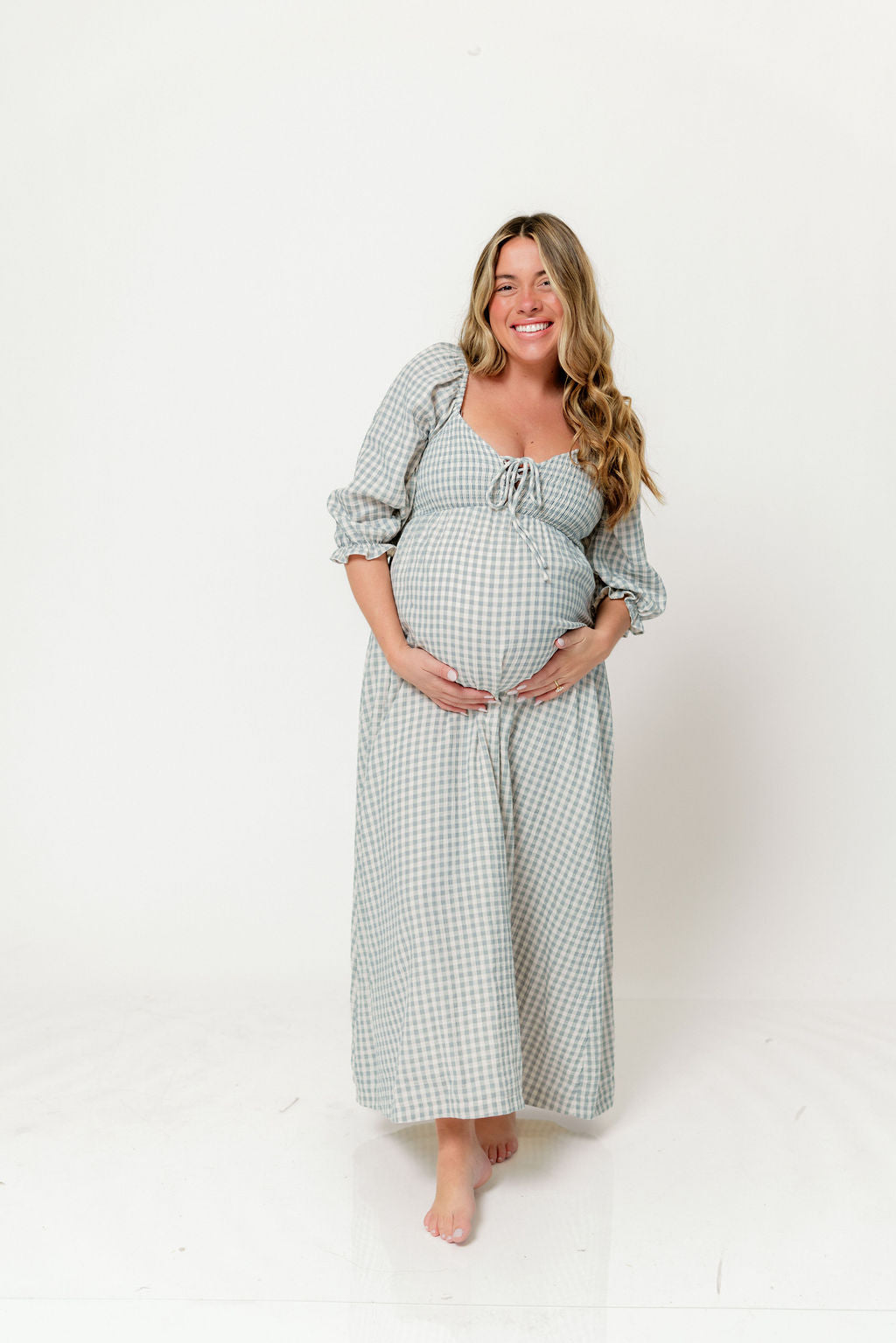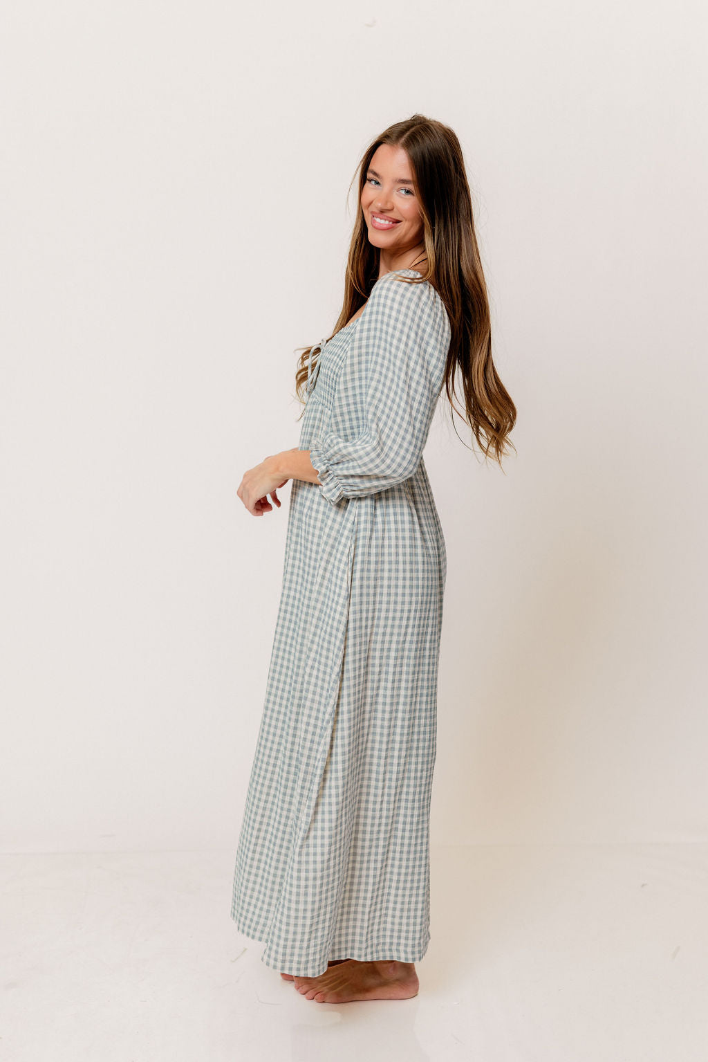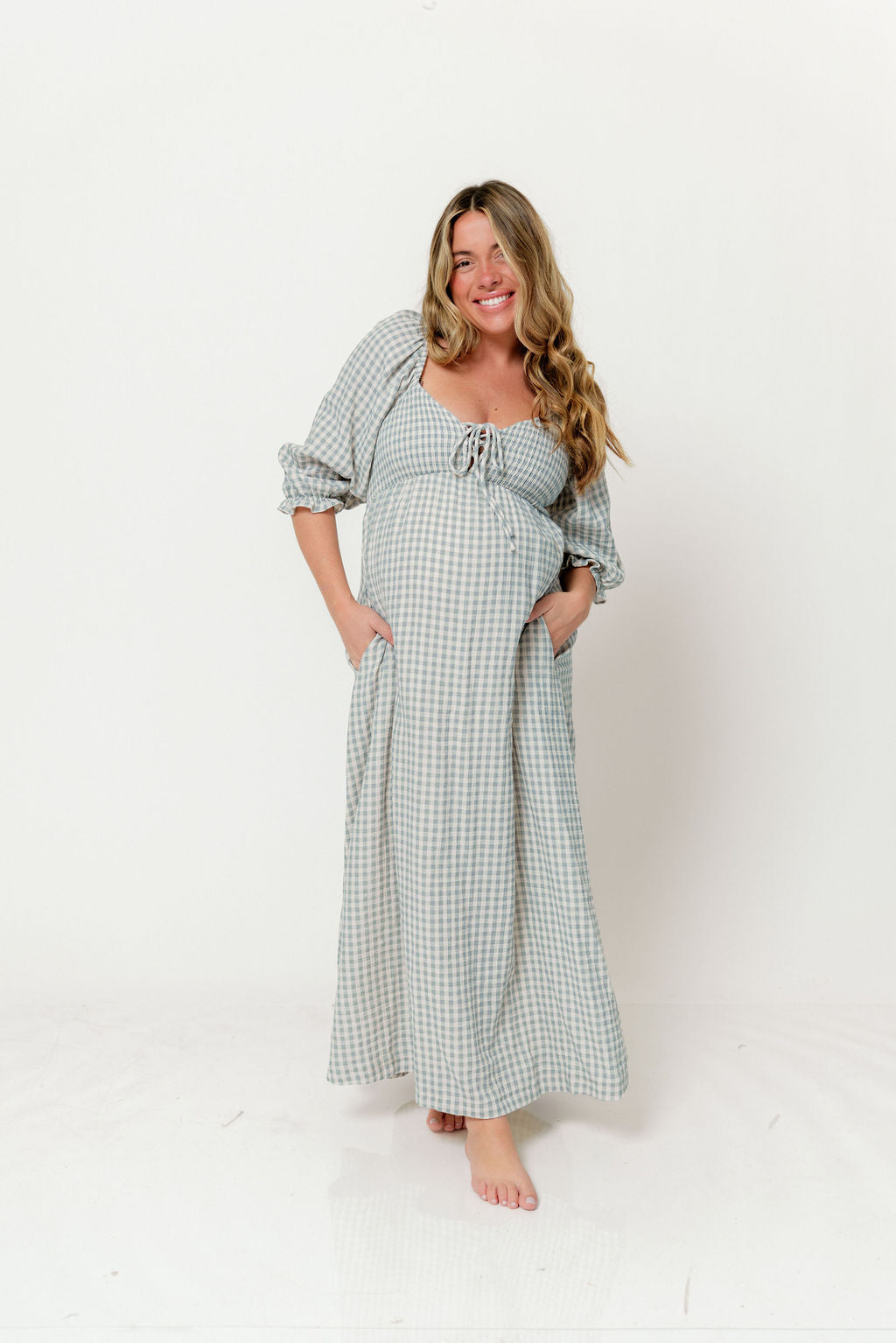 Sienna 100% Cotton Puff Sleeve Maxi Dress in Aqua Plaid (Lined) - Bump Friendly *2/12 PRE-ORDER*