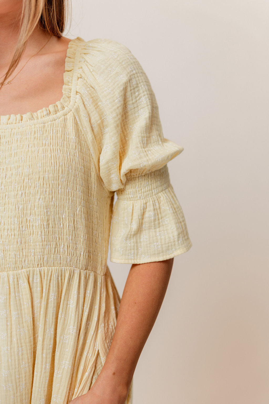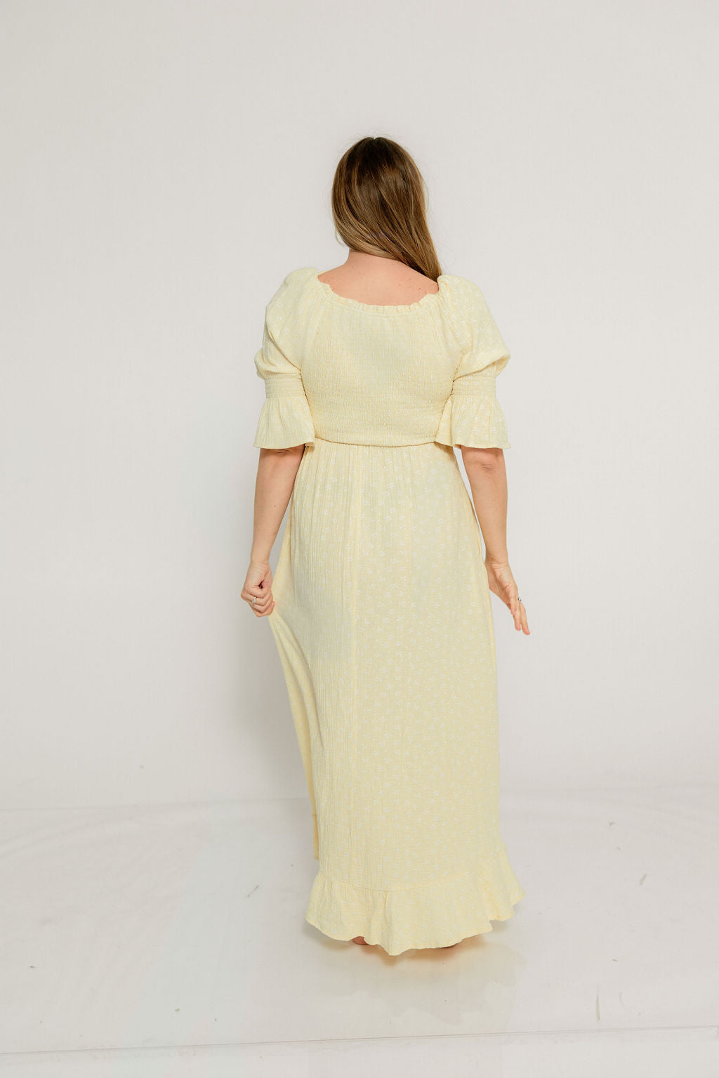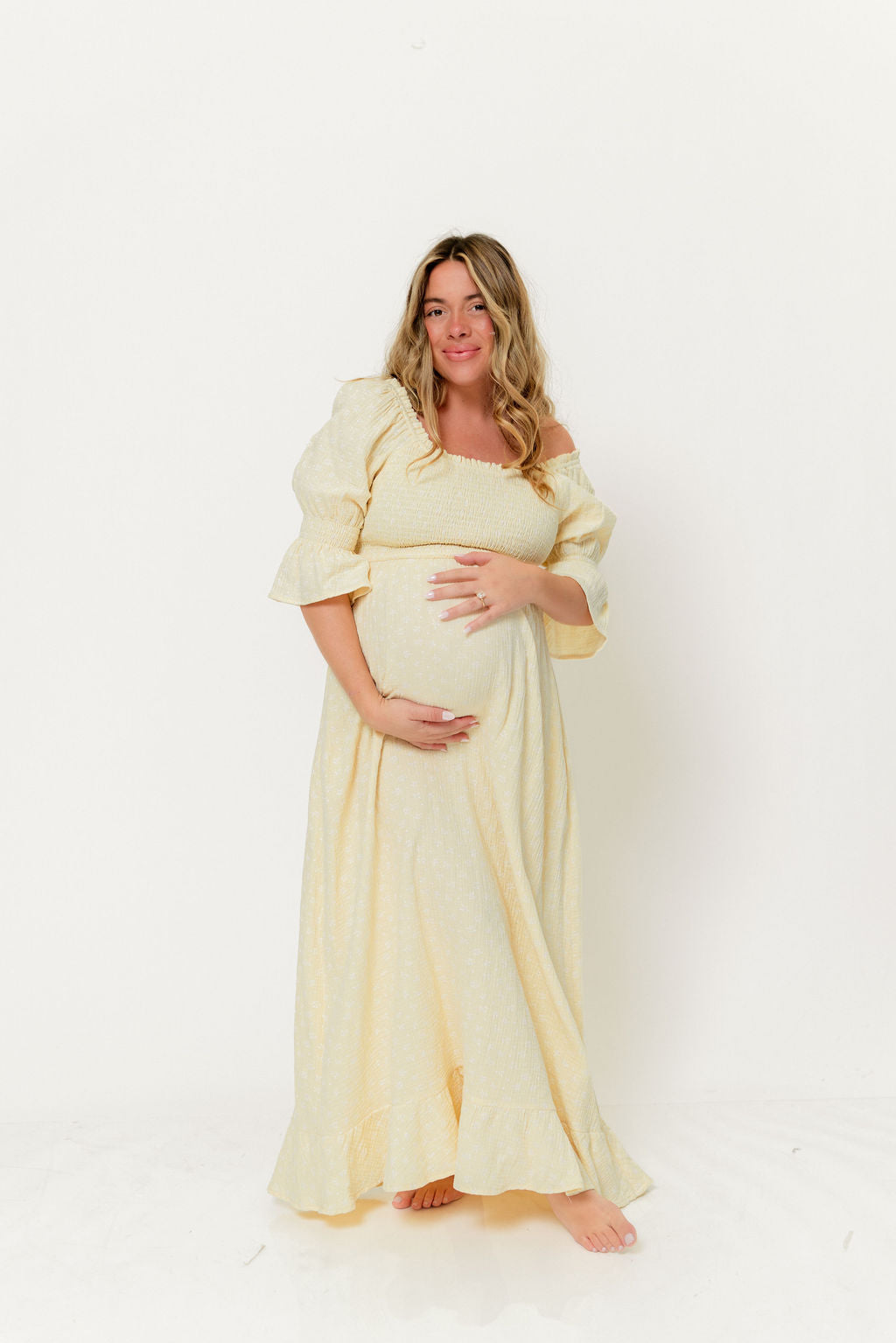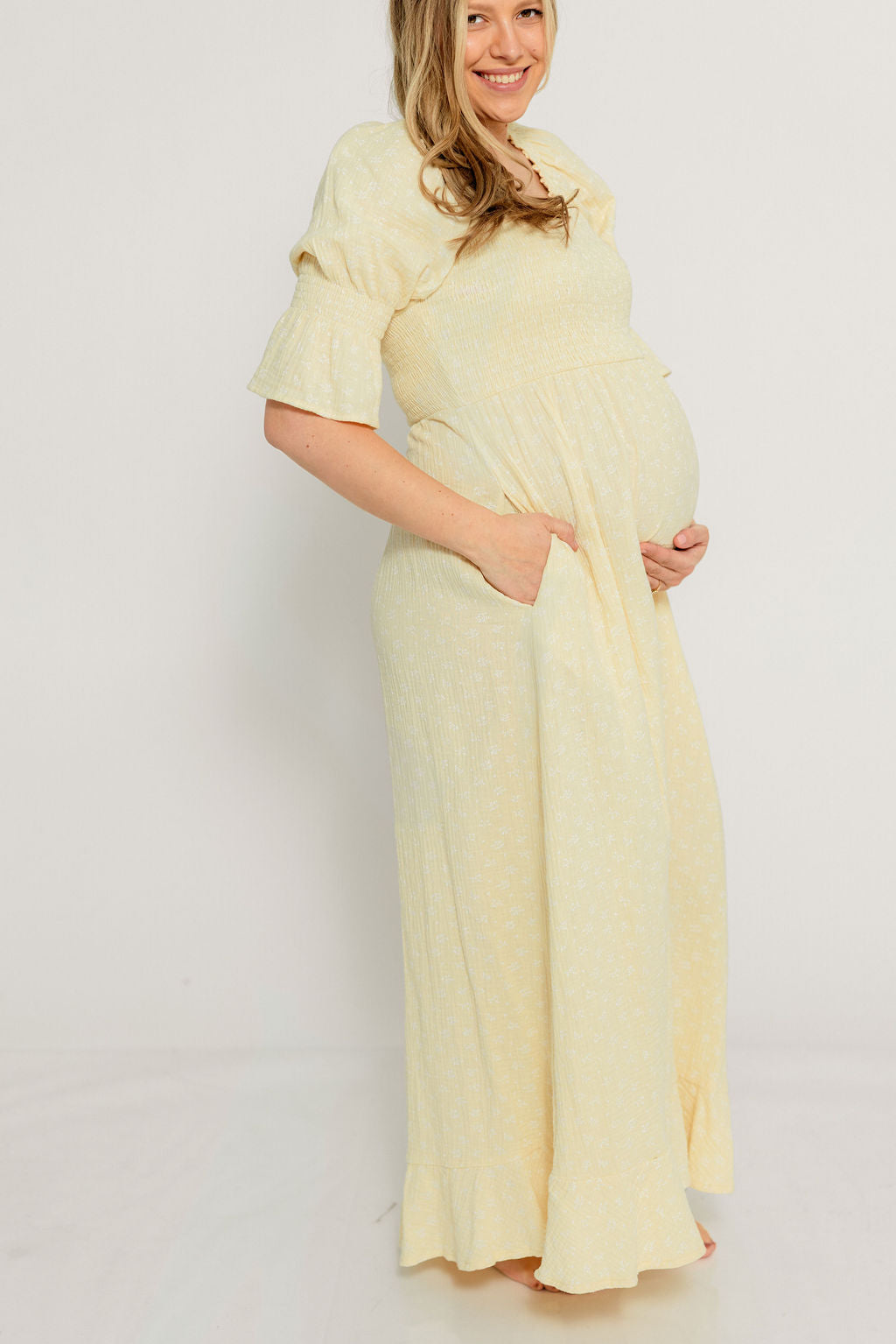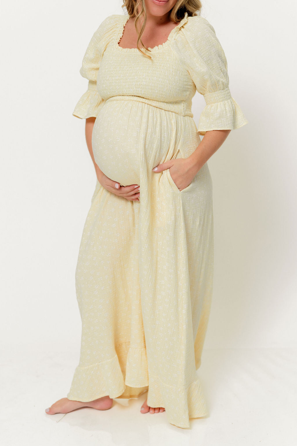Cecilia 100% Cotton Smocked Maxi Dress in Custard Foliage - Bump Friendly