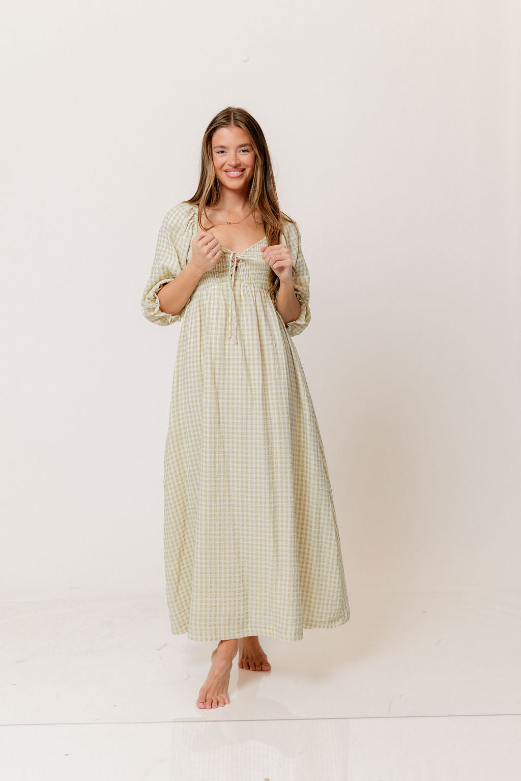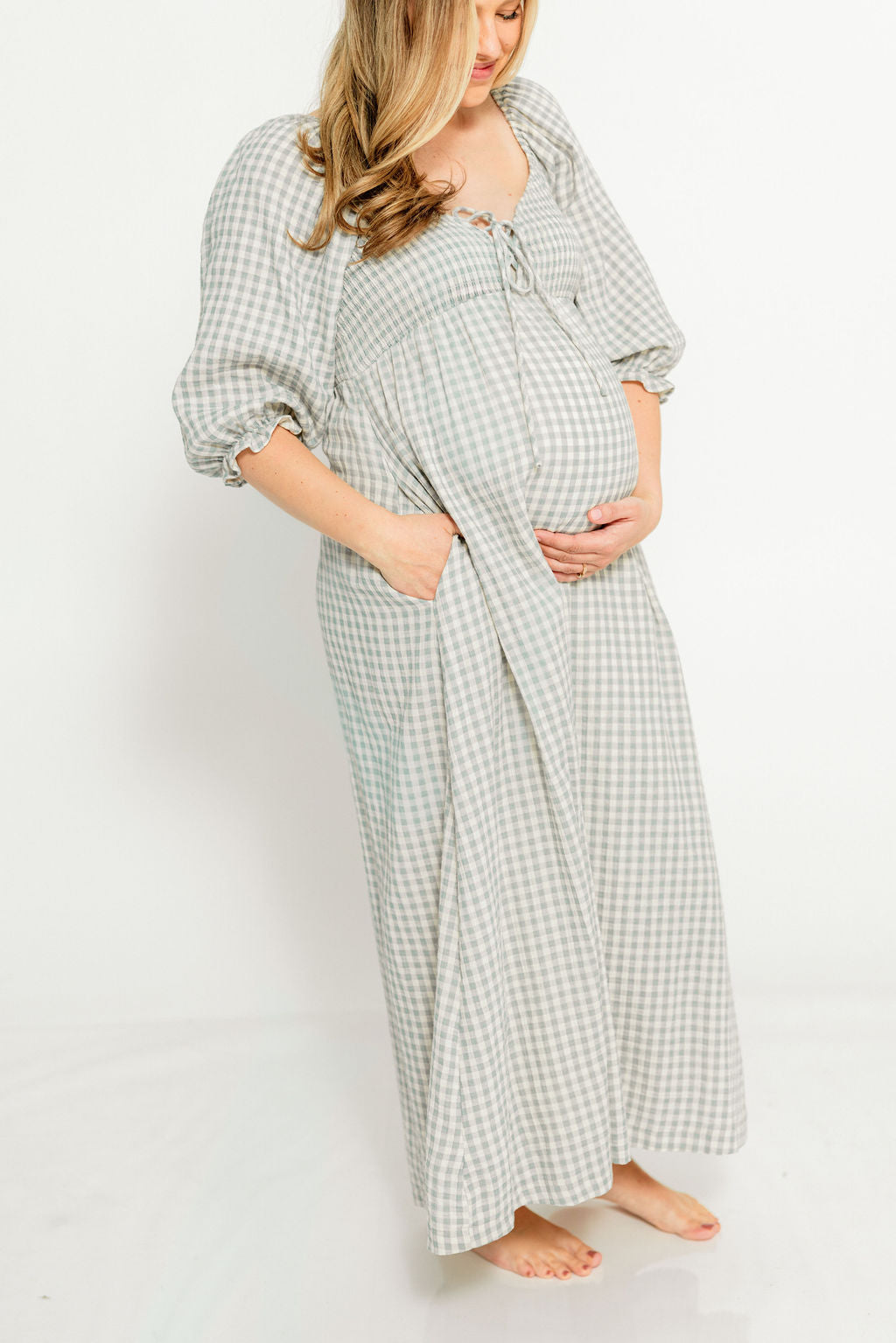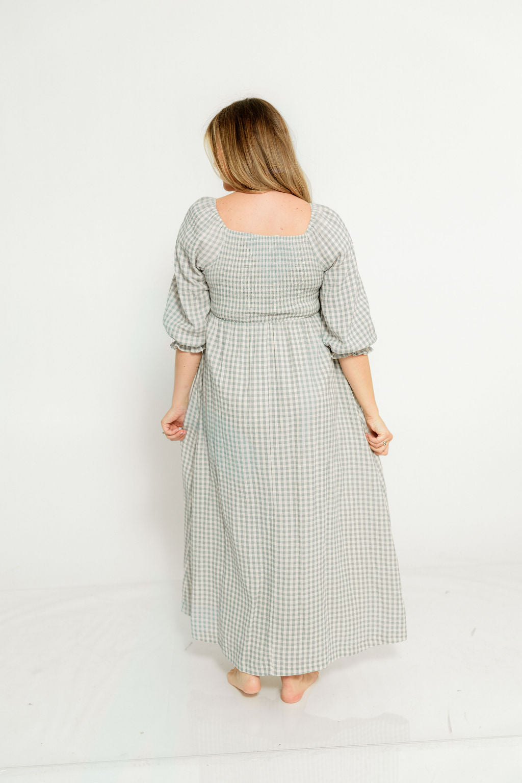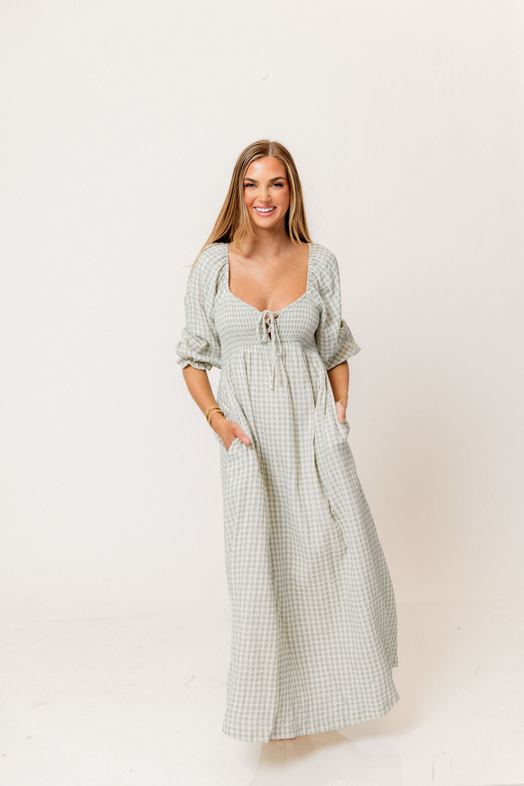 Sienna 100% Cotton Puff Sleeve Maxi Dress in Green Haze Plaid (Lined) - Bump Friendly *2/12 PRE-ORDER*
