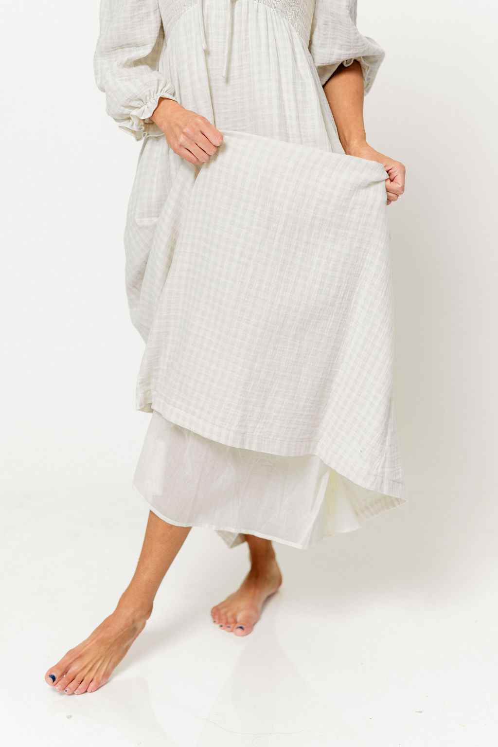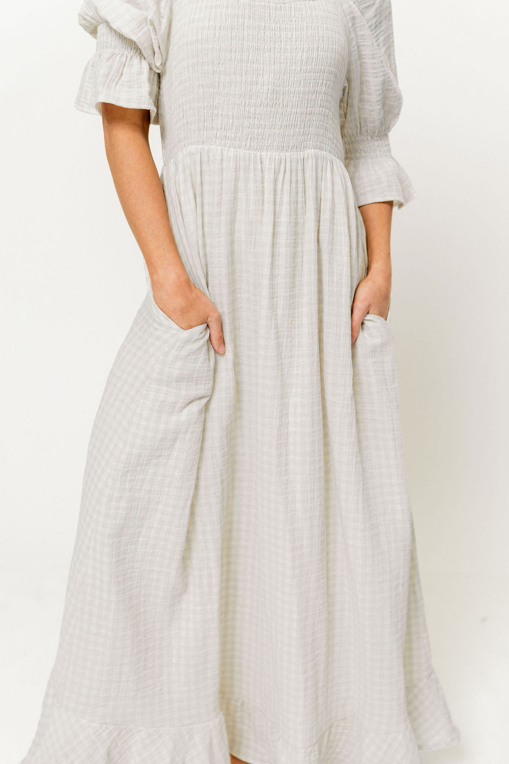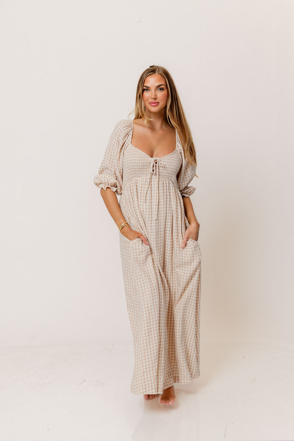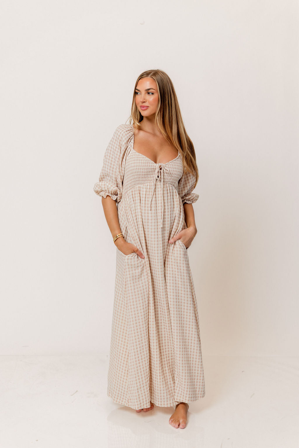 Sienna 100% Cotton Puff Sleeve Maxi Dress in Mute Pale Pink Plaid (Lined) - Bump Friendly