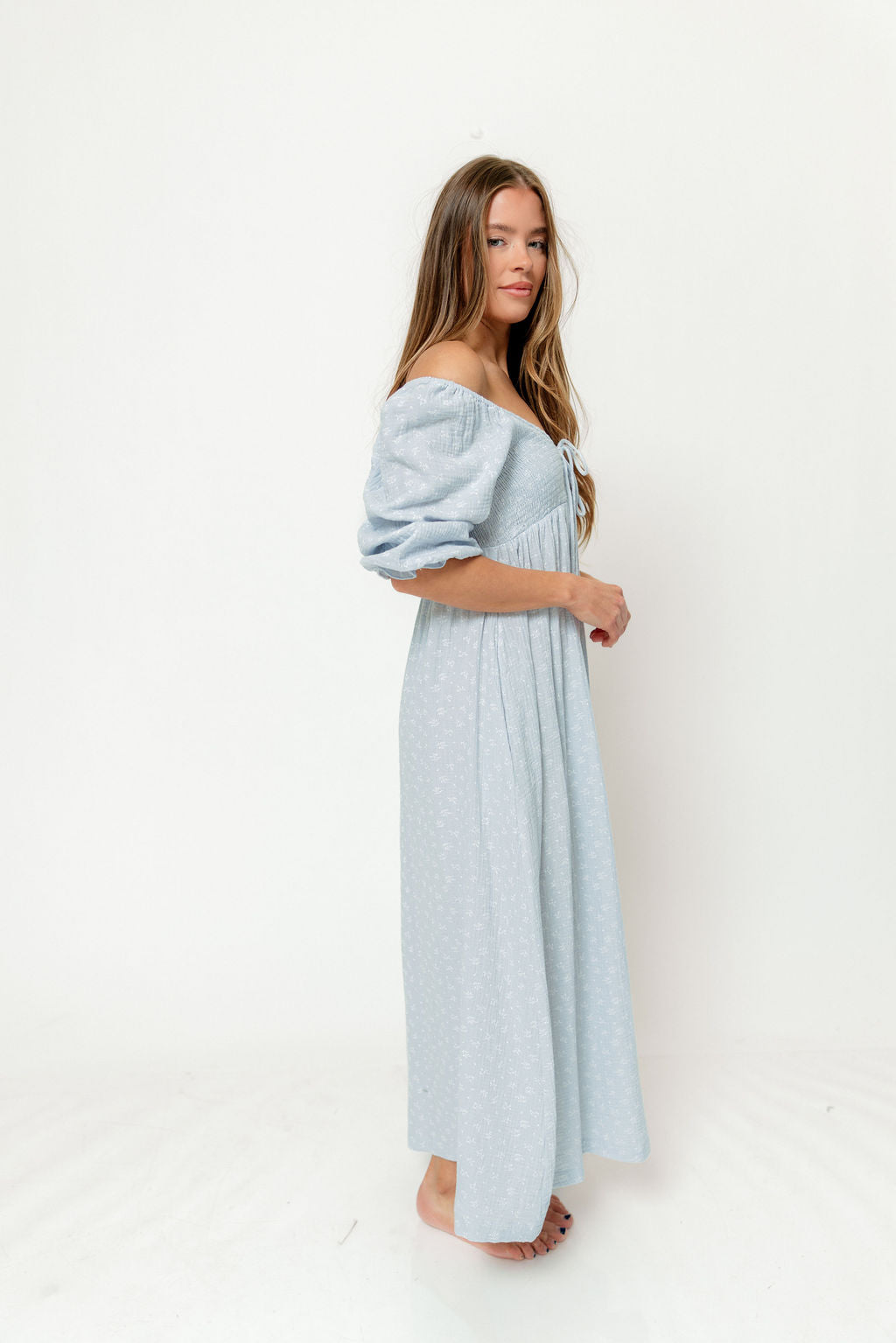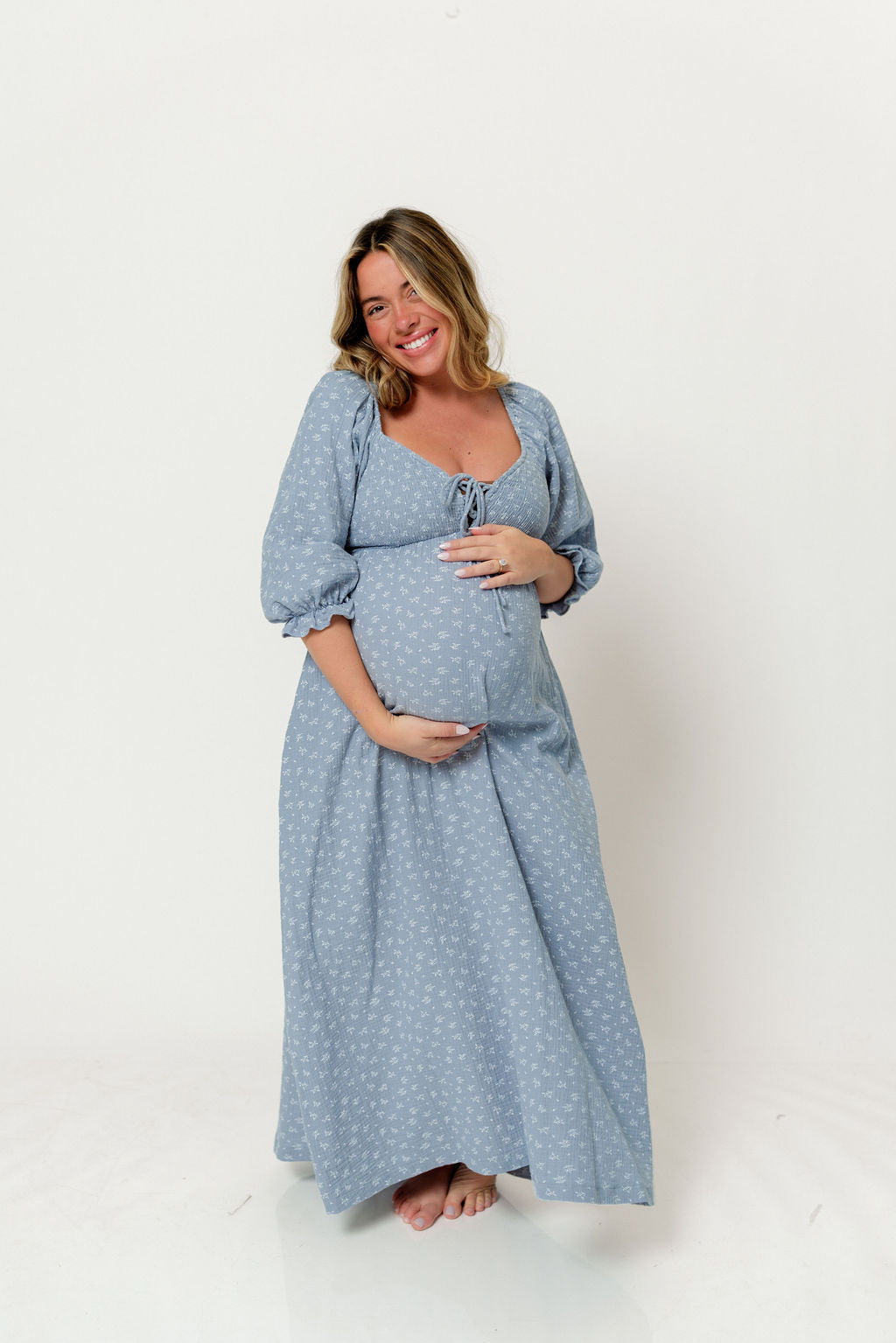 Sienna 100% Cotton Puff Sleeve Maxi Dress in Baby Blue Foliage - Bump Friendly