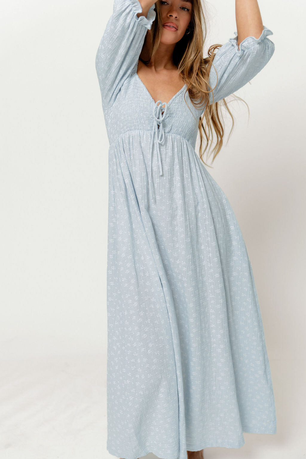 Cecilia 100% Cotton Smocked Maxi Dress in Baby Blue Foliage - Bump Friendly
