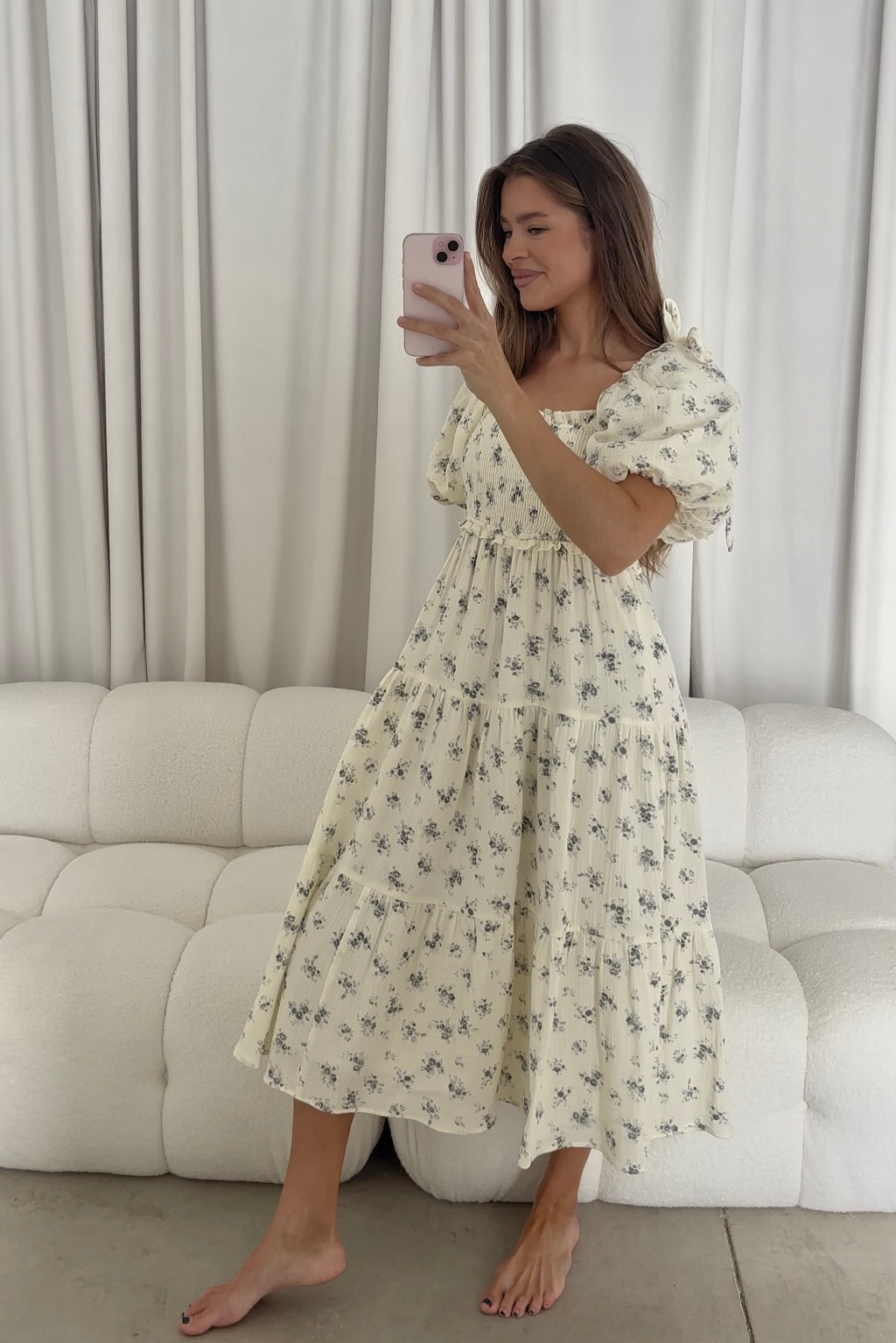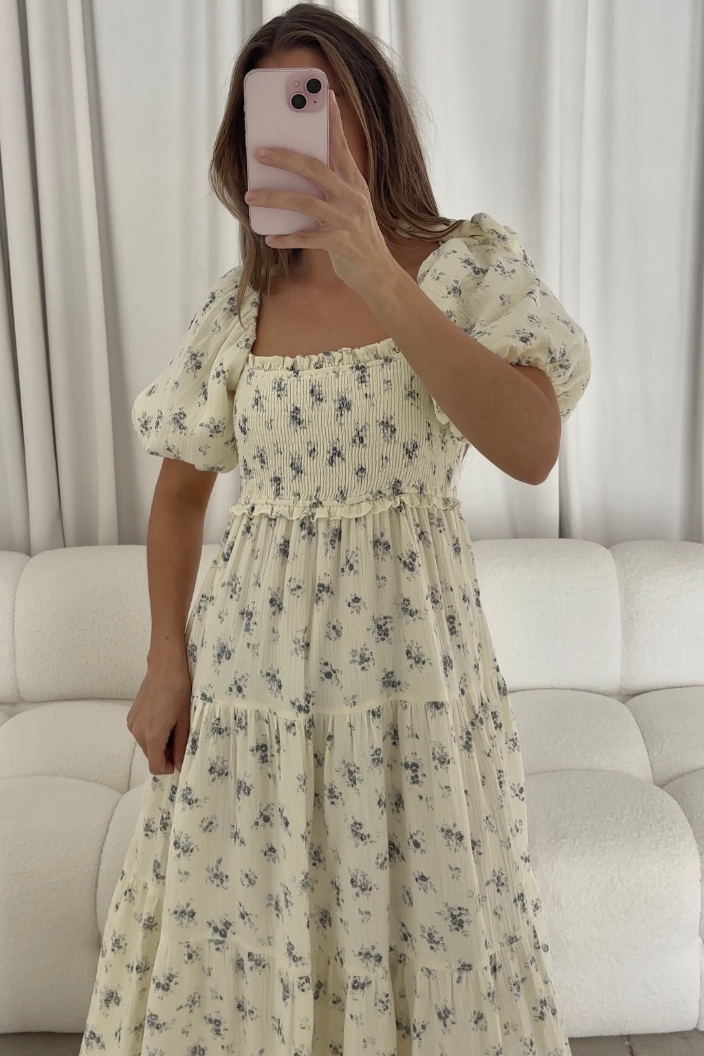 Sienna 100% Cotton Puff Sleeve Maxi Dress in Custard Foliage - Bump Friendly