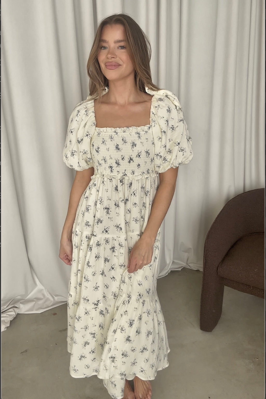 Elena 100% Cotton Midi Dress in Off White/Blue Floral - Bump Friendly