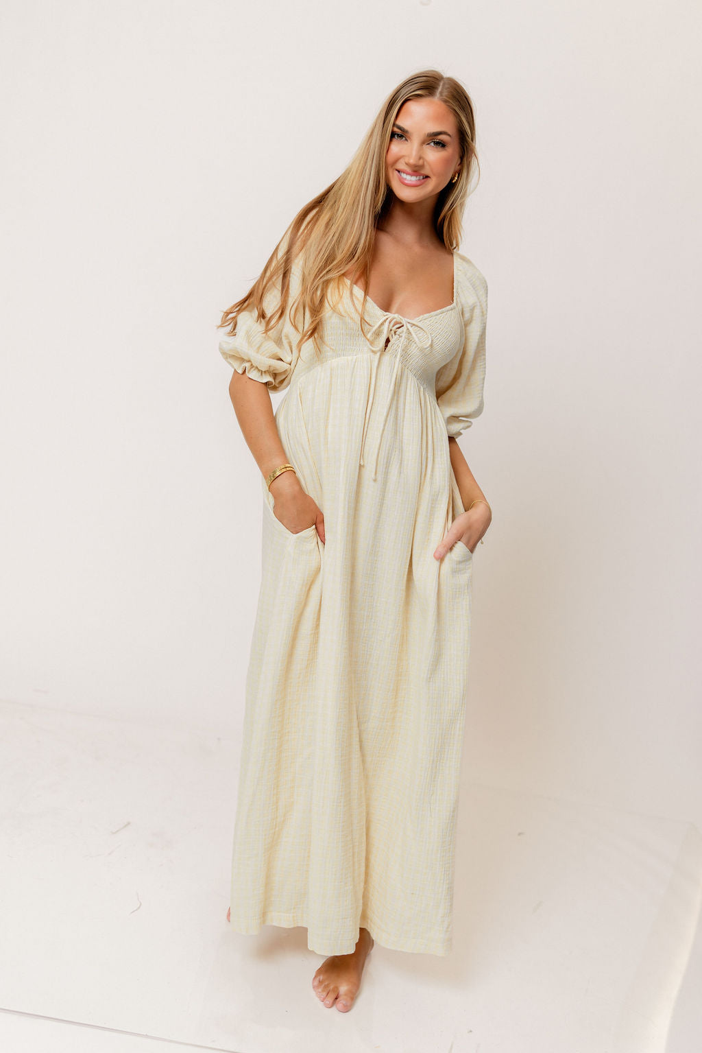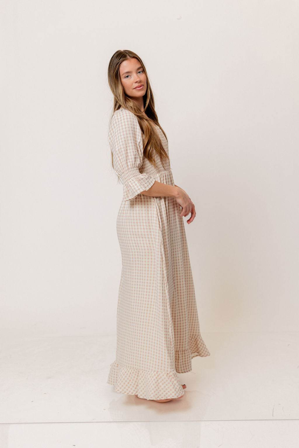 Sienna 100% Cotton Puff Sleeve Maxi Dress in Custard Plaid (Lined) - Bump Friendly