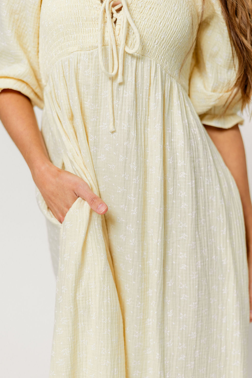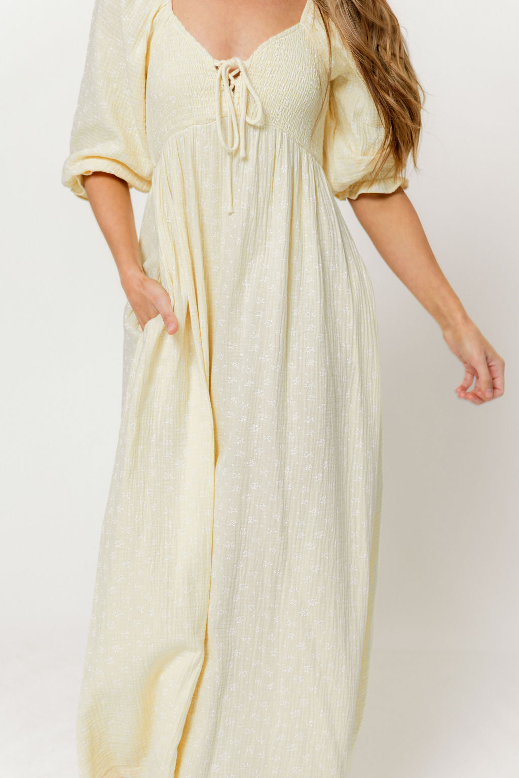 GARMENT DETAILS: Lightweight cotton maxi dress in a charming foliage print, with a sweetheart neckline, 3/4 length sleeves, and an adjustable front tie detail. Features a smocked bodice, side pockets, and ruffle accents. This colorway is not lined.