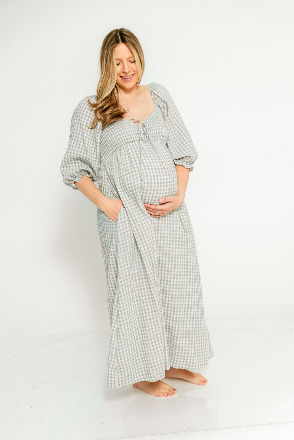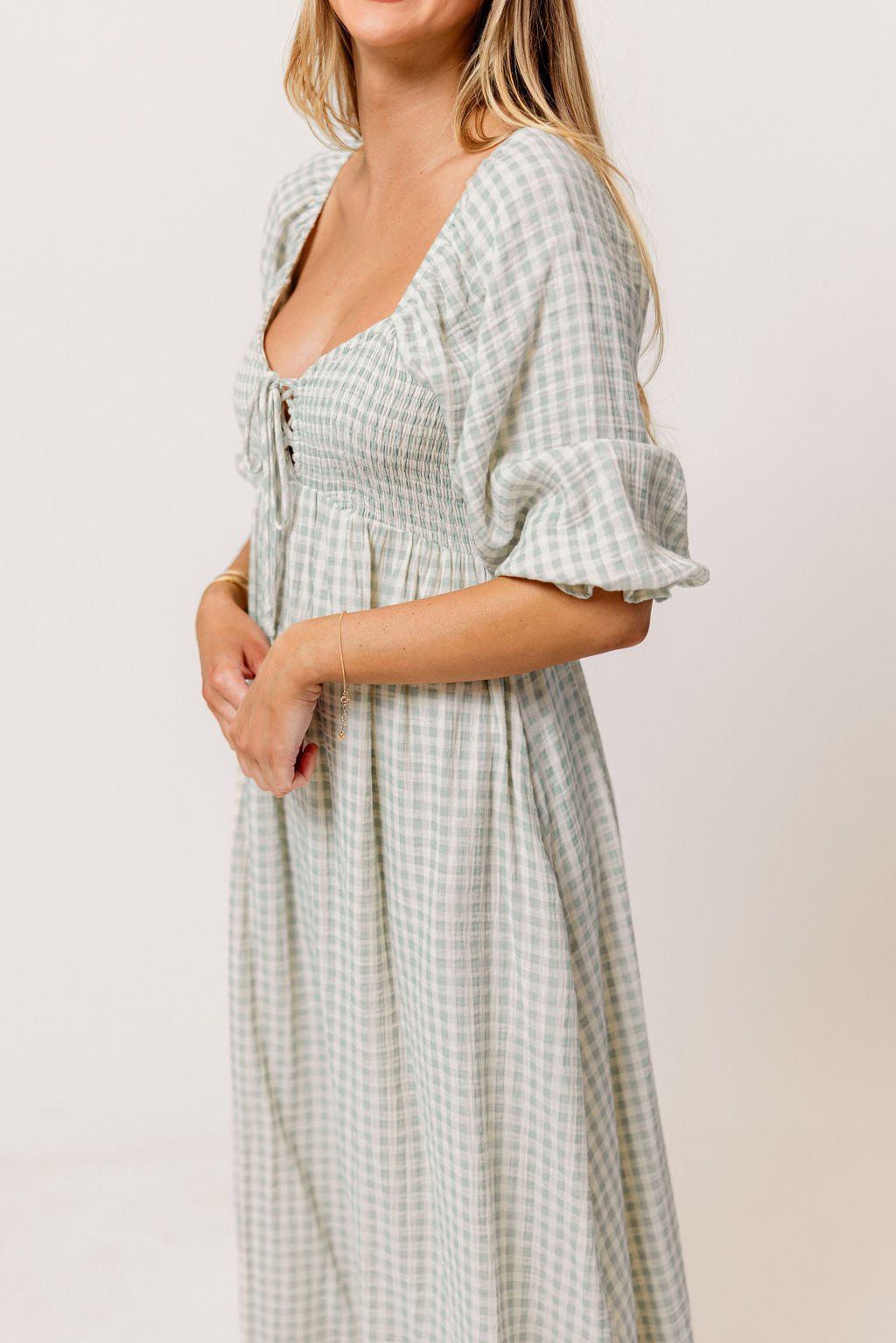 GARMENT DETAILS: Lightweight cotton maxi dress in a charming plaid print, with a sweetheart neckline, 3/4 length sleeves, and an adjustable front tie detail. Features a smocked bodice, side pockets, and ruffle accents. This colorway has a full lining.