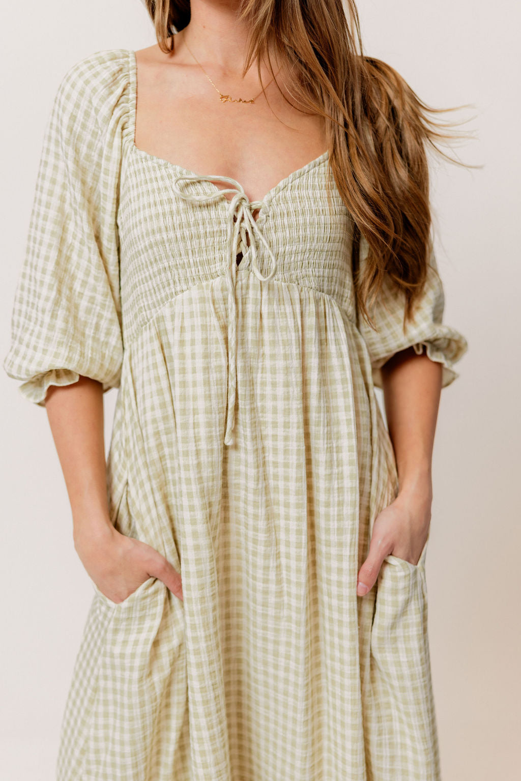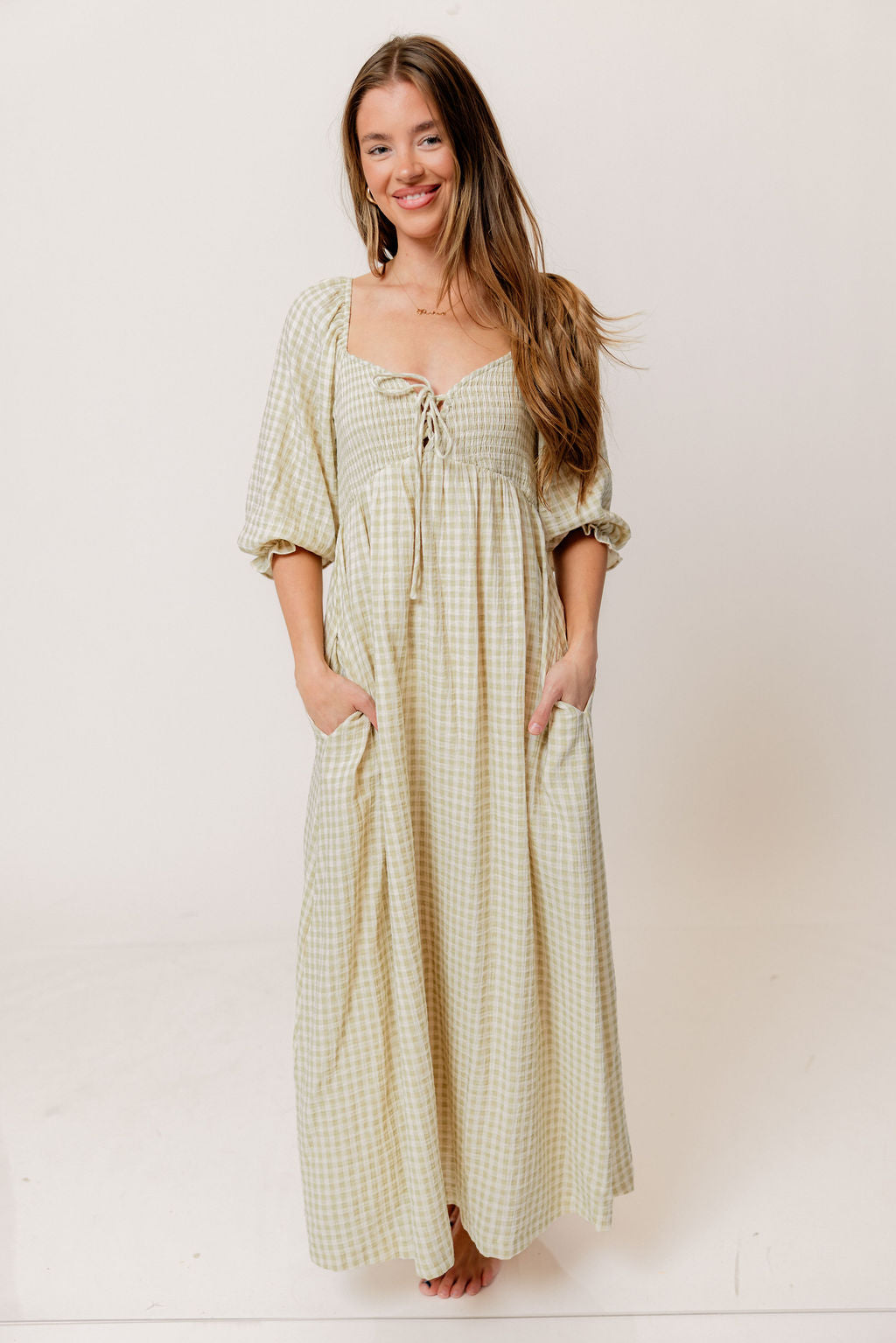 GARMENT DETAILS: Lightweight cotton maxi dress in a charming plaid print, with a sweetheart neckline, 3/4 length sleeves, and an adjustable front tie detail. Features a smocked bodice, side pockets, and ruffle accents. This colorway has a full lining.