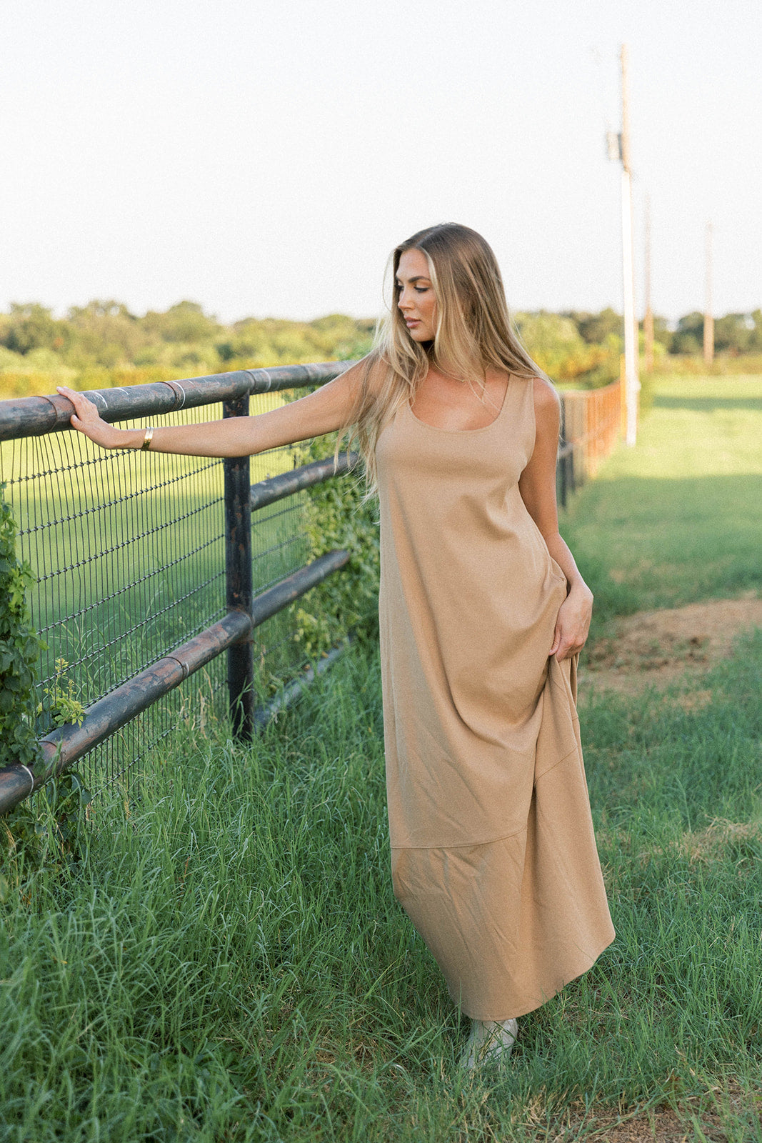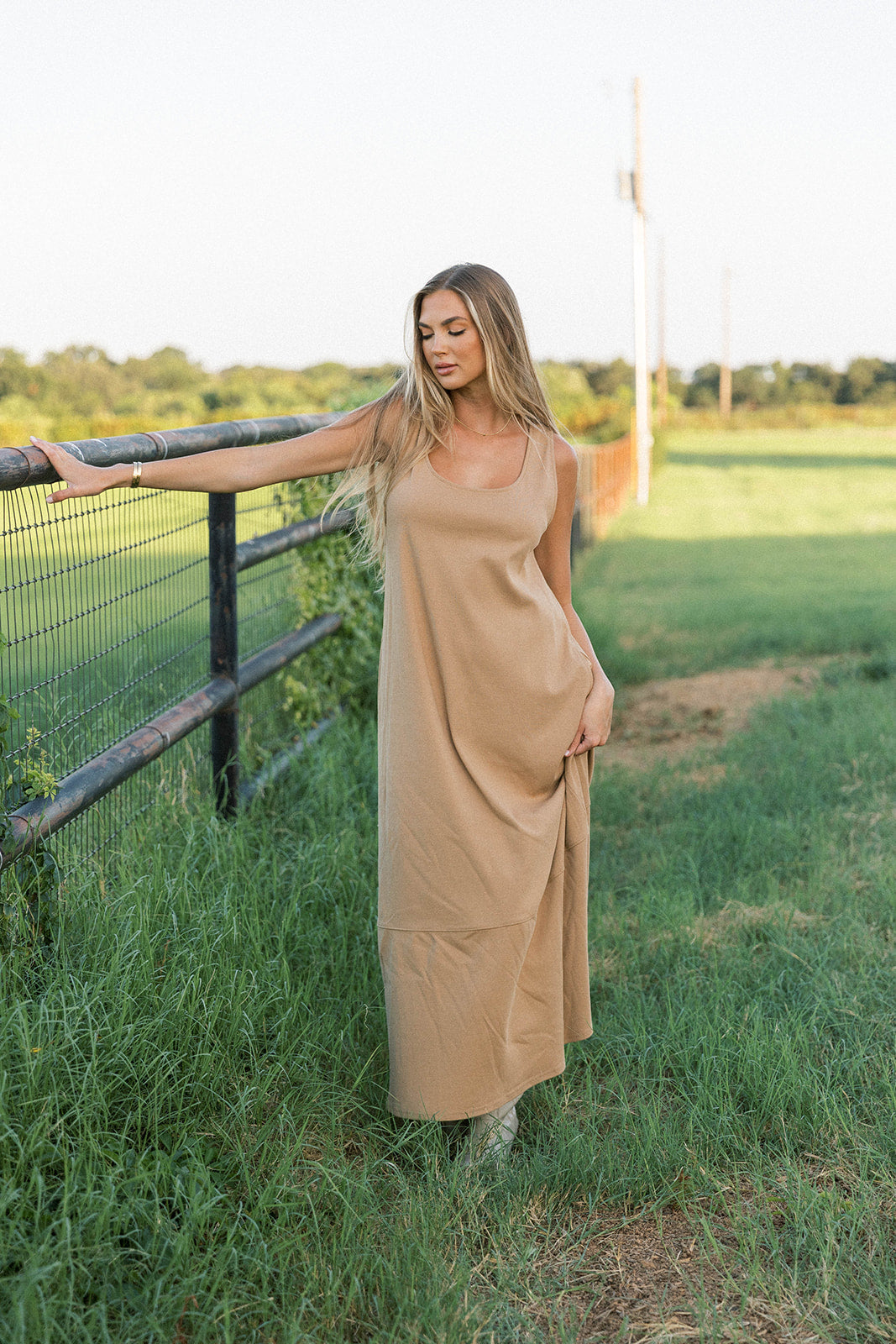 Taryn 100% Cotton Open Back Knit Maxi Dress in Camel