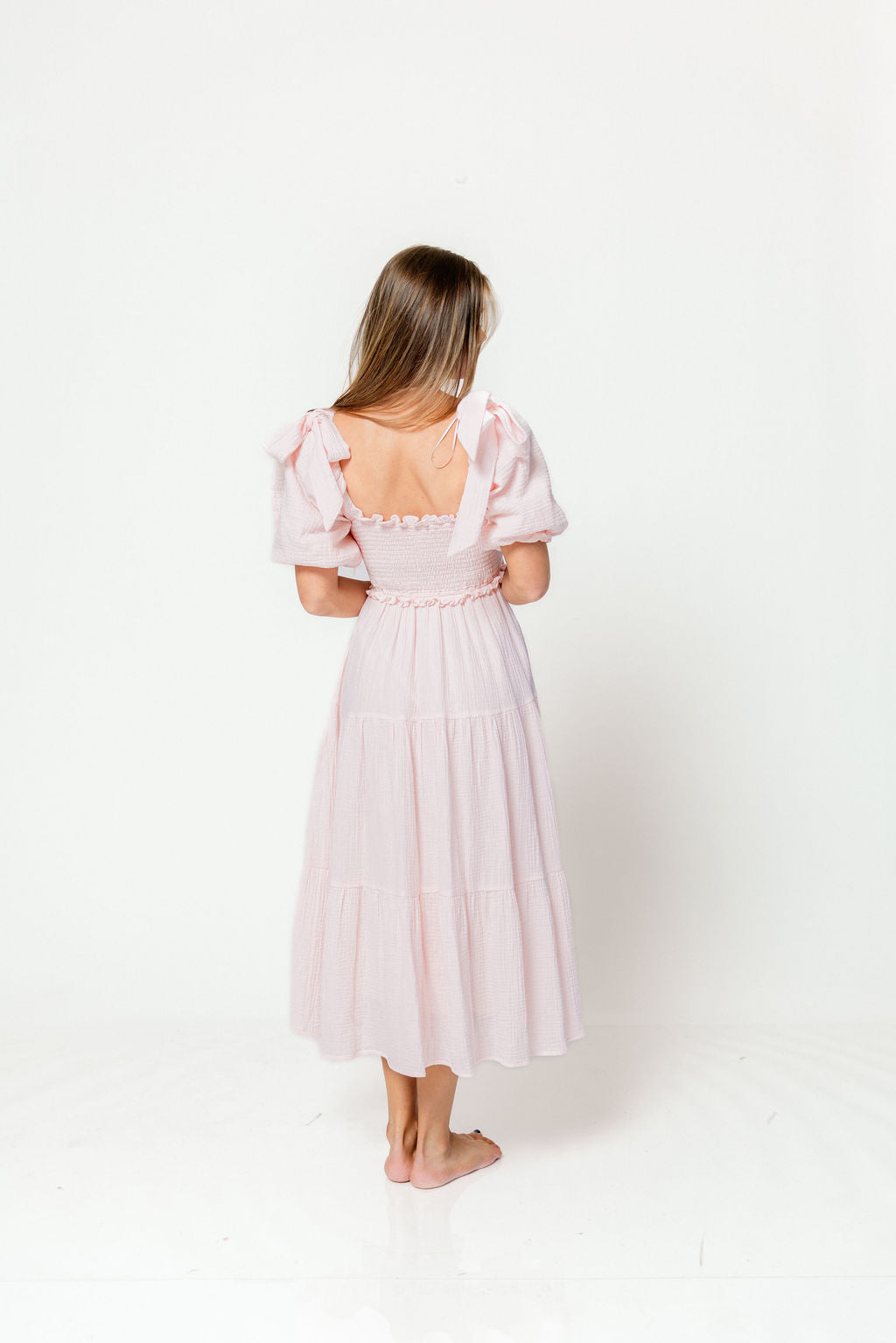 GARMENT DETAILS: Elegant midi dress with a square neckline, statement puffed sleeves, and bow accents on the shoulders. Features a fully smocked bodice, with a multi-tiered skirt.