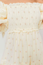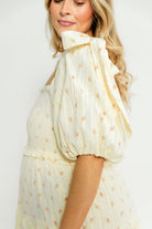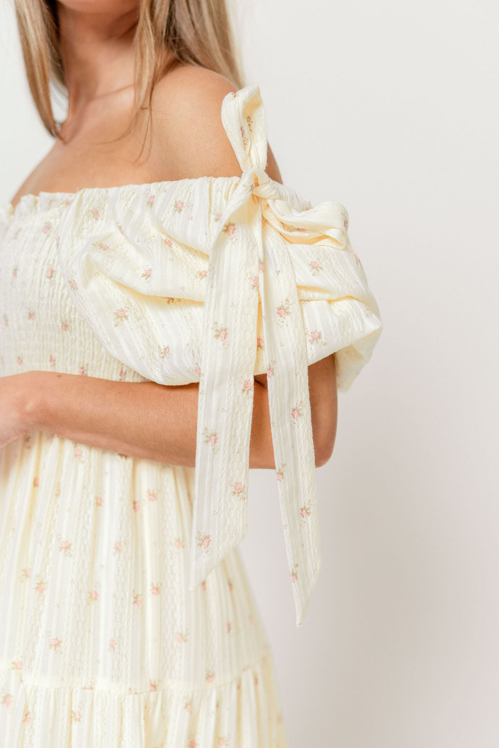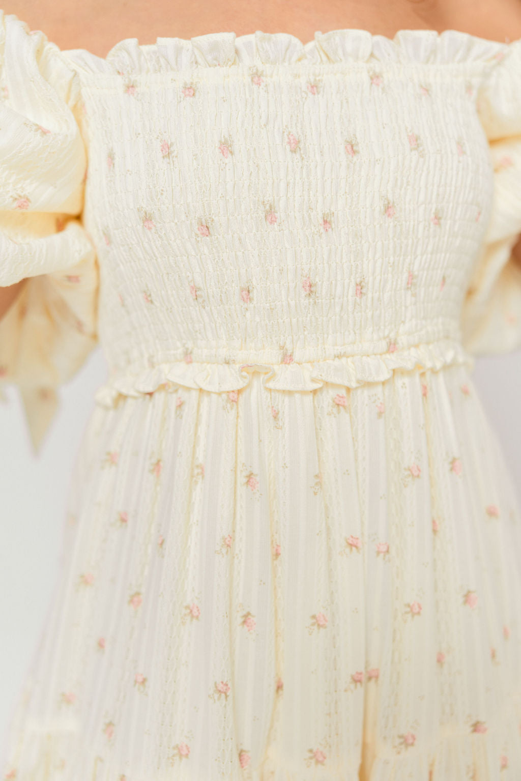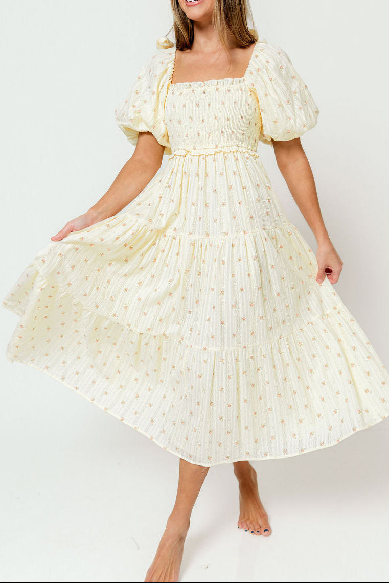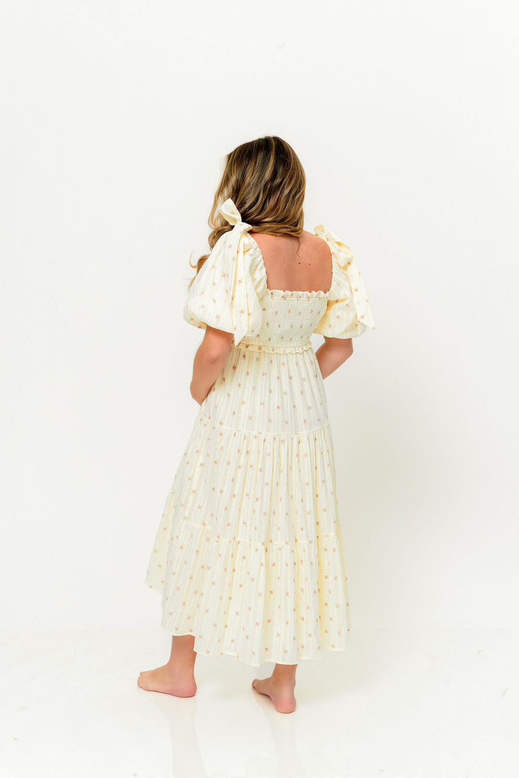 GARMENT DETAILS: Elegant midi dress with a square neckline, statement puffed sleeves, and bow accents on the shoulders. Features a fully smocked bodice, with a multi-tiered skirt.