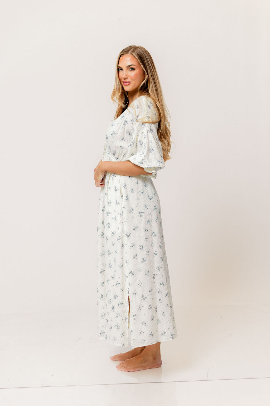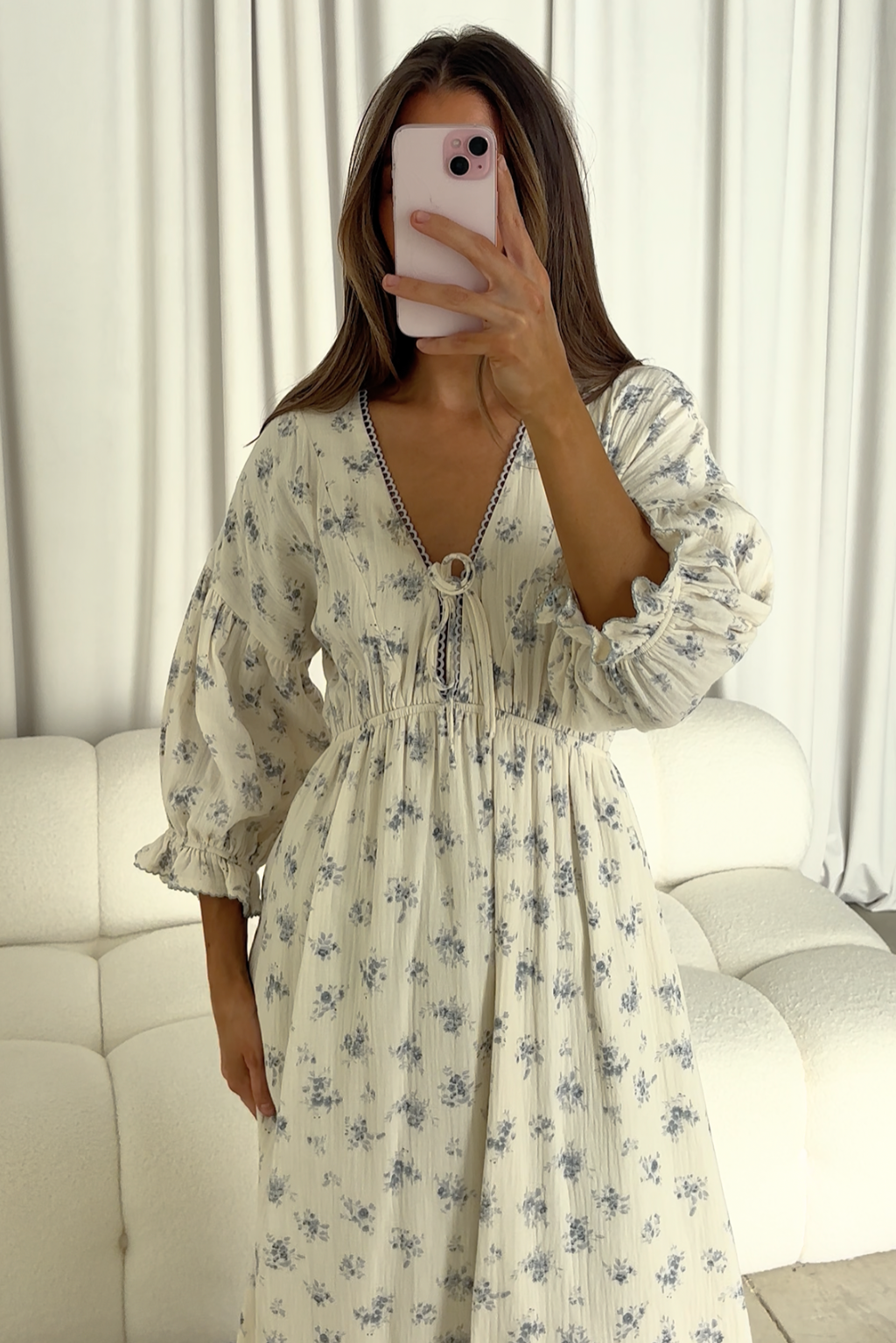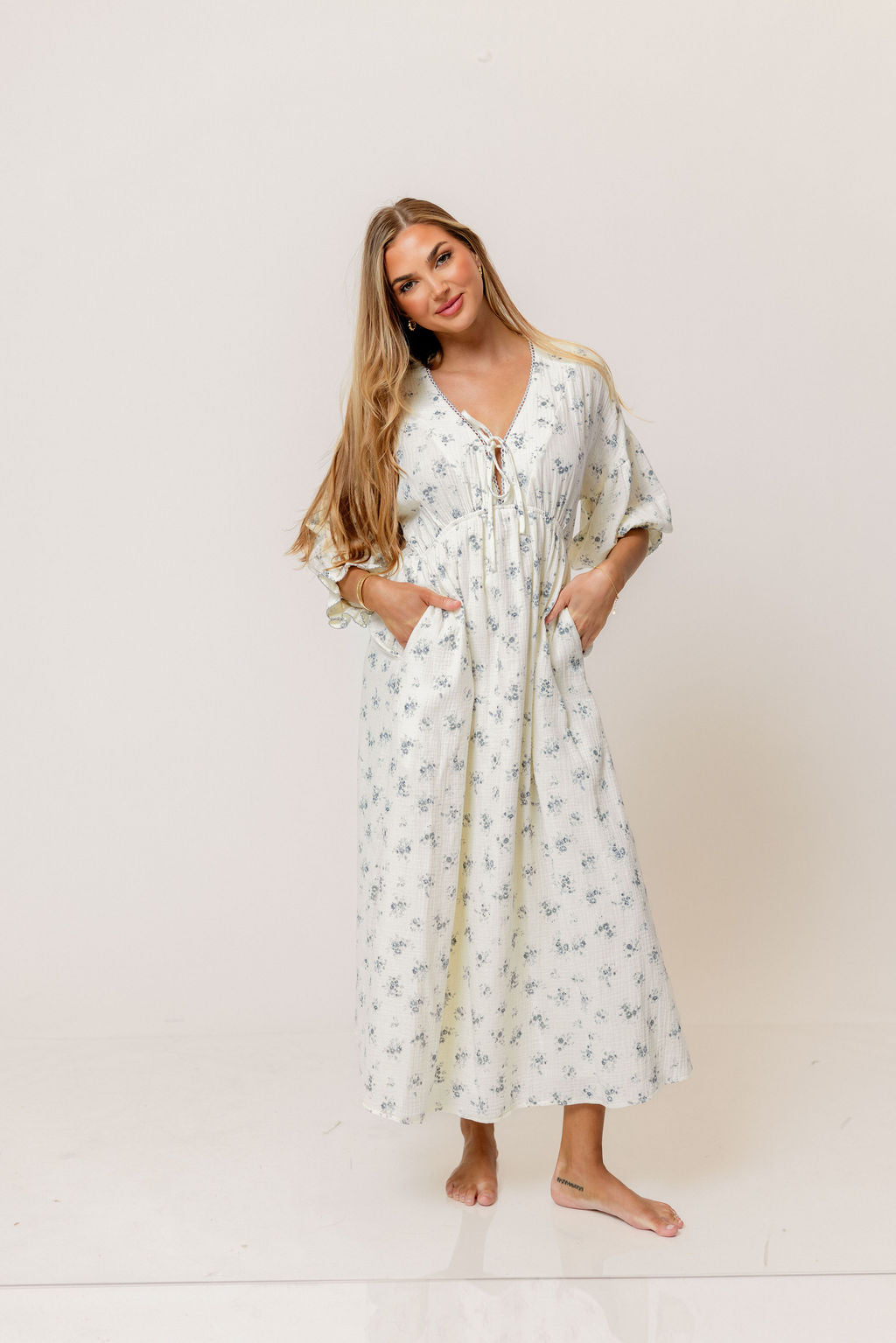 Hunter 100% Cotton Midi Dress with Trimming in Blue Floral - Bump Friendly