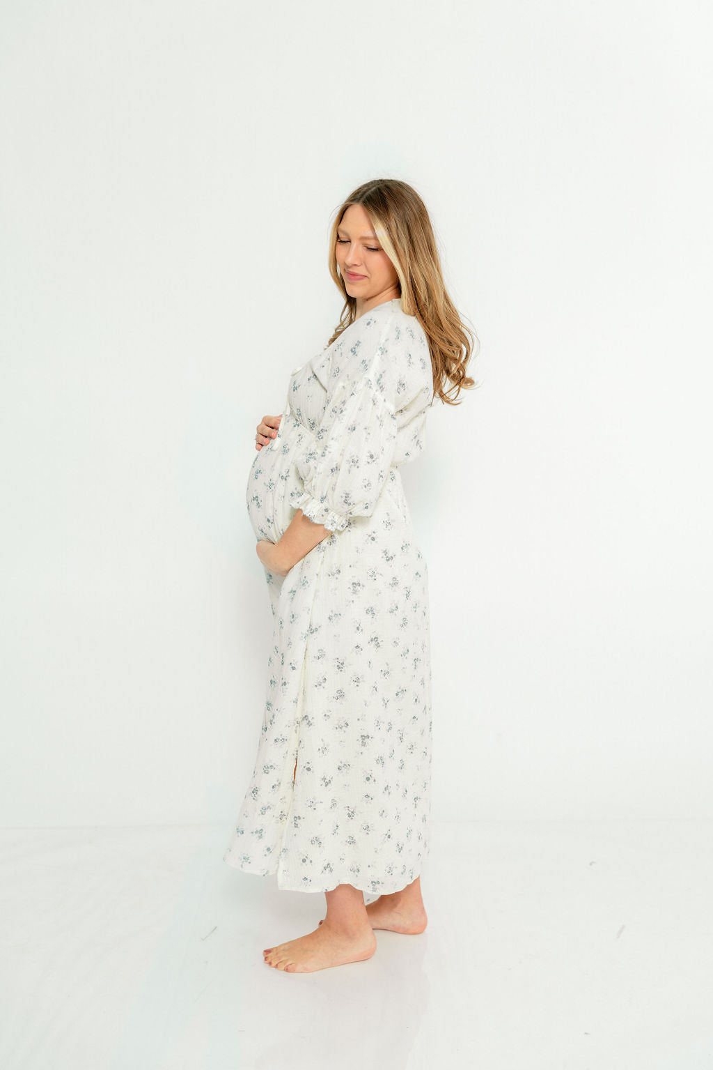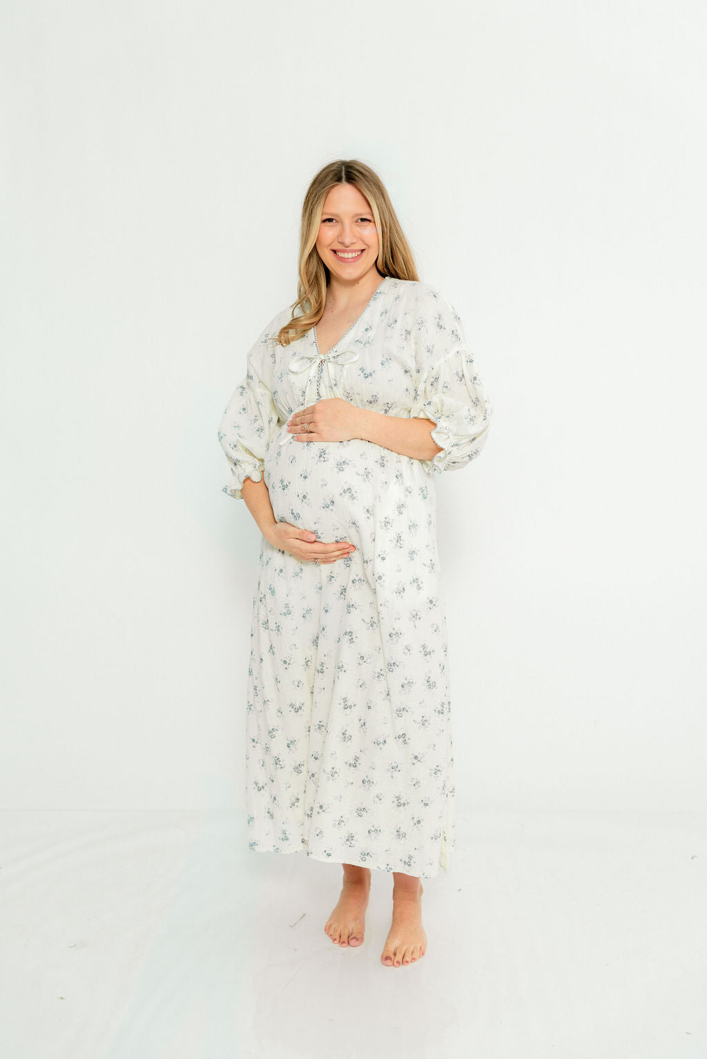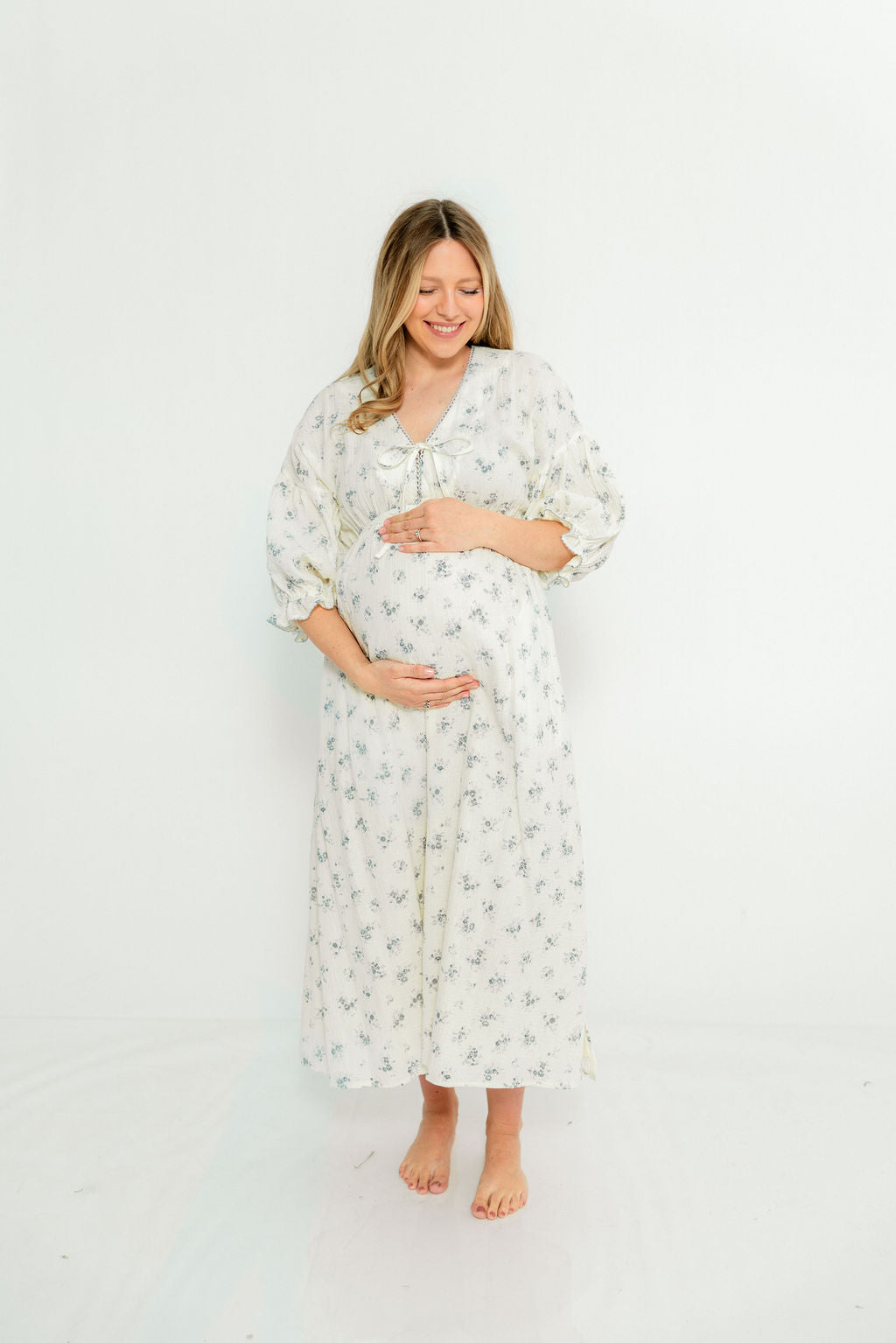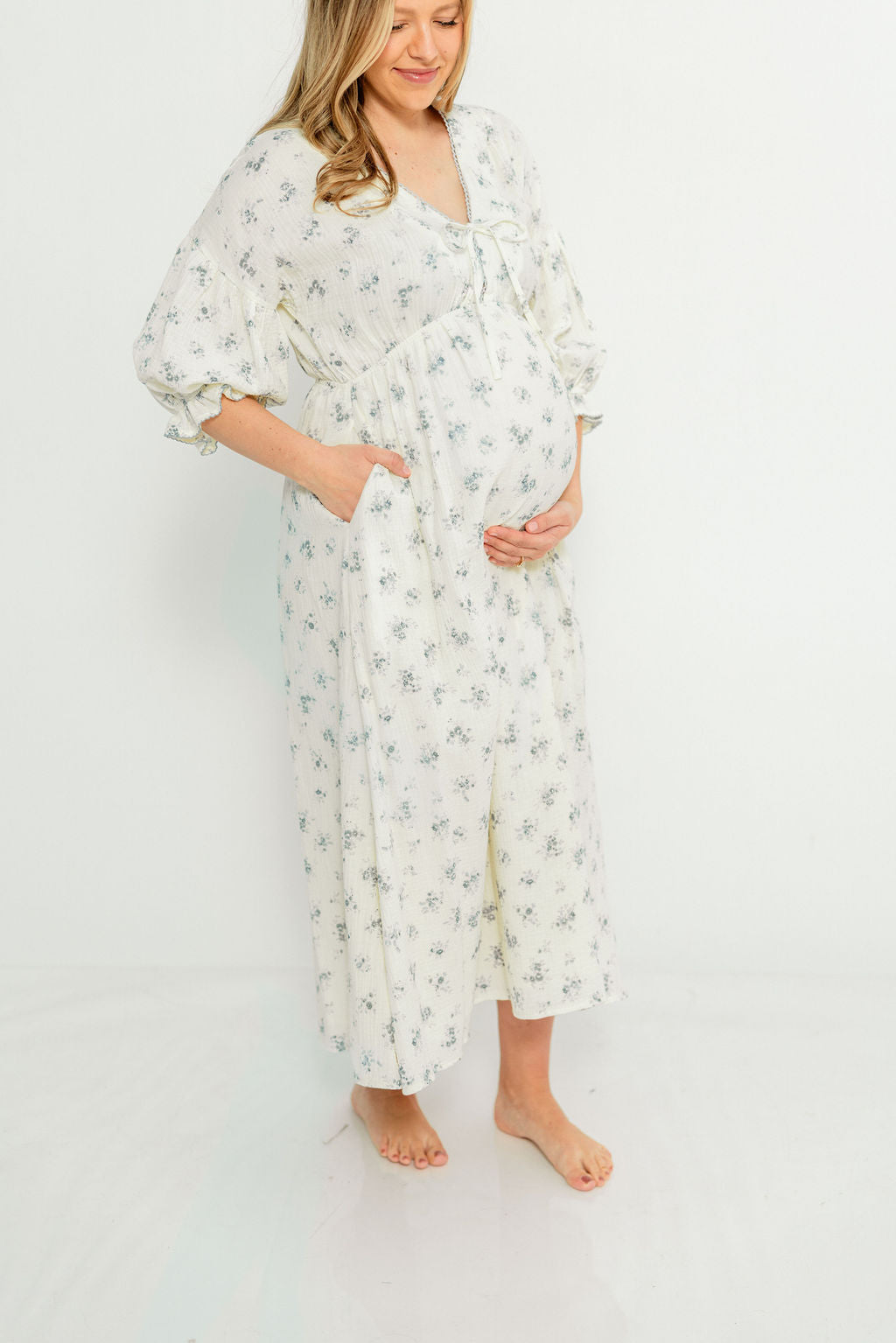 Hunter 100% Cotton Midi Dress with Trimming in Blue Floral - Bump Friendly