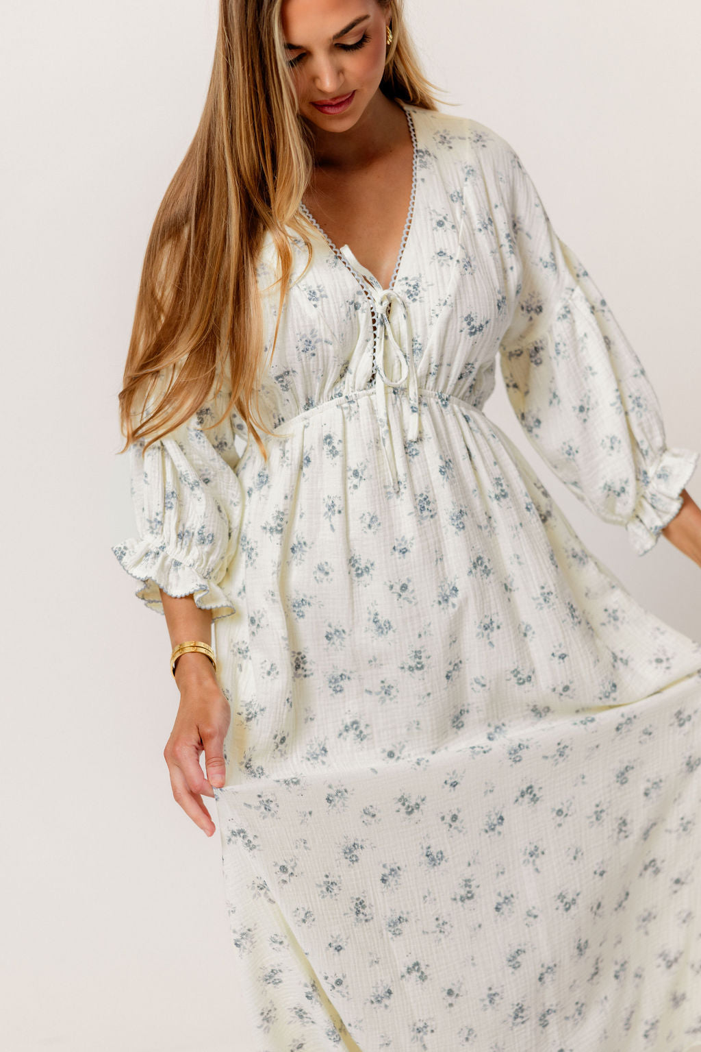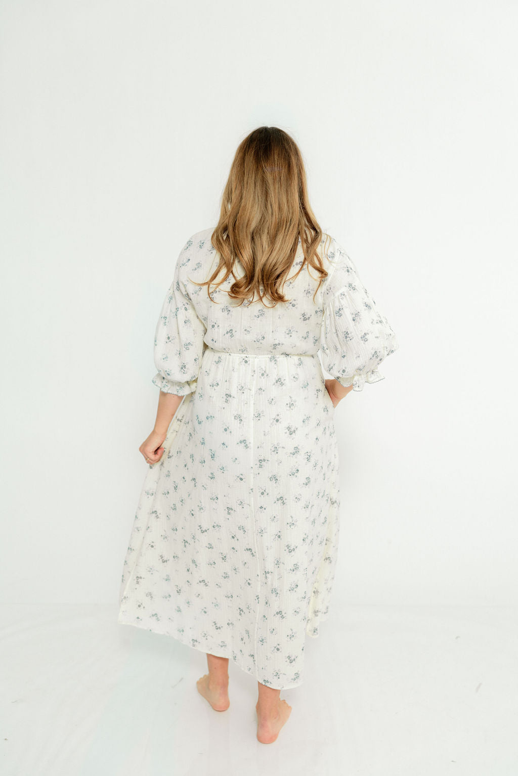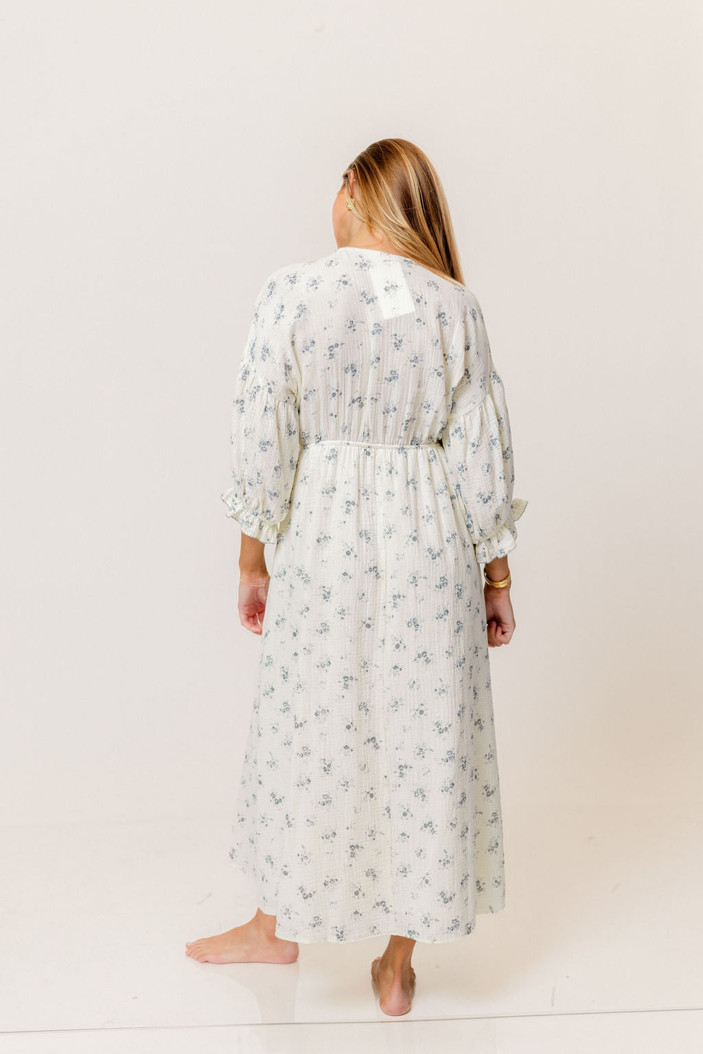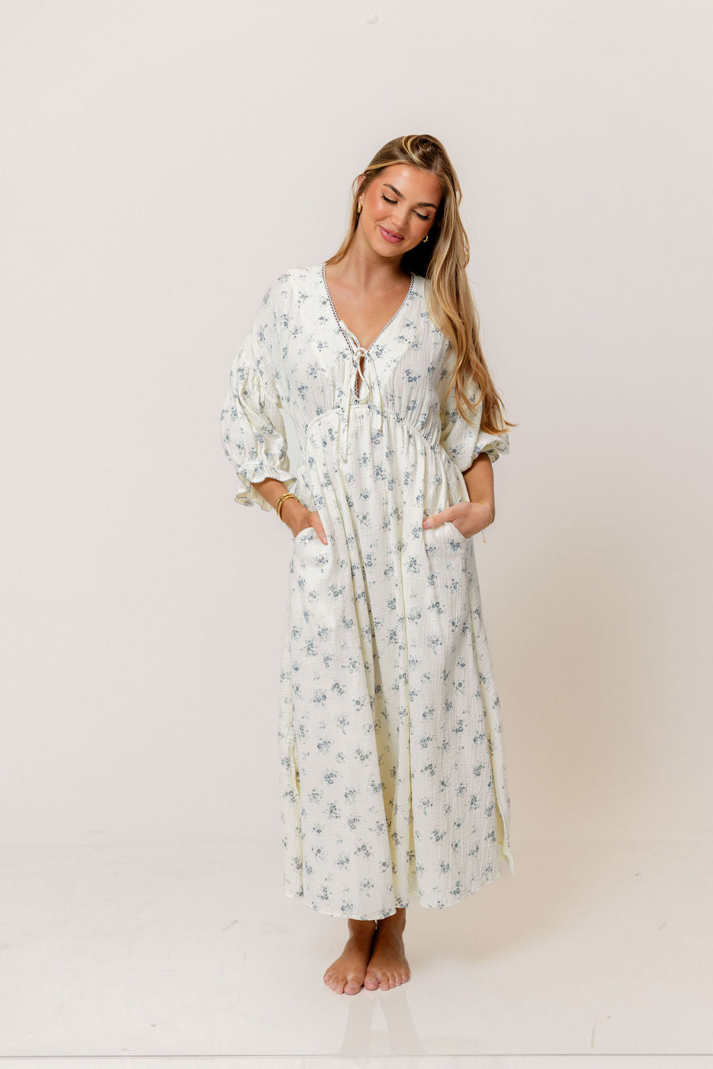 GARMENT DETAILS: Lightweight cotton gauze midi dress. Features V-neckline with self-tie detail, inverted empire waist, and full skirt with in-seam pockets. Finished with long balloon sleeves.
