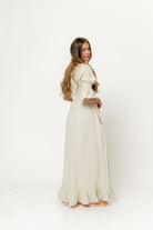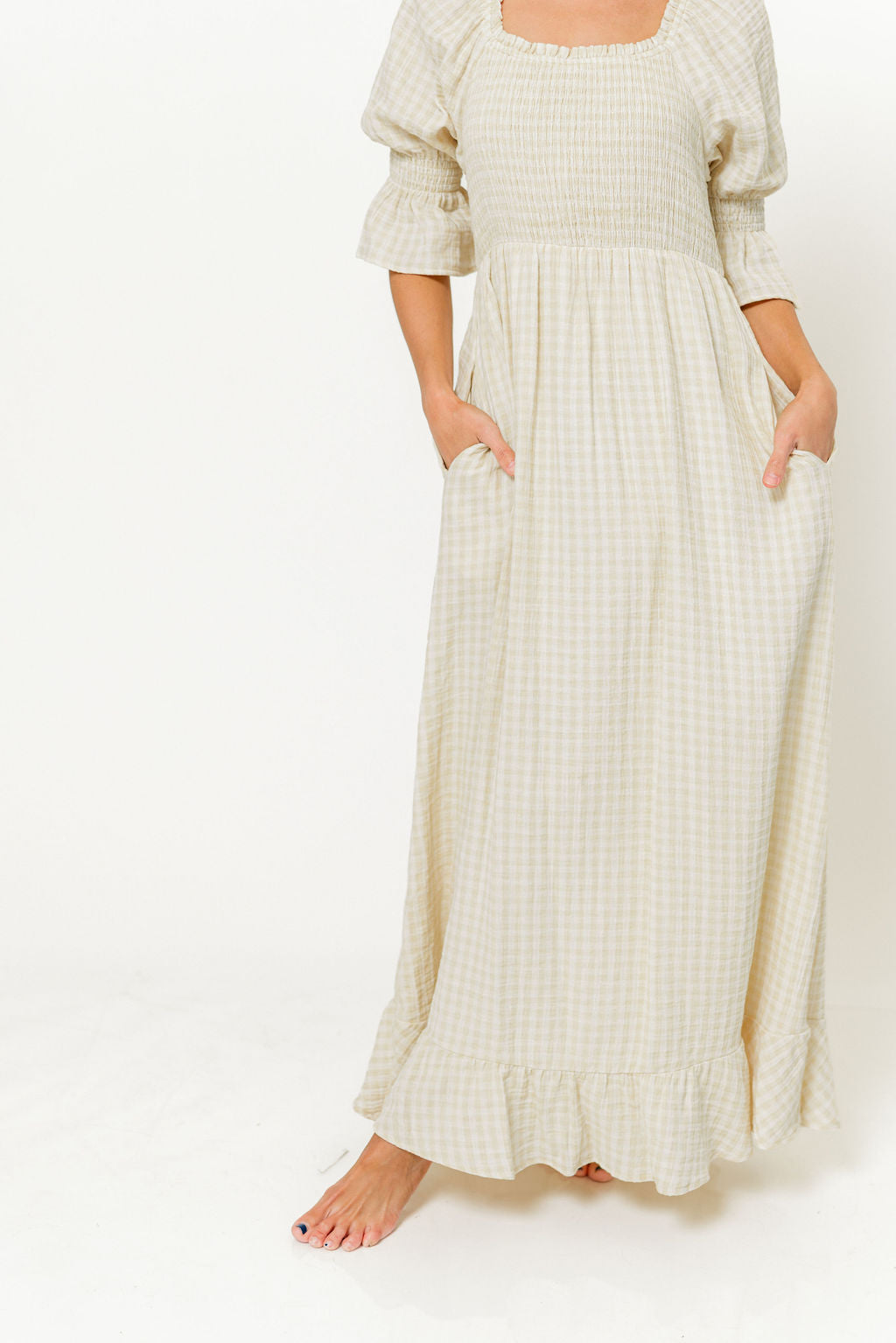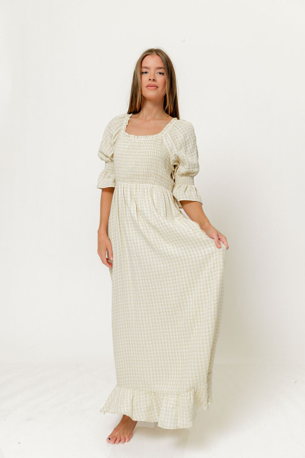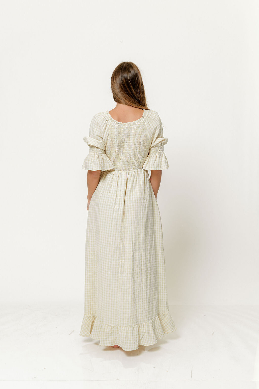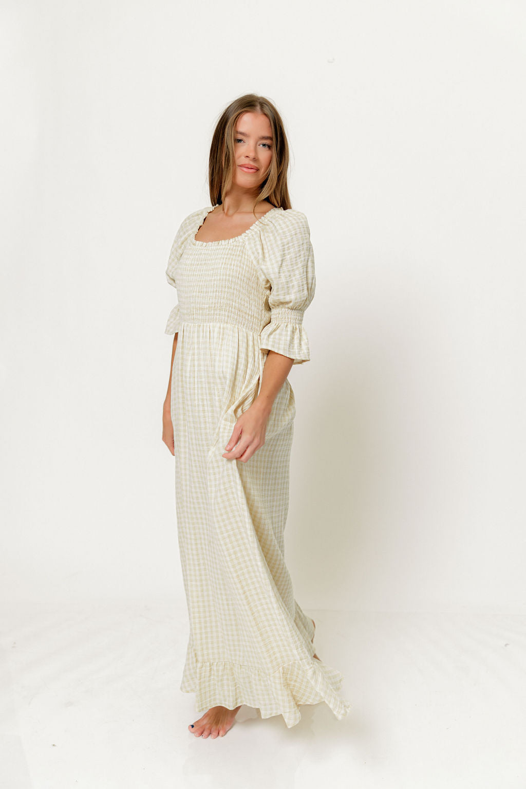 Sienna 100% Cotton Puff Sleeve Maxi Dress in Custard Plaid (Lined) - Bump Friendly