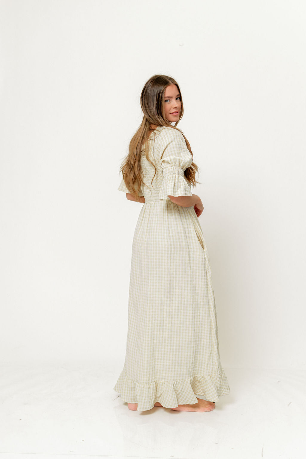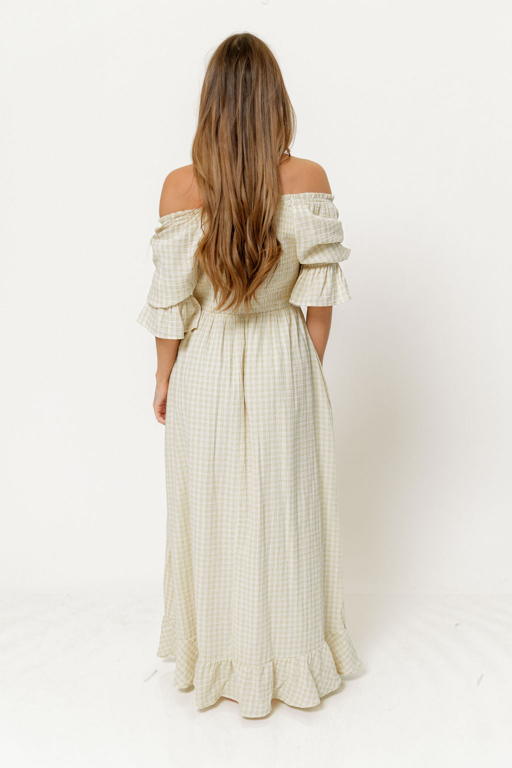GARMENT DETAILS: Elegant, lightweight maxi dress in a darling plaid print, with stretchy neckline that can be worn on or off the shoulder. Features 3/4 length puffed sleeves with ruffle, and a stretchy, smocked bodice. Finished with a flowy, flattering skirt and ruffled hem. This colorway is fully lined.