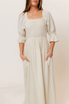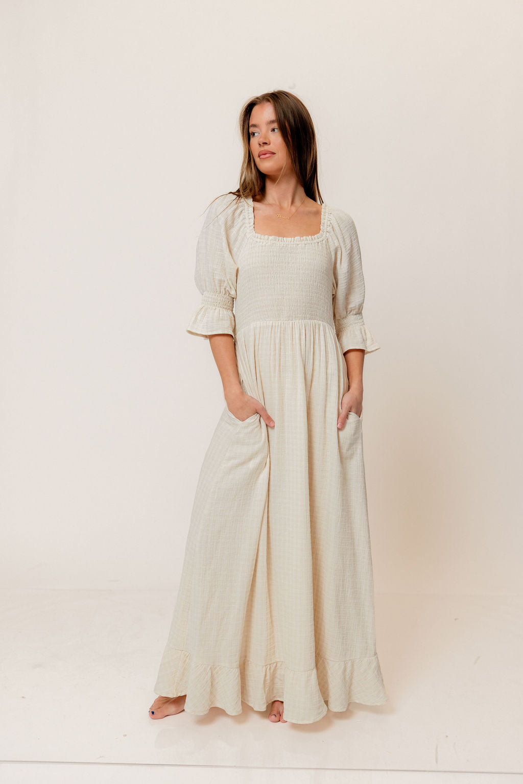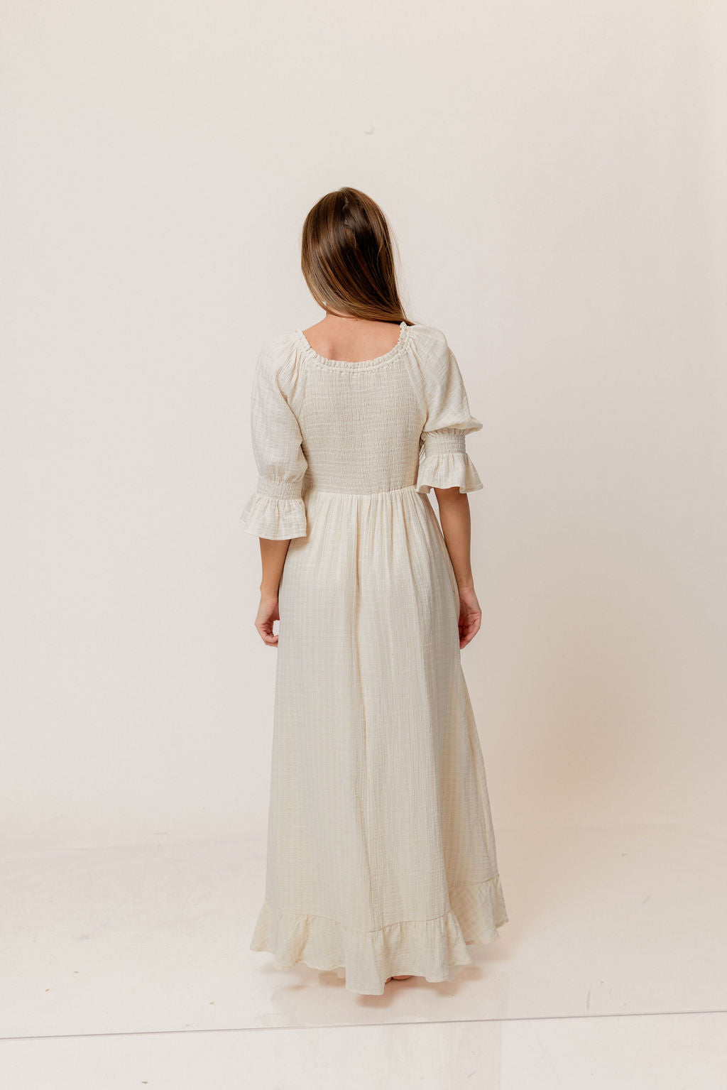Sienna 100% Cotton Puff Sleeve Maxi Dress in Mute Pale Pink Plaid (Lined) - Bump Friendly