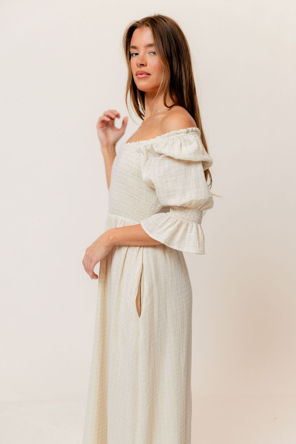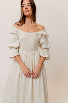 GARMENT DETAILS: Elegant, lightweight maxi dress in a darling plaid print, with stretchy neckline that can be worn on or off the shoulder. Features 3/4 length puffed sleeves with ruffle, and a stretchy, smocked bodice. This colorway features a full lining.