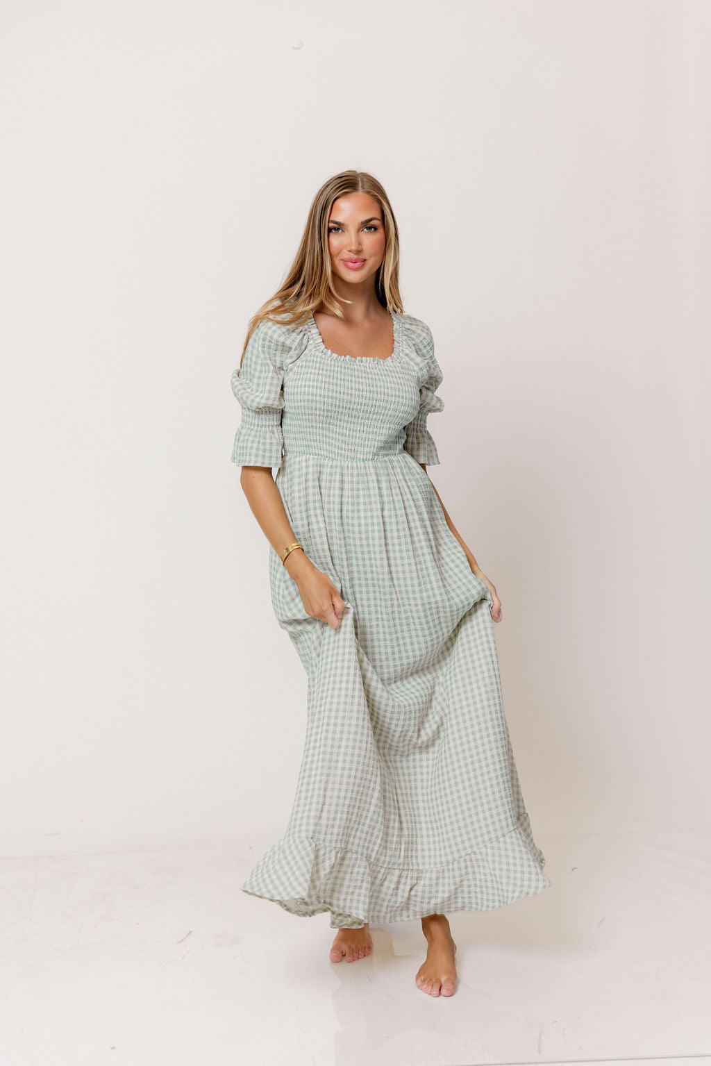 GARMENT DETAILS: Elegant, lightweight maxi dress in a darling gingham plaid print, with stretchy neckline that can be worn on or off the shoulder. Features 3/4 length puffed sleeves with ruffle, and a stretchy, smocked bodice. This colorway features a full lining.