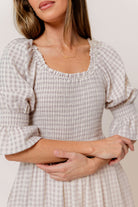 GARMENT DETAILS: Elegant, lightweight maxi dress in a darling gingham plaid print, with stretchy neckline that can be worn on or off the shoulder. Features 3/4 length puffed sleeves with ruffle, and a stretchy, smocked bodice. This colorway features a full lining.