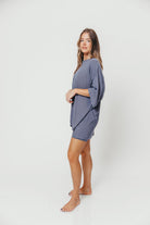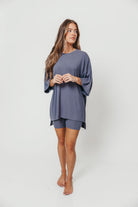 GARMENT DETAILS: Lounge set in a soft, ribbed material. Top features a crewneck, relaxed fit, and short sleeves, with asymmetrical hem. Shorts feature an elasticized, wide waistband in a biker-short length.