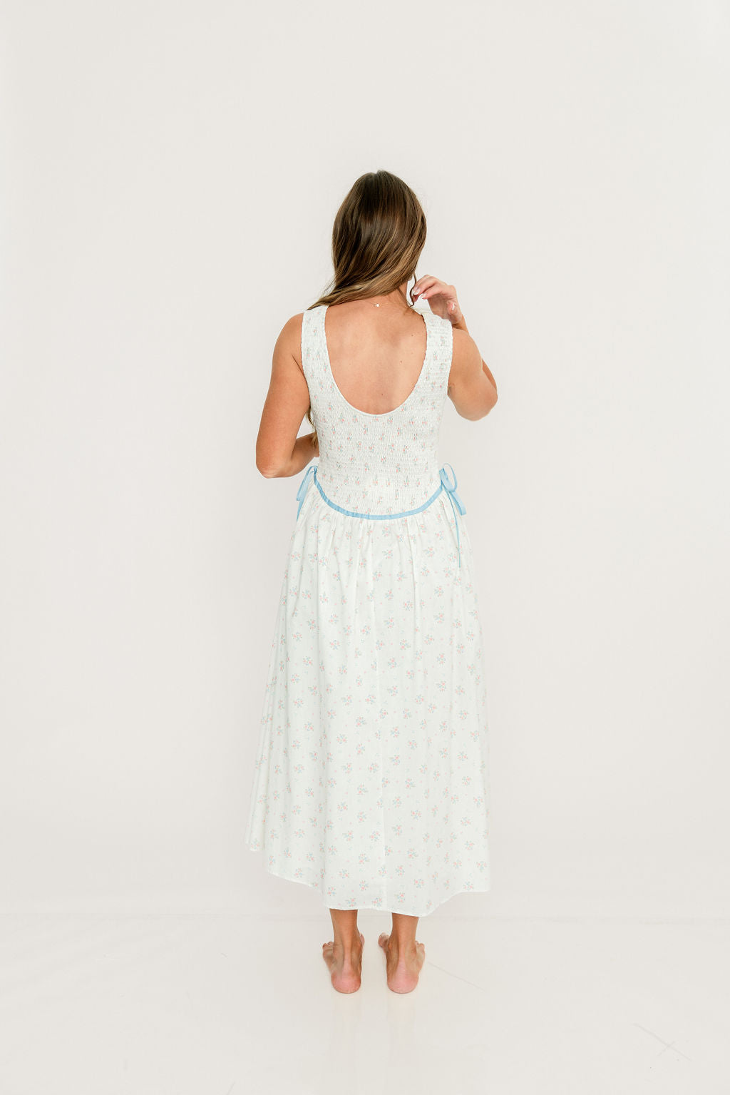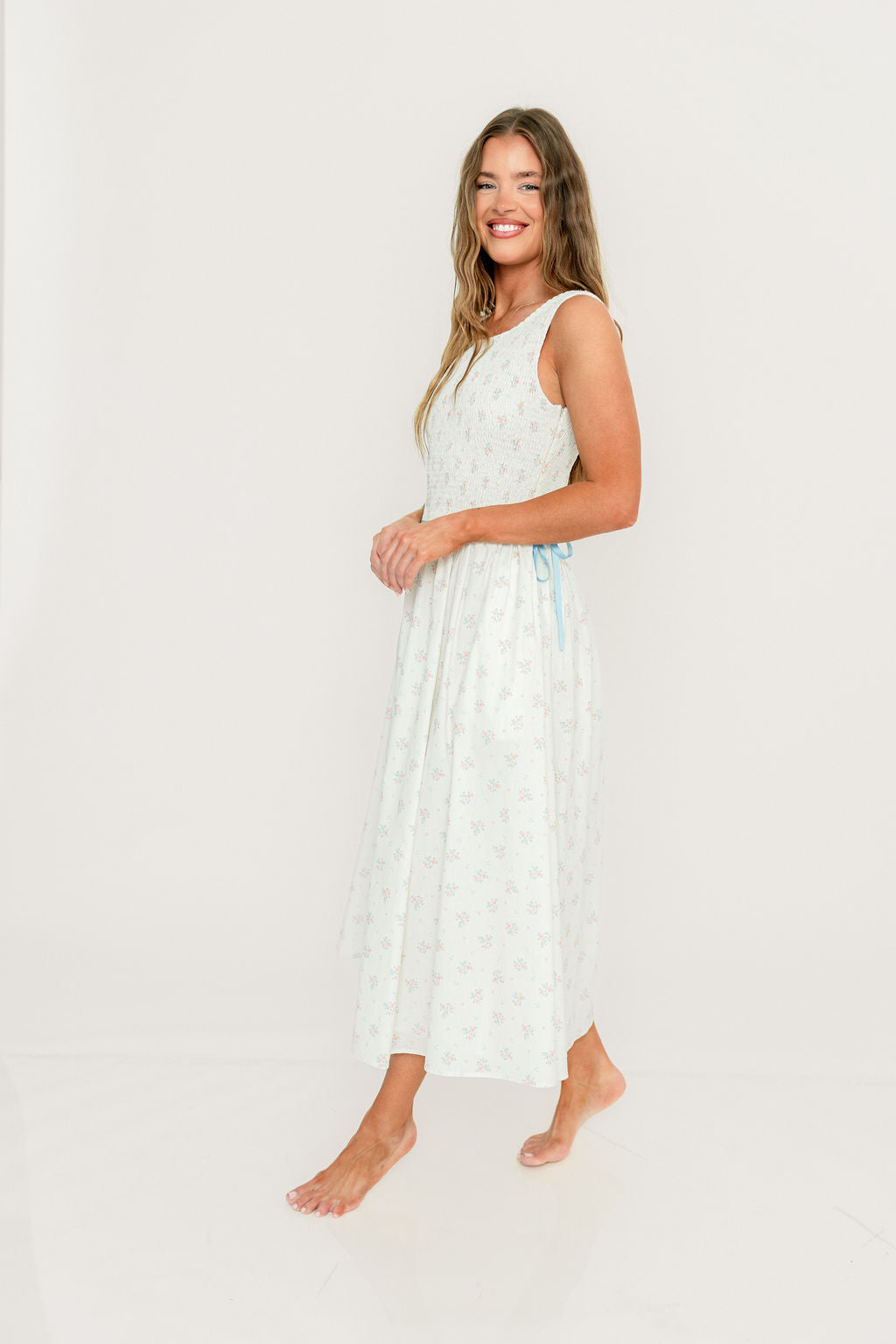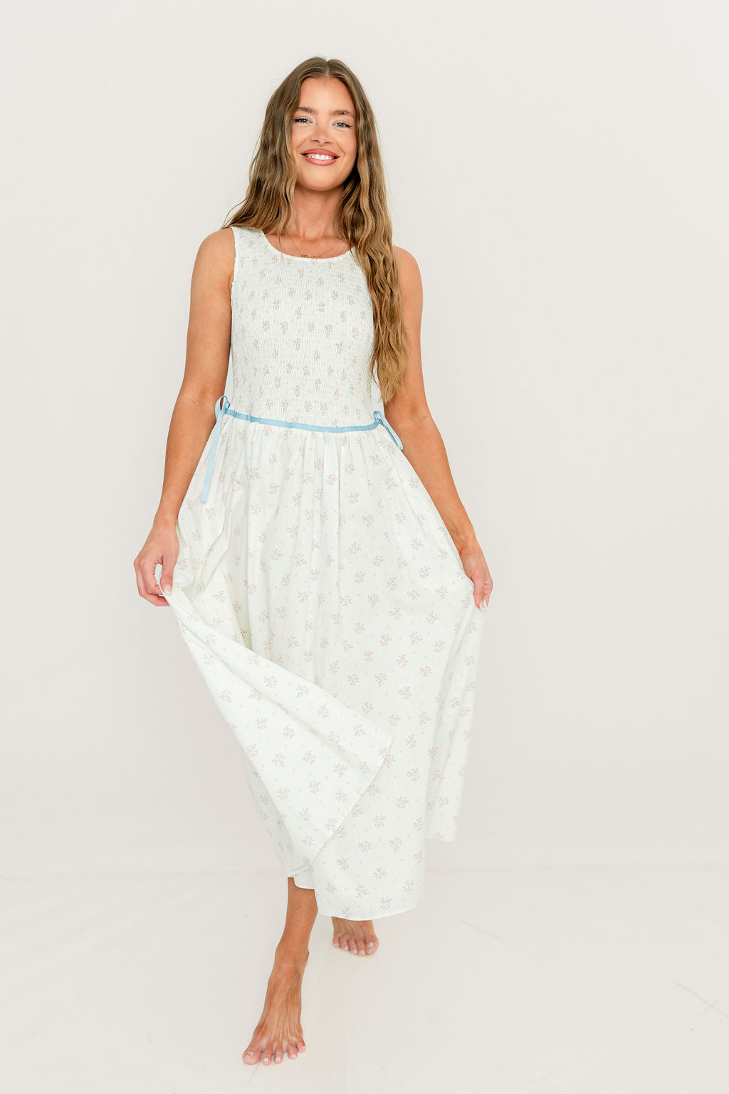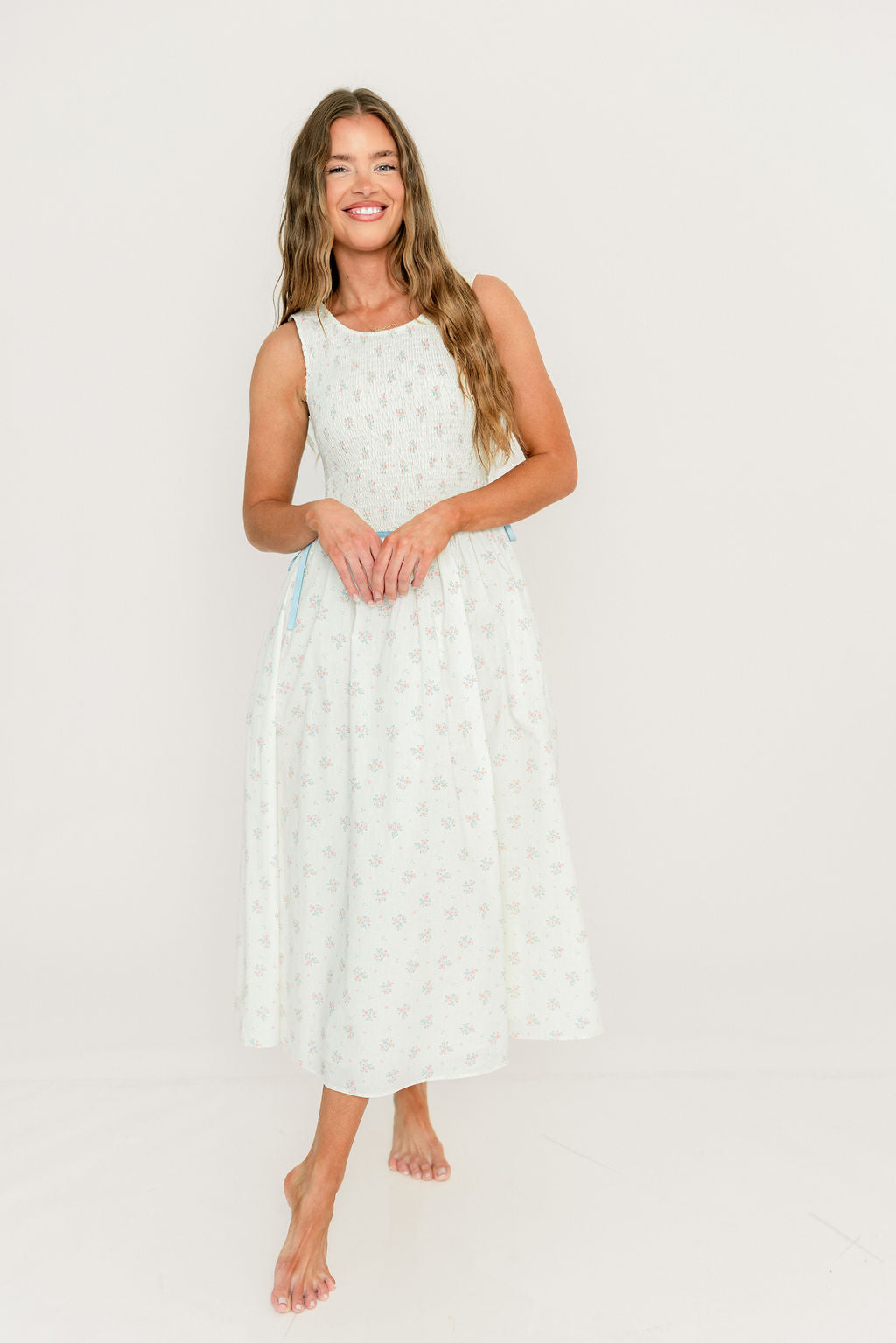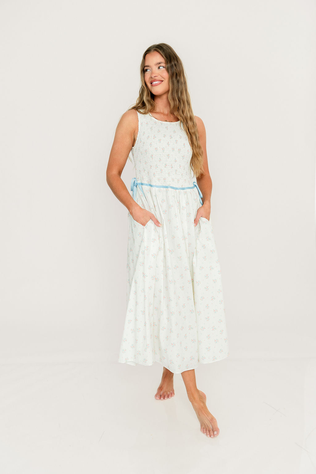 GARMENT DETAILS: Cotton midi dress in a ditsy floral print. Bodice features sleeveless design, rounded neckline, and fully smocked construction for maximum comfort. Features a contrast color ribbon waist accent, with a flowy, feminine skirt and side pockets. Lined.