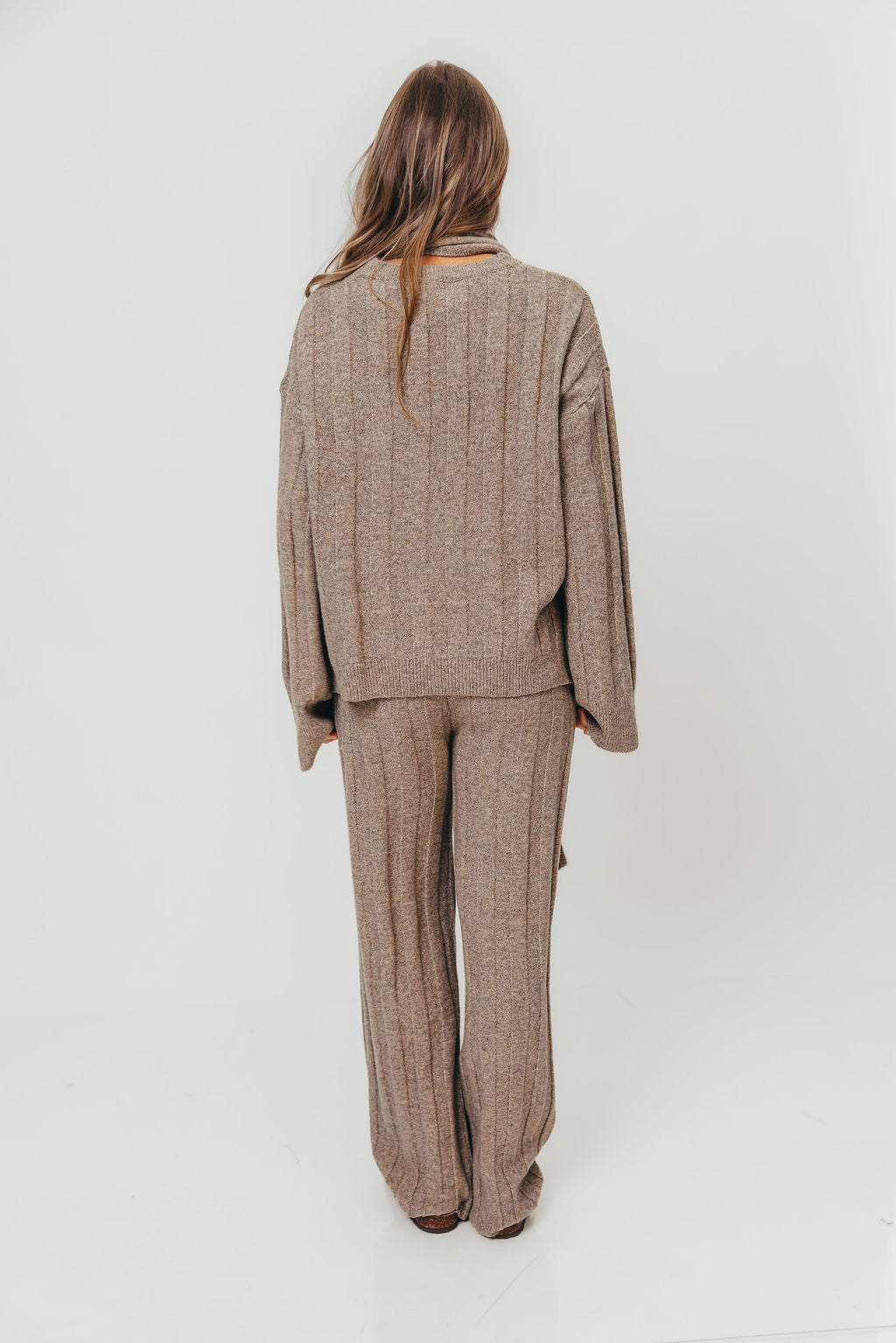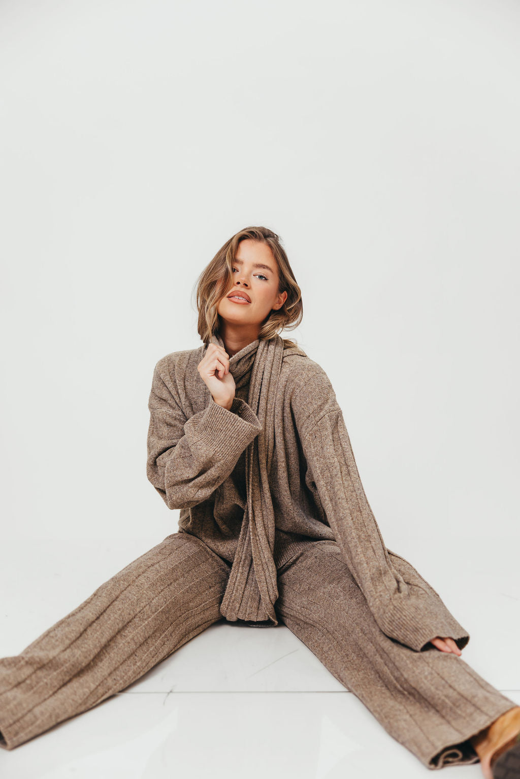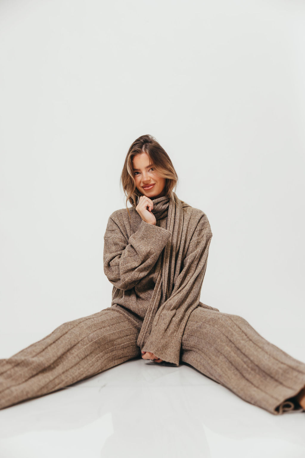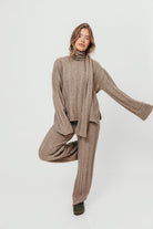GARMENT DETAILS: Thick knit three-piece set. Top features a relaxed, slouchy fit with long sleeves; pants have an elasticated waistband and straight, wide-leg silhouette. Includes a matching ribbed scarf.