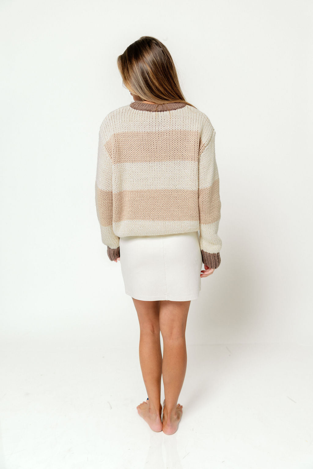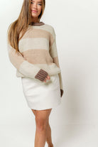 GARMENT DETAILS: Comfortable chunky knit sweater with rounded neckline, dropped shoulders, and striped pattern with contrast color trim.
