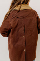 GARMENT DETAILS: Cotton-blend barn jacket with faux pocket flaps, corduroy spread collar, and metal snap buttons. Features tartan lining and split vent flaps with snap button closure at the back, with zippered side pockets.