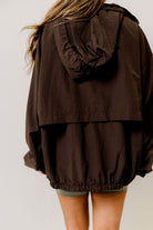 GARMENT DETAILS: Lightweight nylon jacket with zipper front closure, collared neckline, and attached hoodie. Features a gathered waist and sleeve cuffs.
