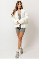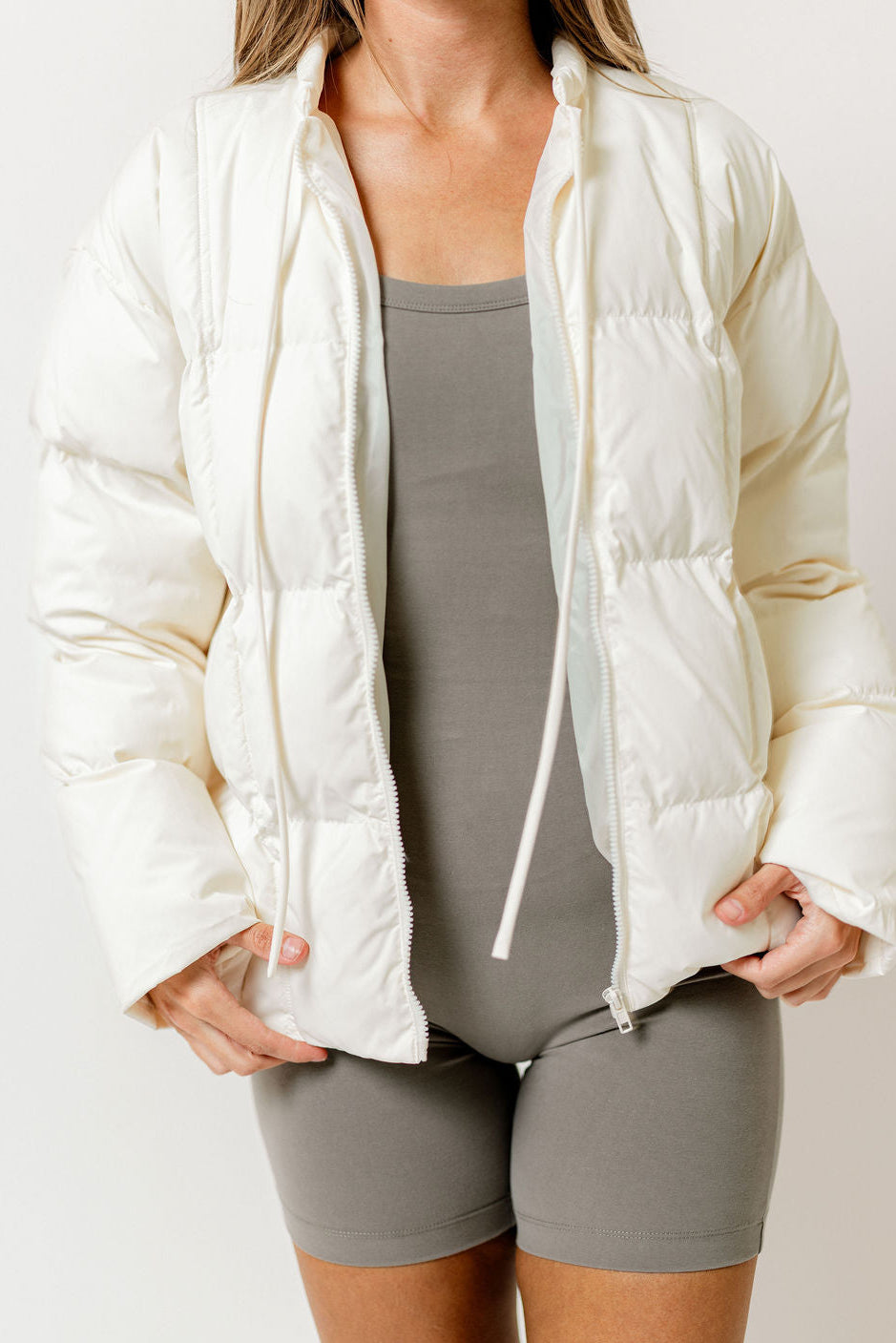 GARMENT DETAILS: Lightweight, fully-lined puffer jacket with quilted padding, two-way front zip, and crewneck with tie detail. Features a soft, oversized fit.