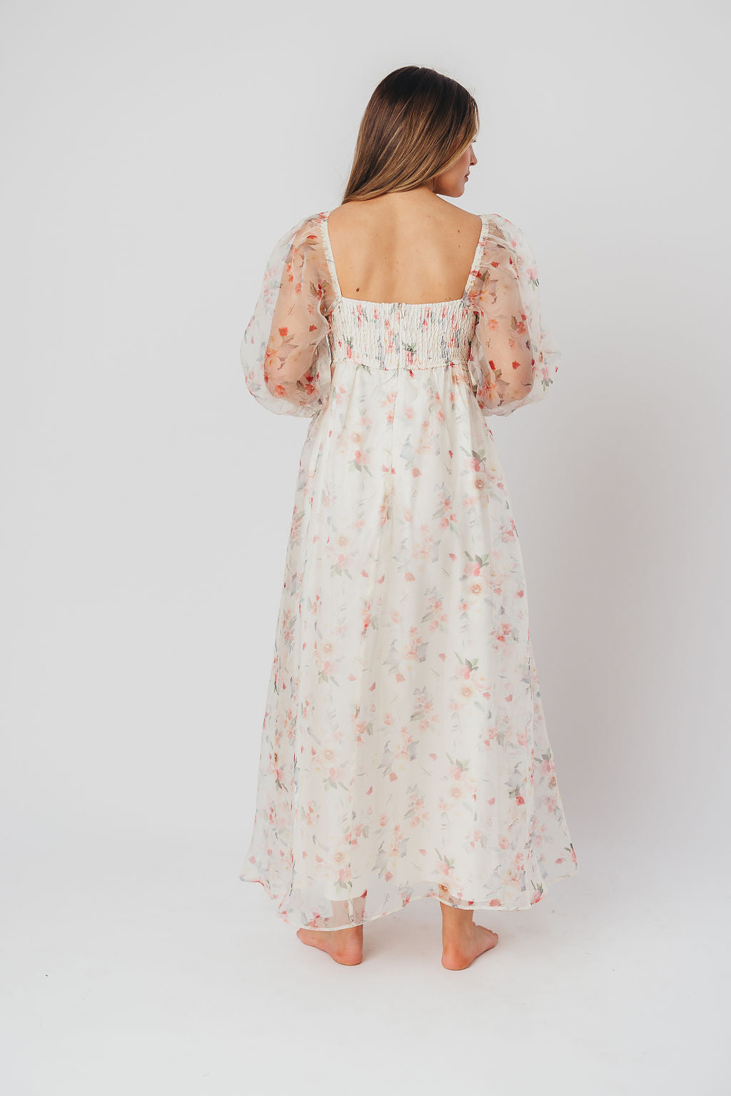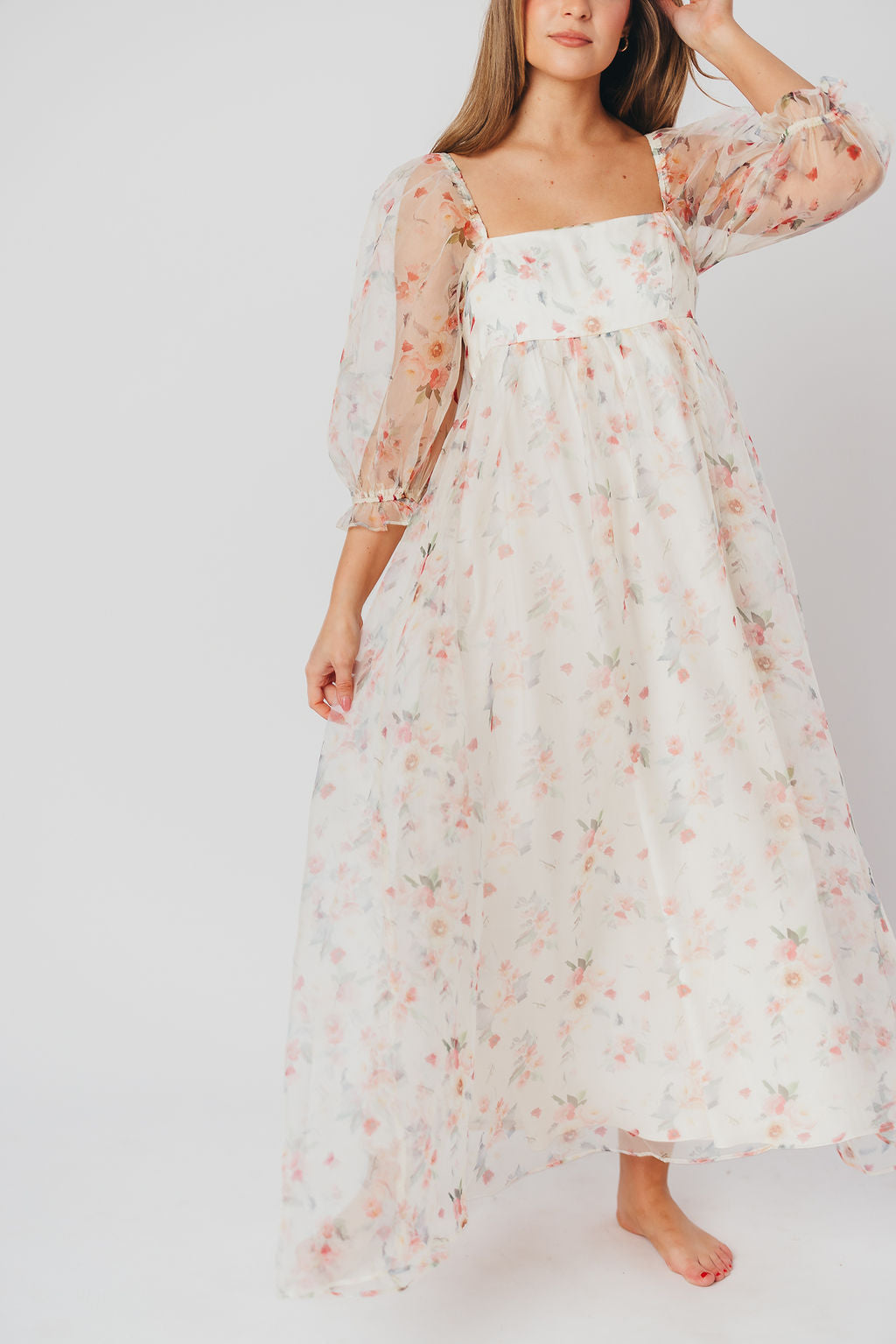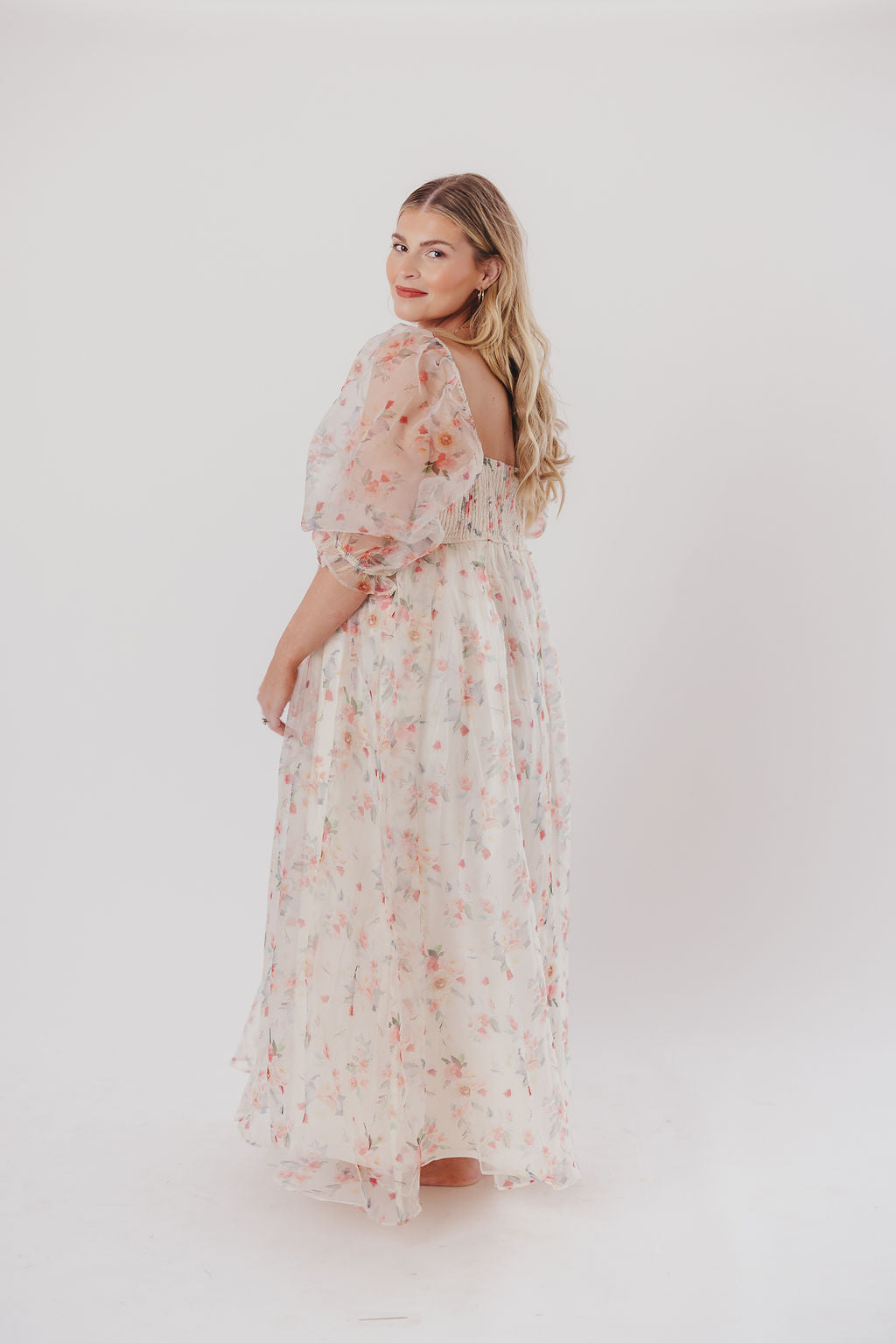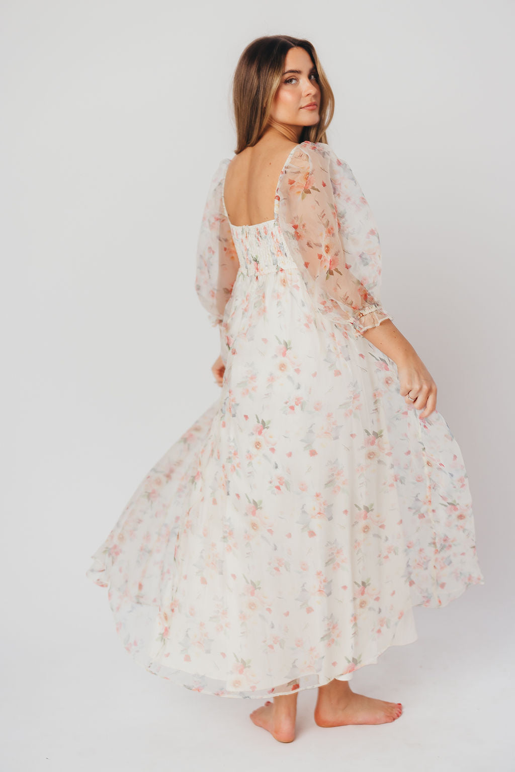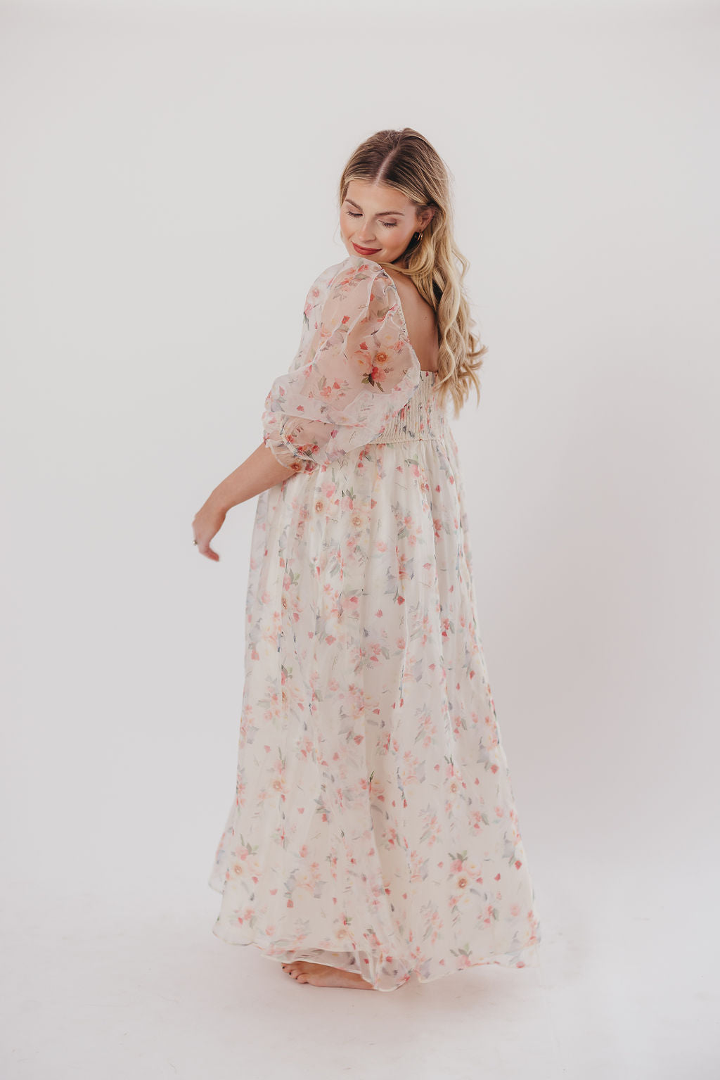 GARMENT DETAILS: Empire-waisted maxi dress in a pastel floral pattern. Features square neckline, sheer 3/4 puffed sleeves, and bust darts, with a stretchy, smocked back panel. Lined.