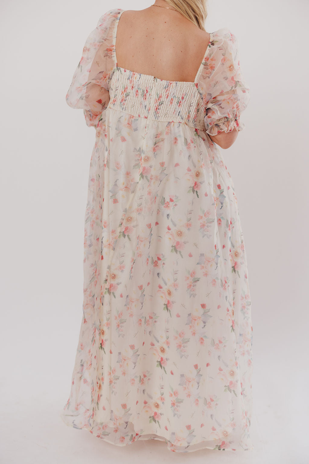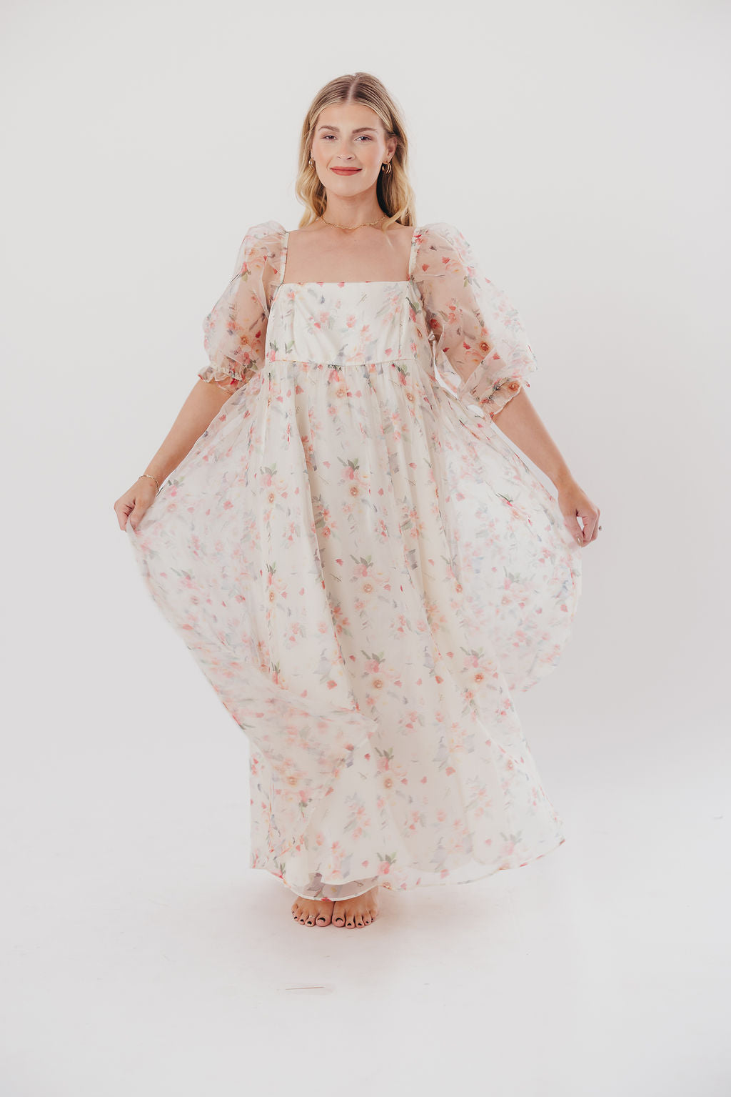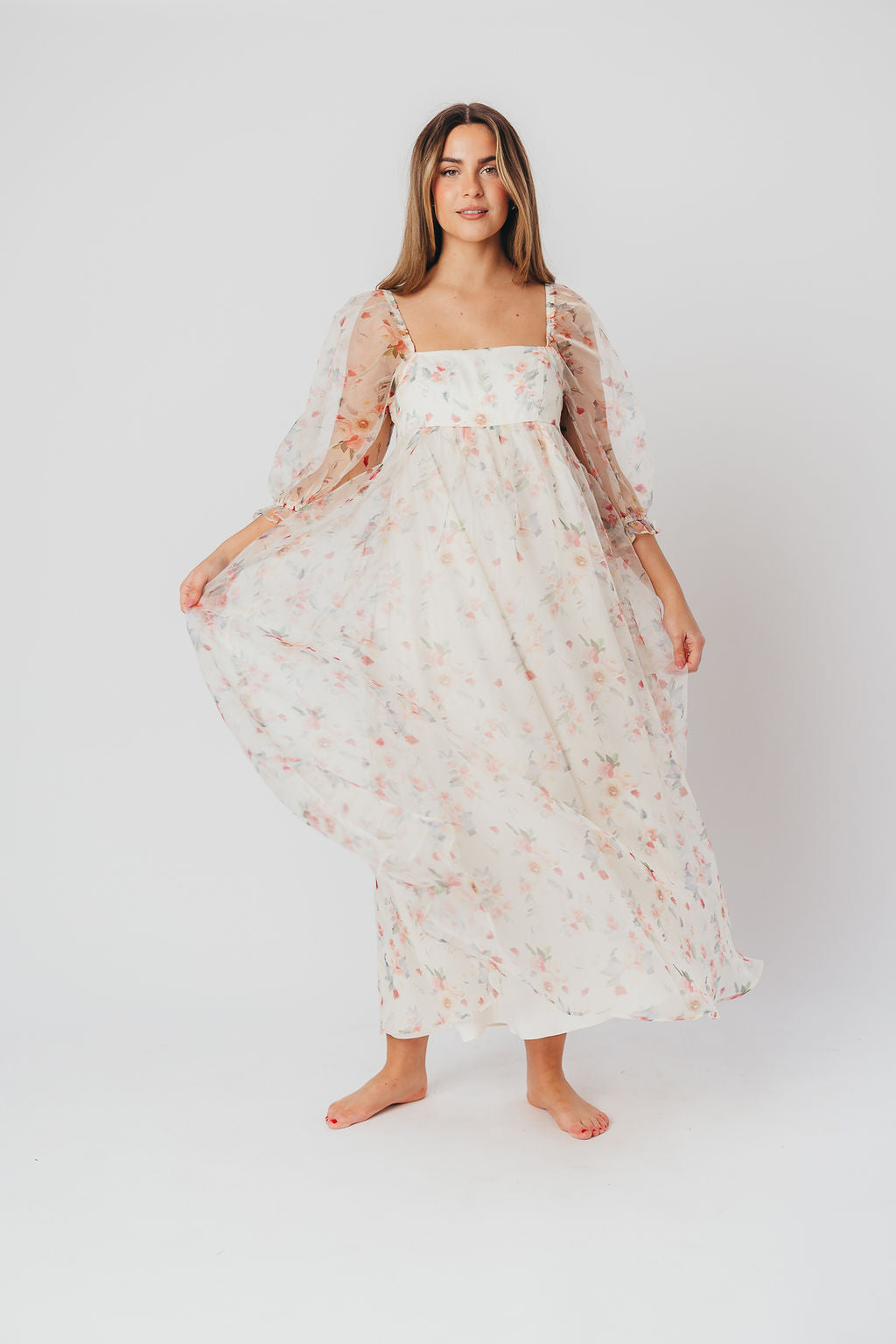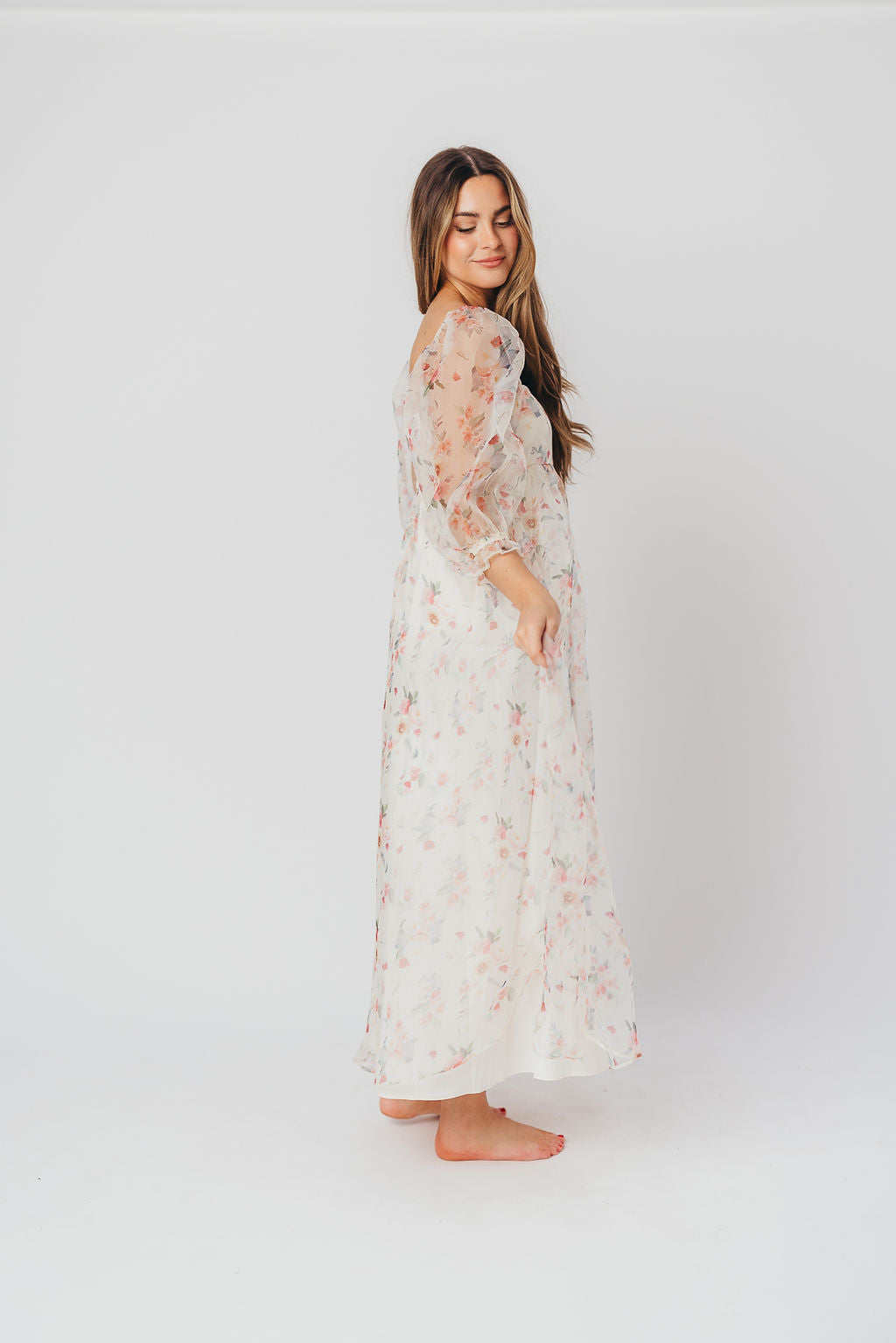 GARMENT DETAILS: Empire-waisted maxi dress in a pastel floral pattern. Features square neckline, sheer 3/4 puffed sleeves, and bust darts, with a stretchy, smocked back panel. Lined.