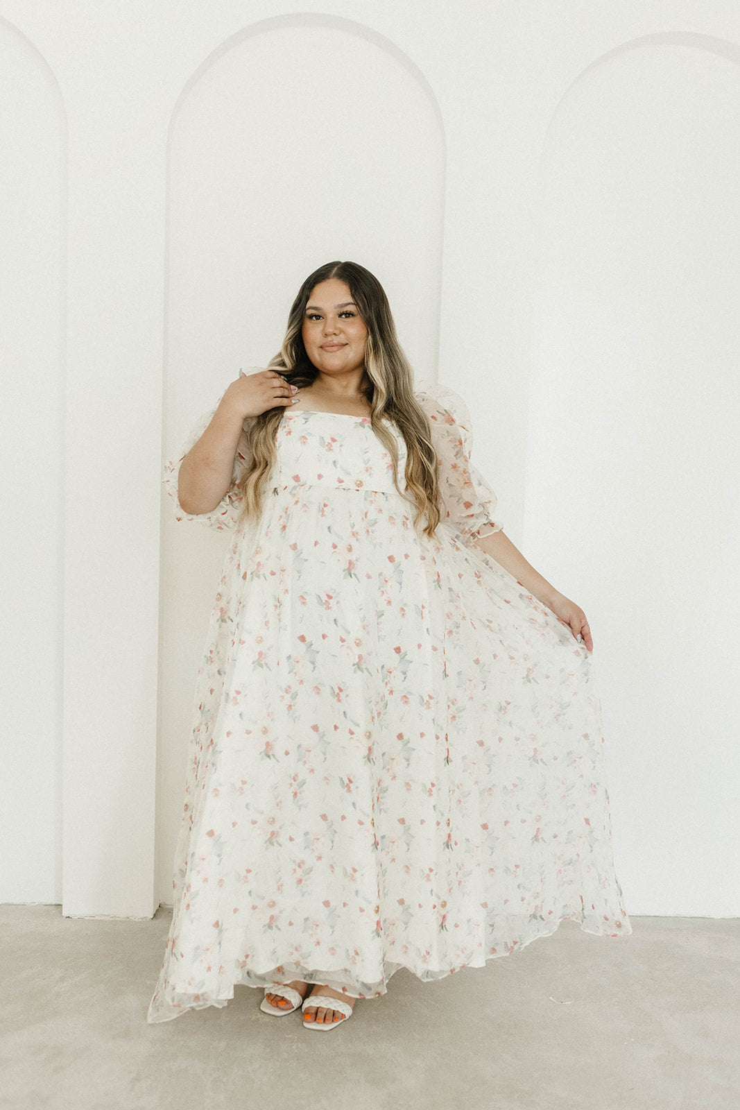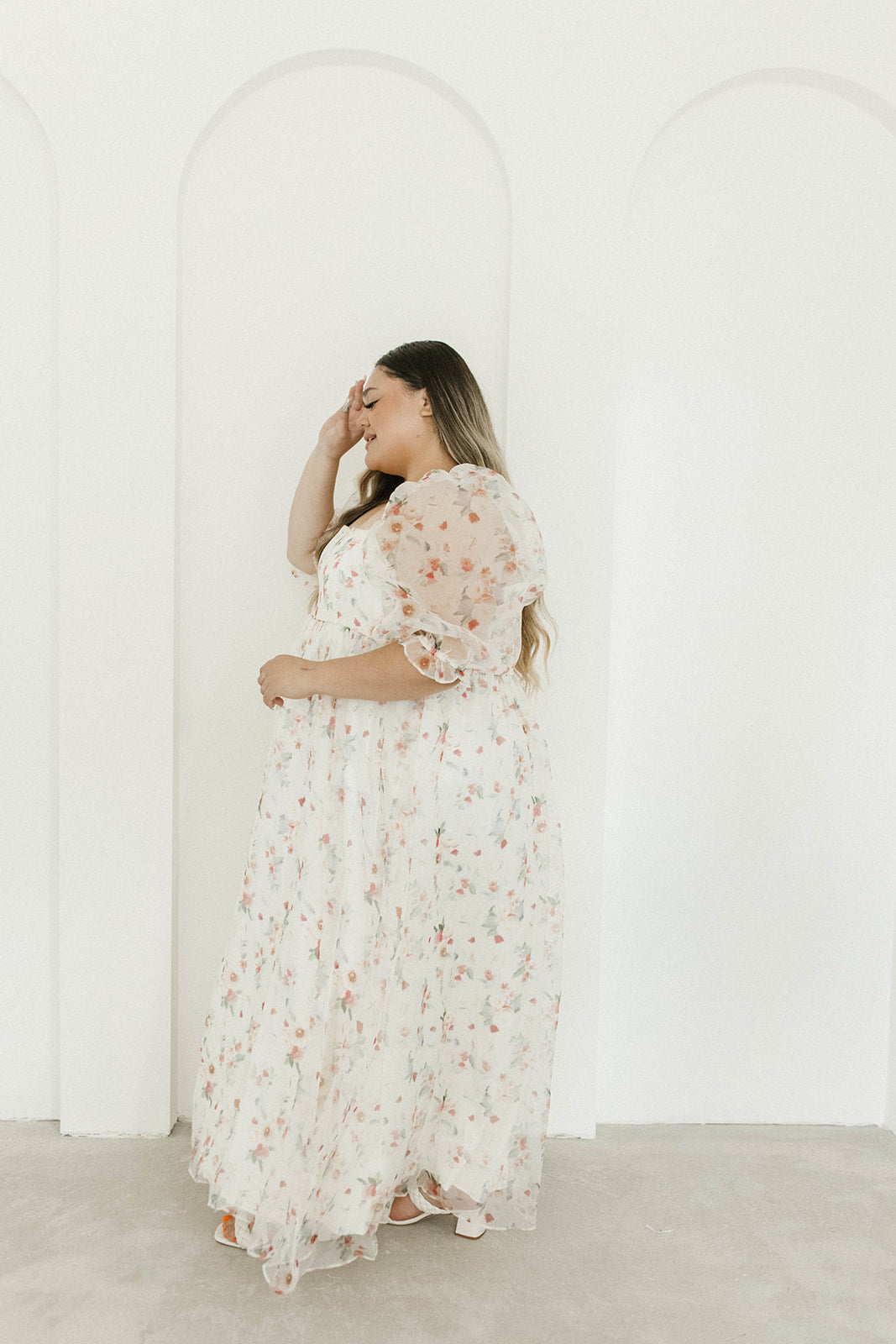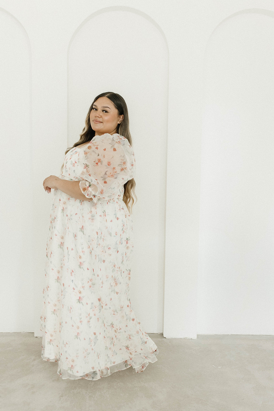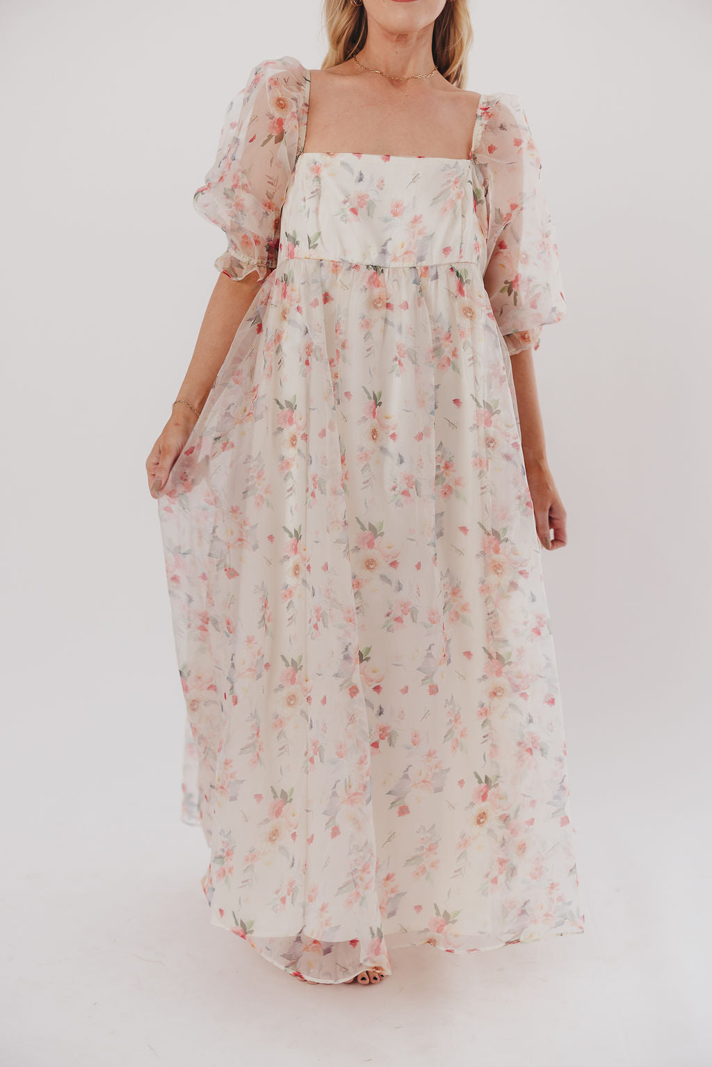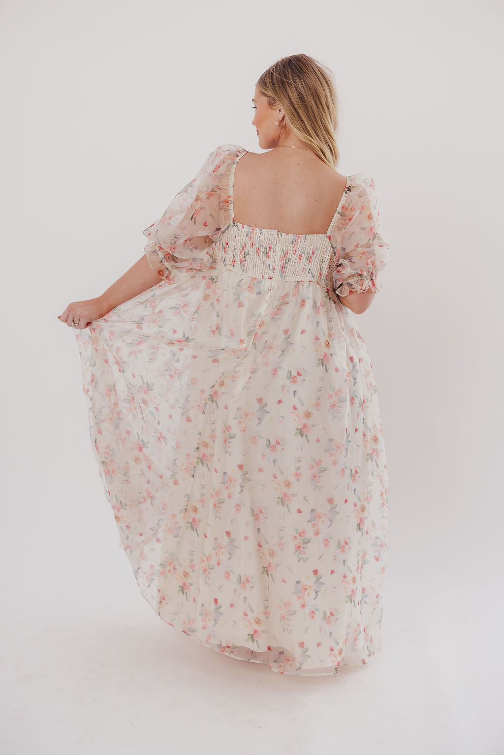 GARMENT DETAILS: Empire-waisted maxi dress in a pastel floral pattern. Features square neckline, sheer 3/4 puffed sleeves, and bust darts, with a stretchy, smocked back panel. Lined.