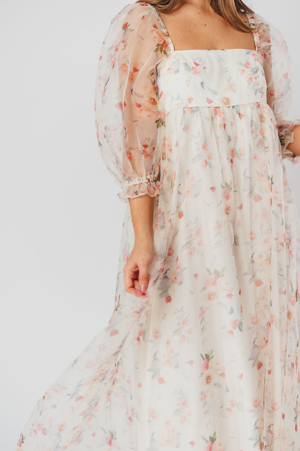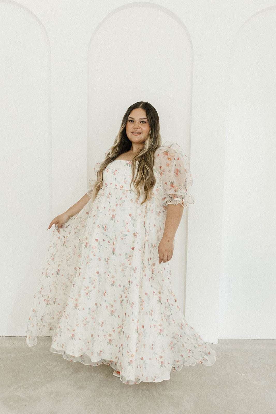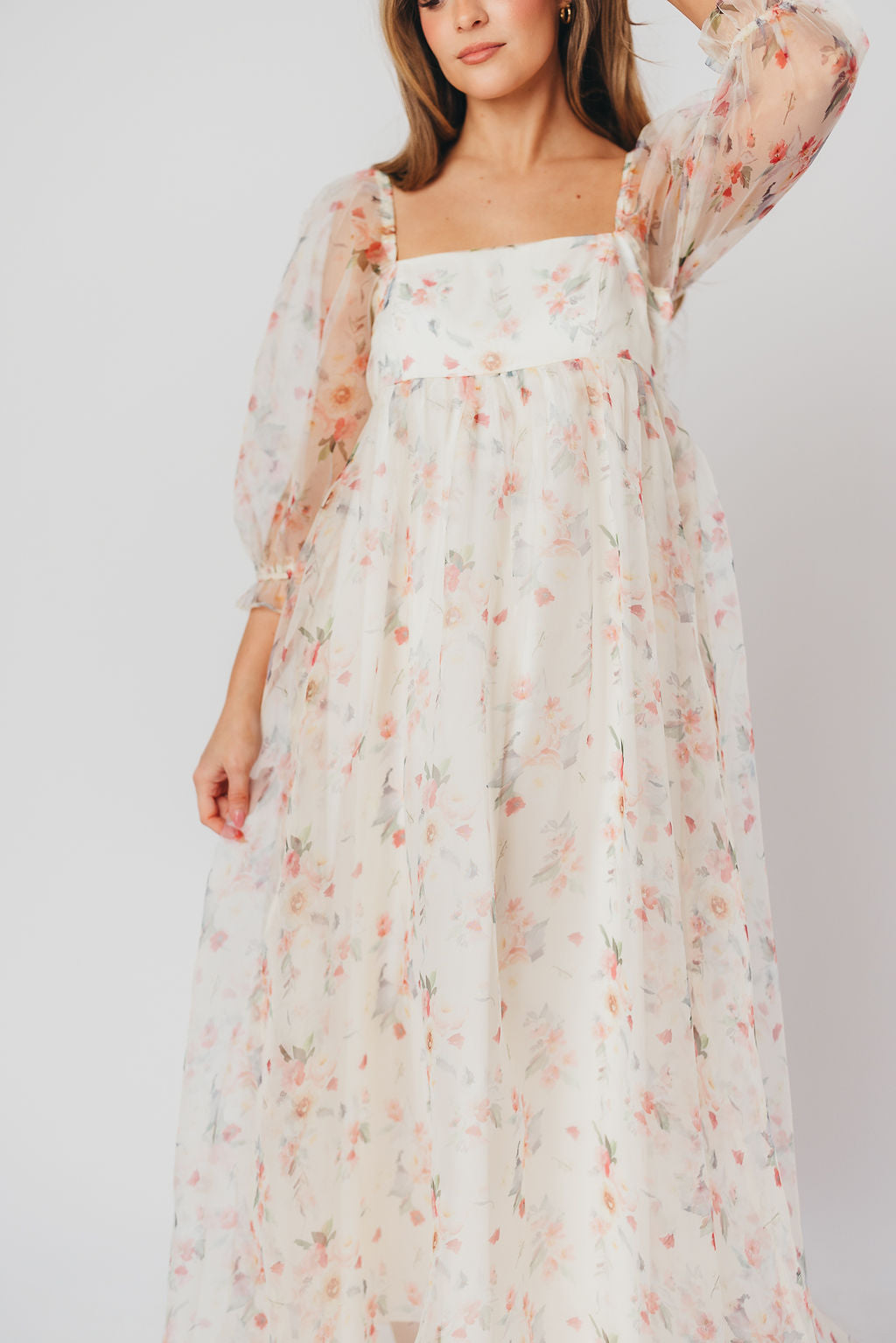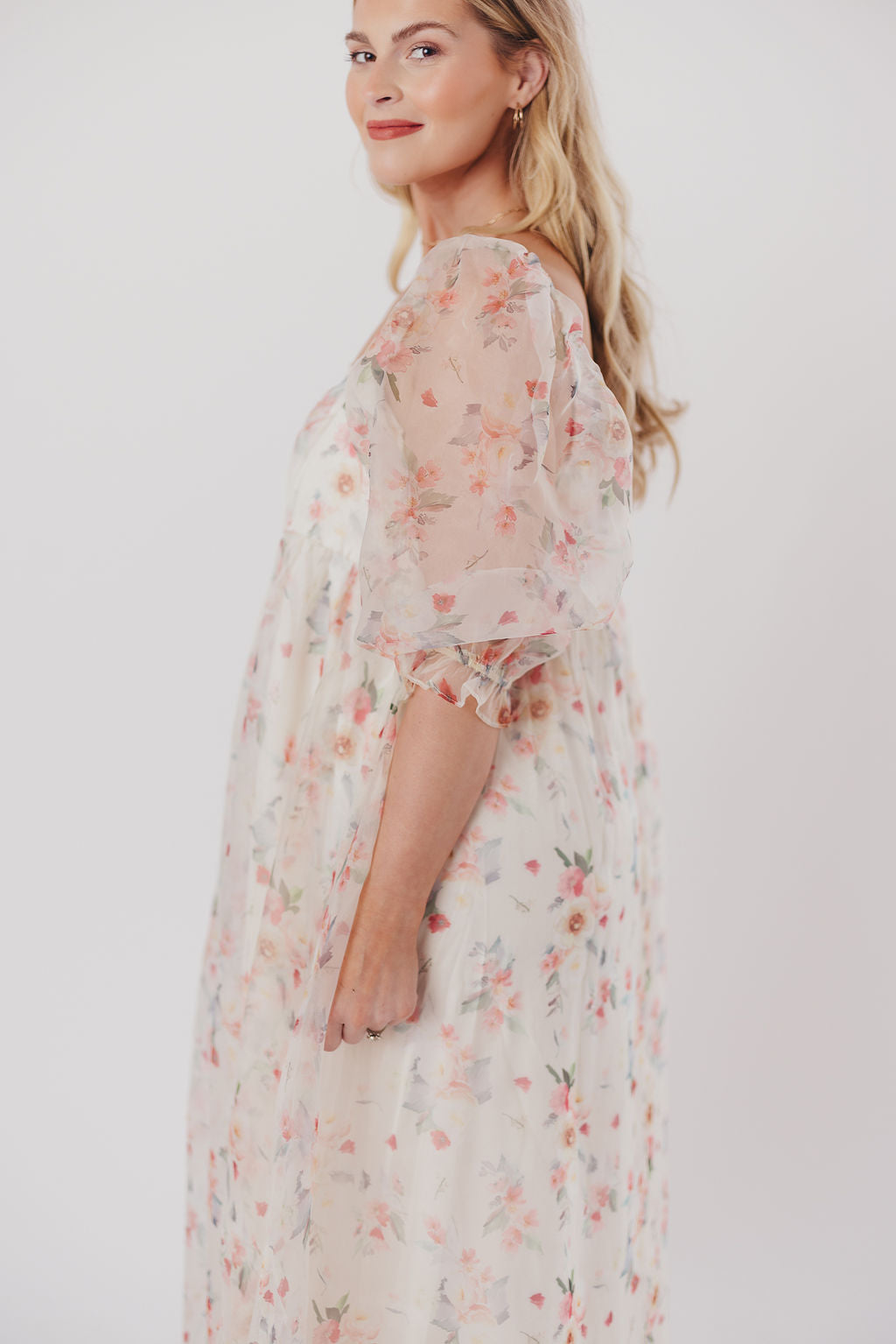GARMENT DETAILS: Empire-waisted maxi dress in a pastel floral pattern. Features square neckline, sheer 3/4 puffed sleeves, and bust darts, with a stretchy, smocked back panel. Lined.