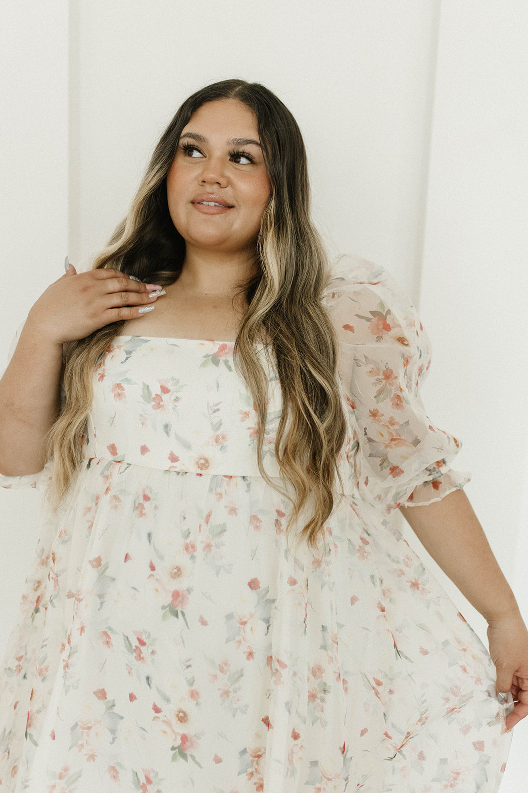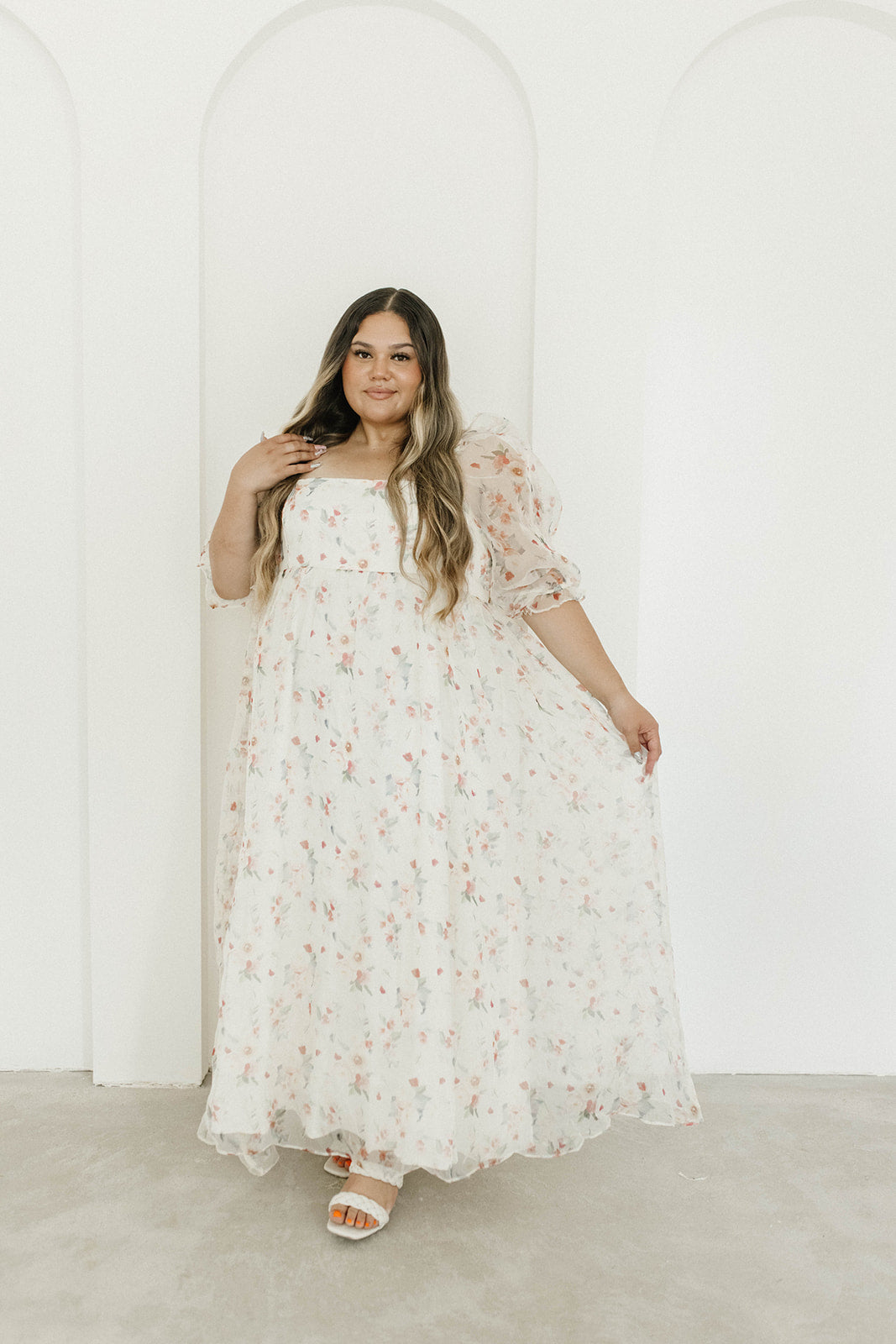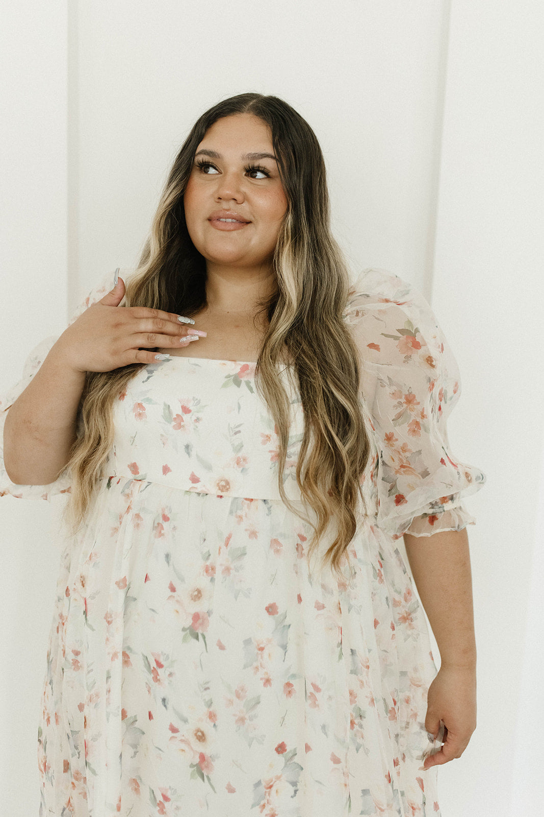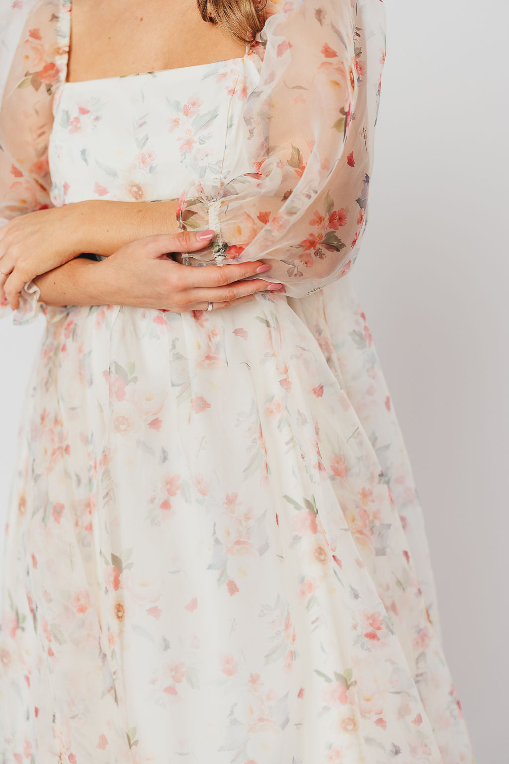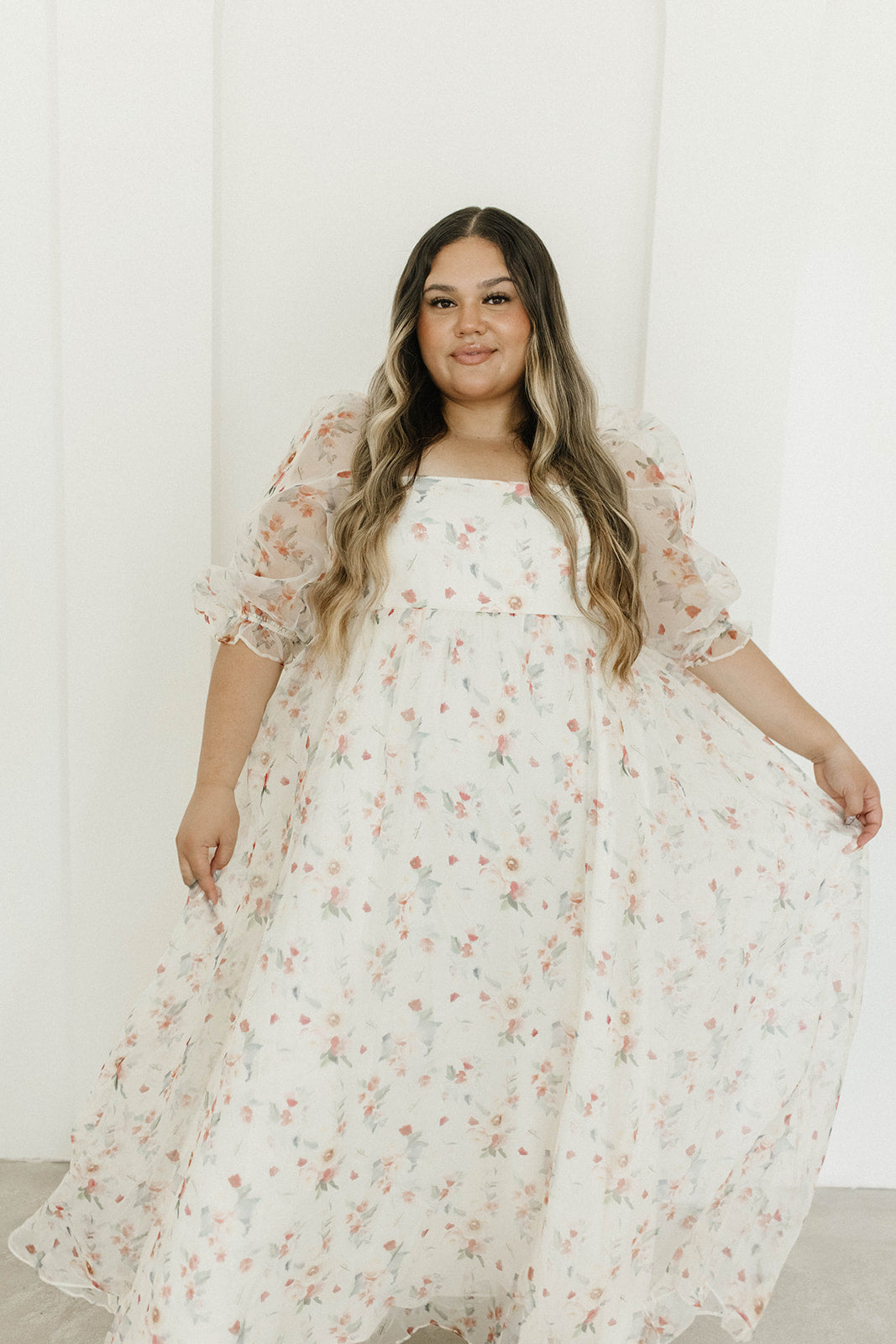 GARMENT DETAILS: Empire-waisted maxi dress in a pastel floral pattern. Features square neckline, sheer 3/4 puffed sleeves, and bust darts, with a stretchy, smocked back panel. Lined.