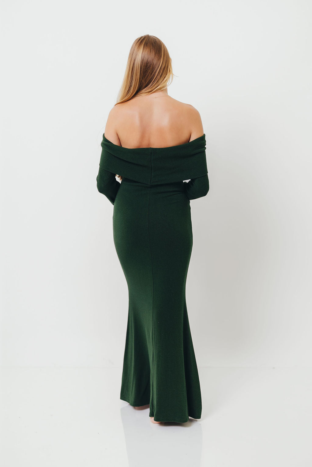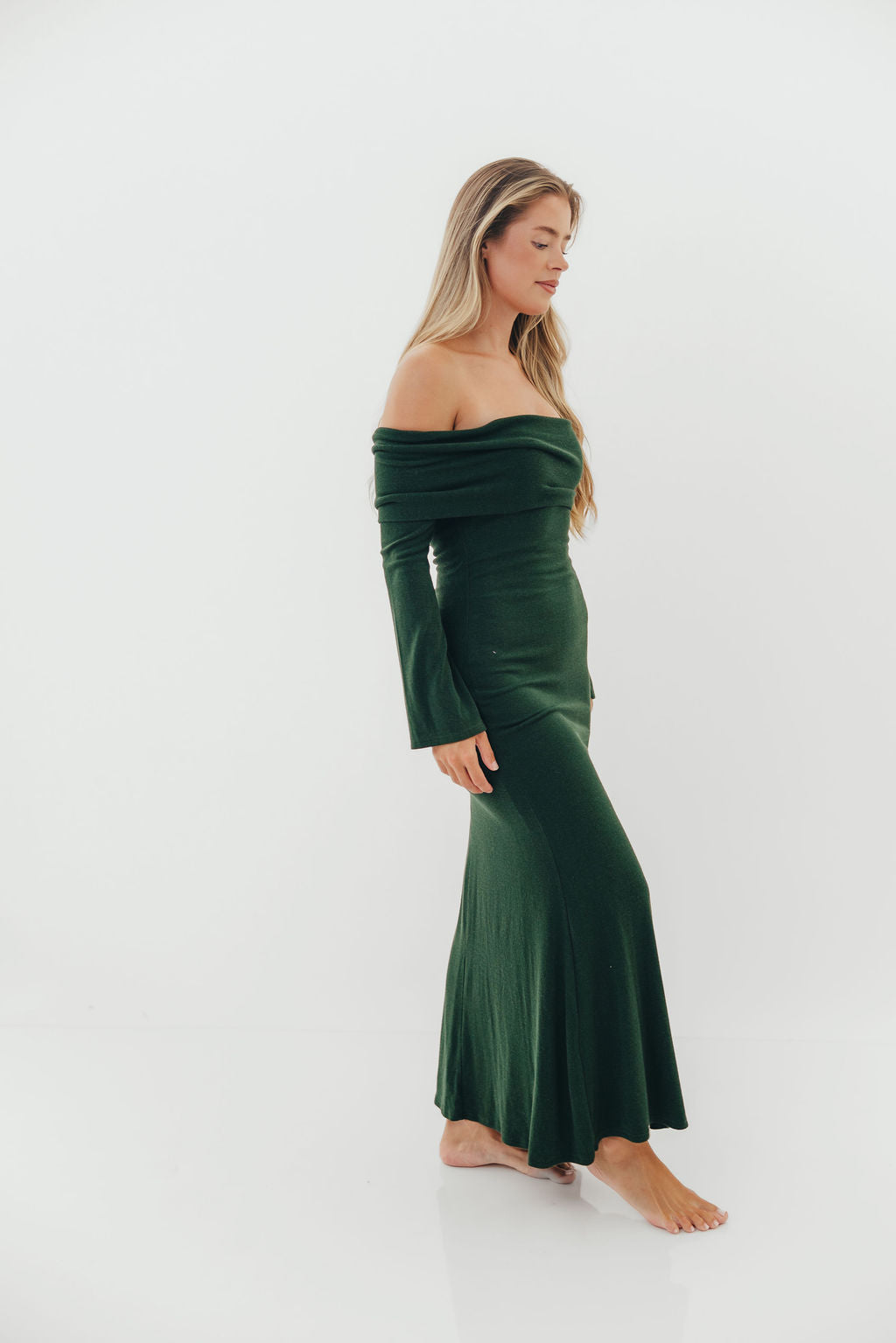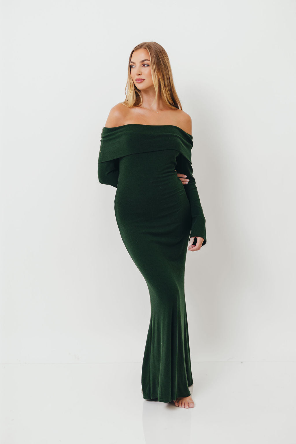 GARMENT DETAILS: Sleek and fitted maxi dress in a luxuriously soft knit. Features a folded off-the-shoulder neckline with long sleeves and a fit-and-flare design that is fitted through the hips and thighs and flares at the knee. Fully lined for maximum coverage and comfort.