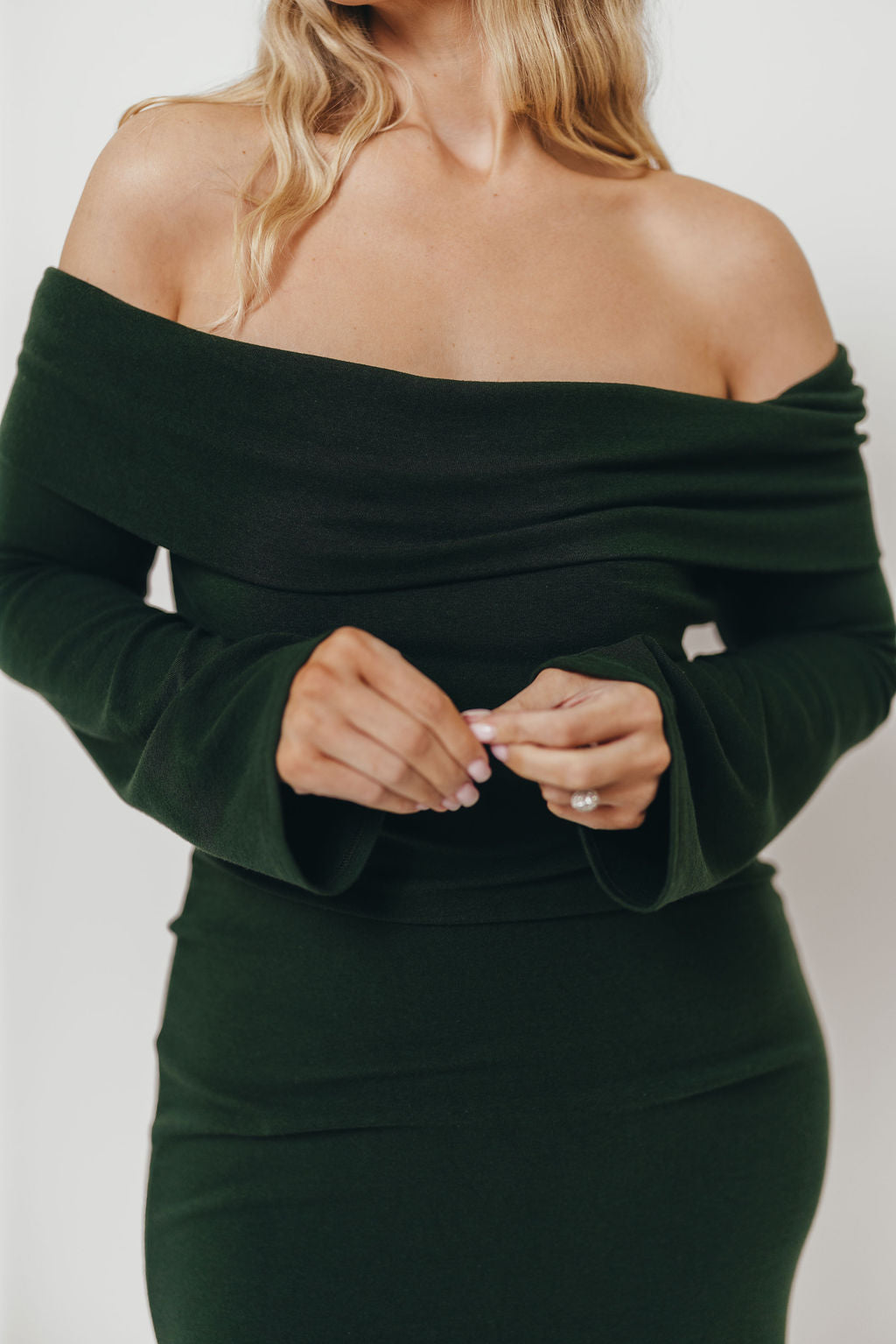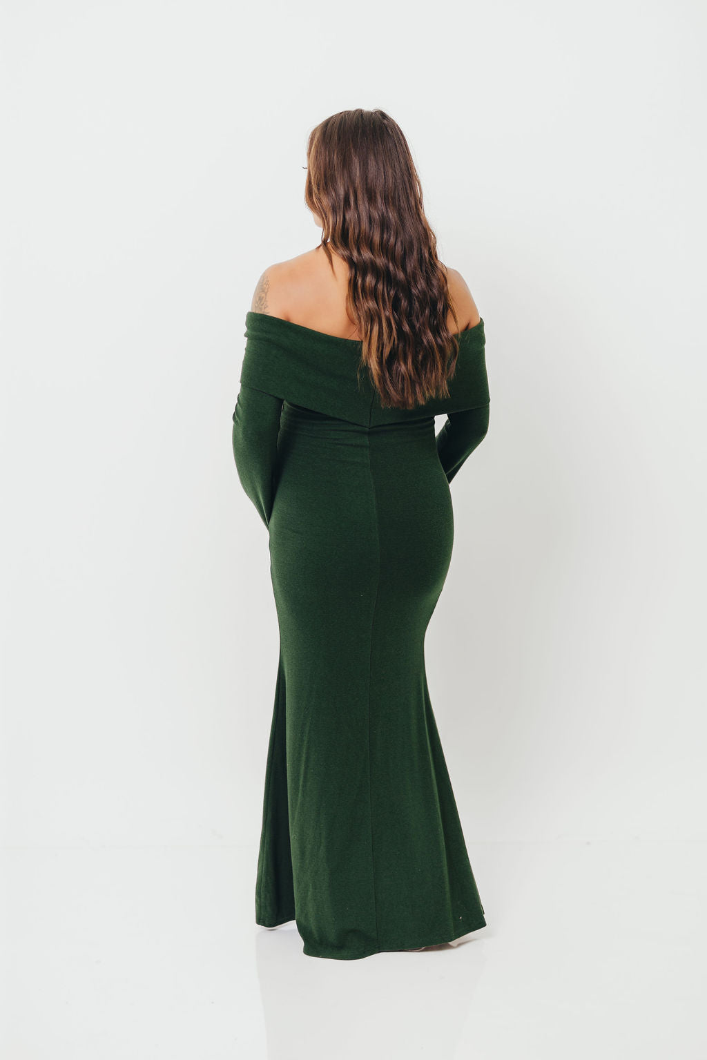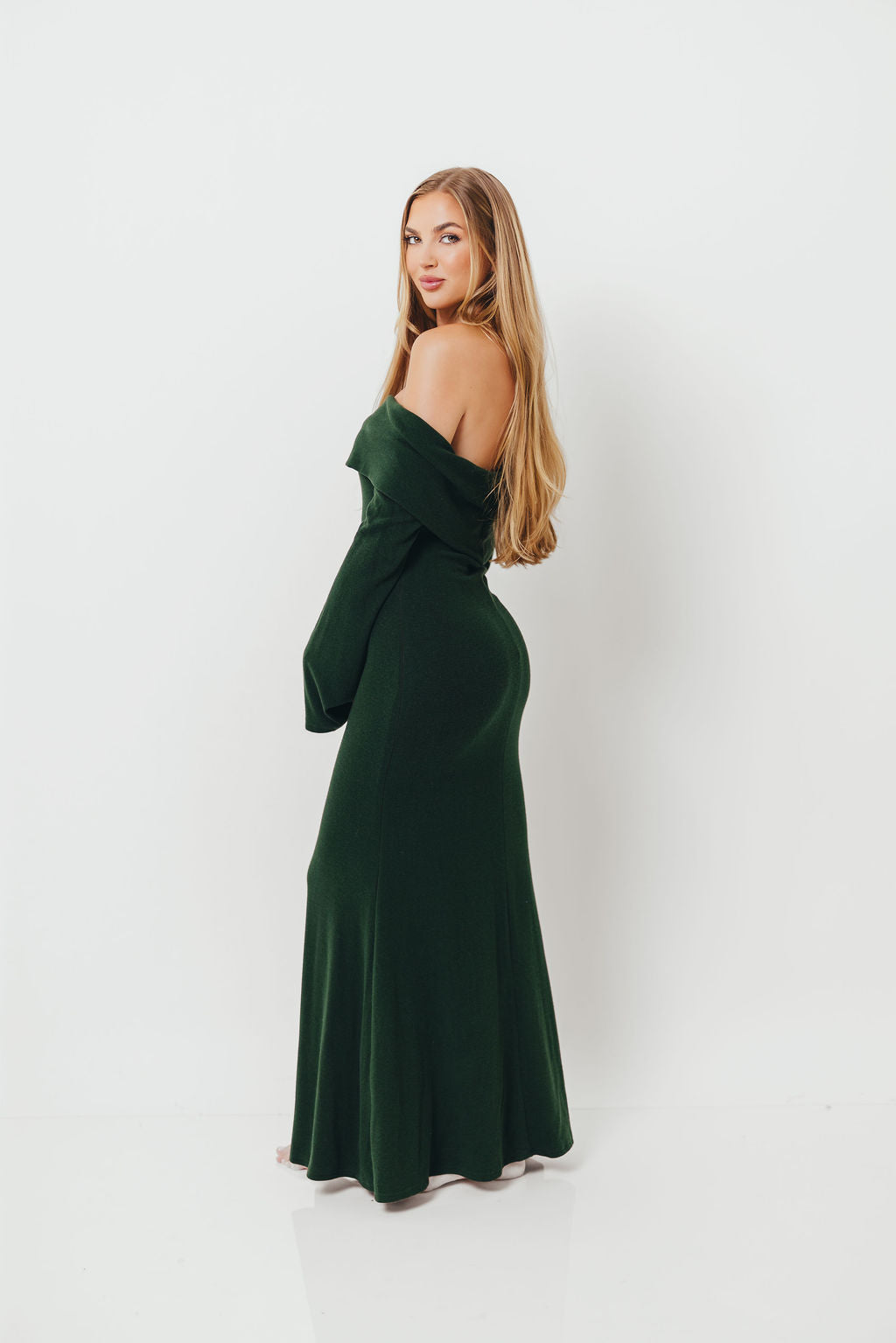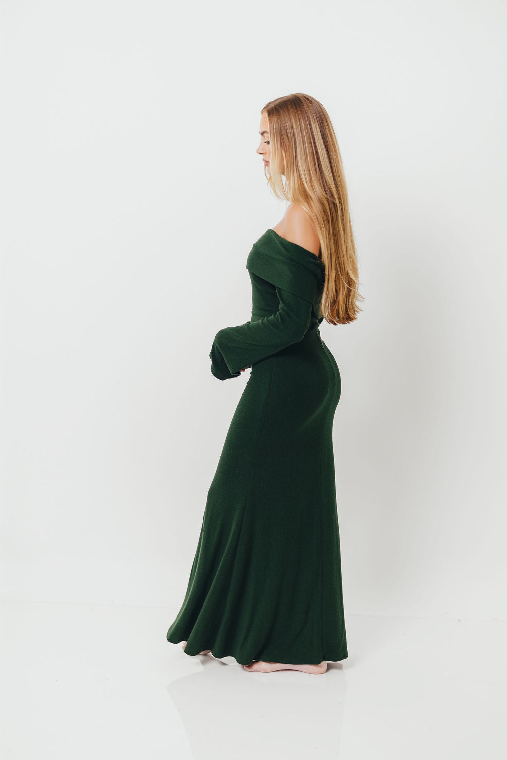 GARMENT DETAILS: Sleek and fitted maxi dress in a luxuriously soft knit. Features a folded off-the-shoulder neckline with long sleeves and a fit-and-flare design that is fitted through the hips and thighs and flares at the knee. Fully lined for maximum coverage and comfort.
