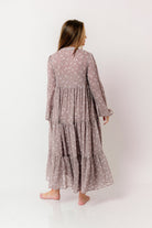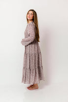 GARMENT DETAILS: Feminine, flowy maxi dress with delicate floral print design and functional front button design. Features relaxed fit, with long puffed sleeves, multi-tiered skirt, and included slip.