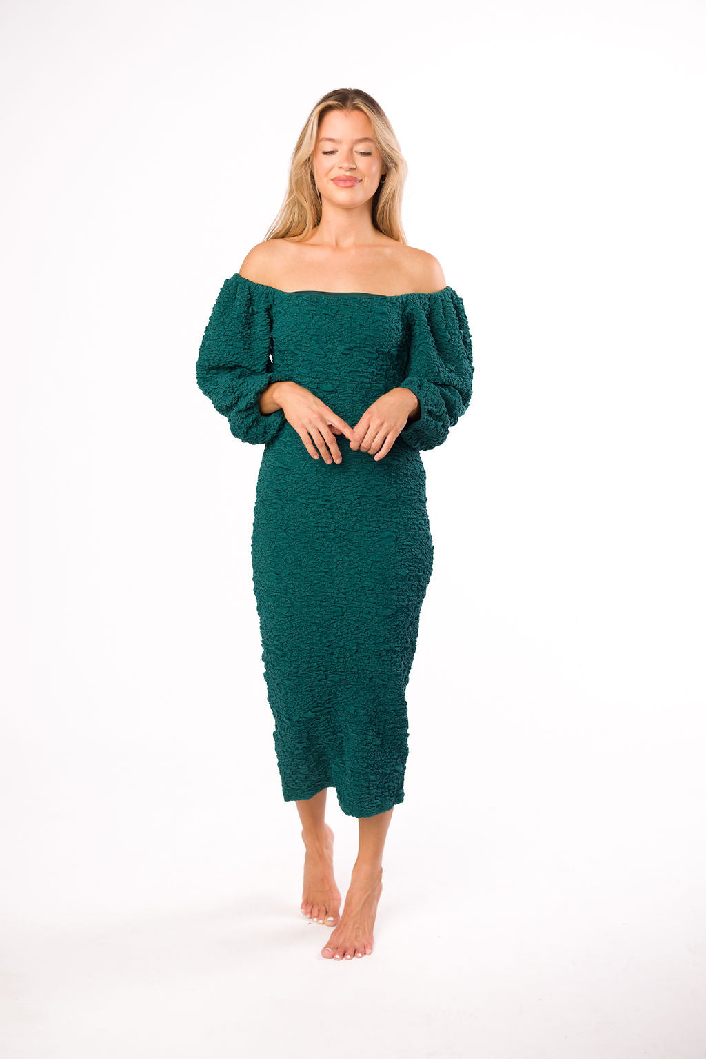 Be the envy of every holiday party this season in the Darcy Midi Dress! This flattering dress features playful 3/4 length blouson sleeves, with a fitted silhouette and textured fabric that elevates its elegant style. Pair with strappy heels for the perfect night out!