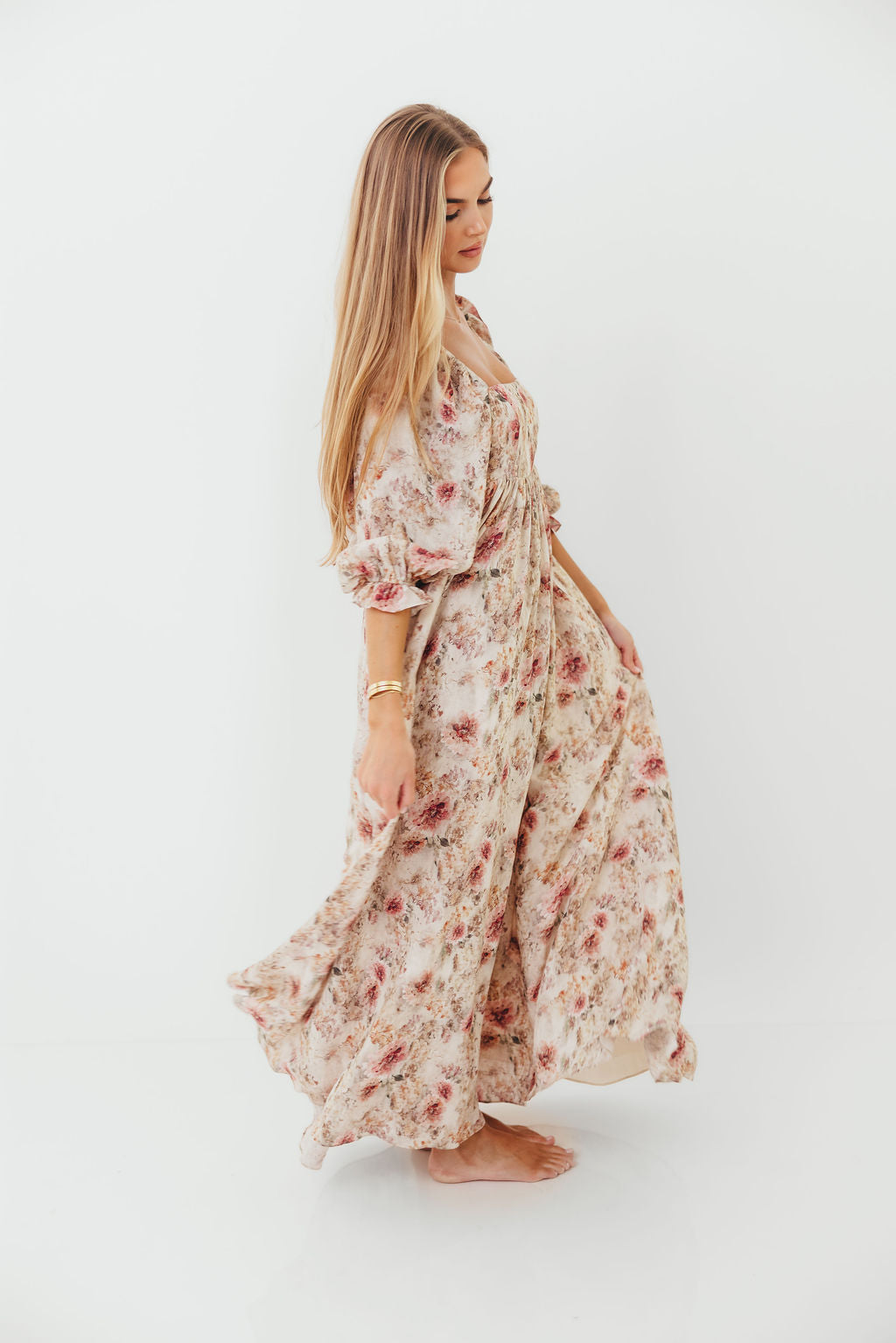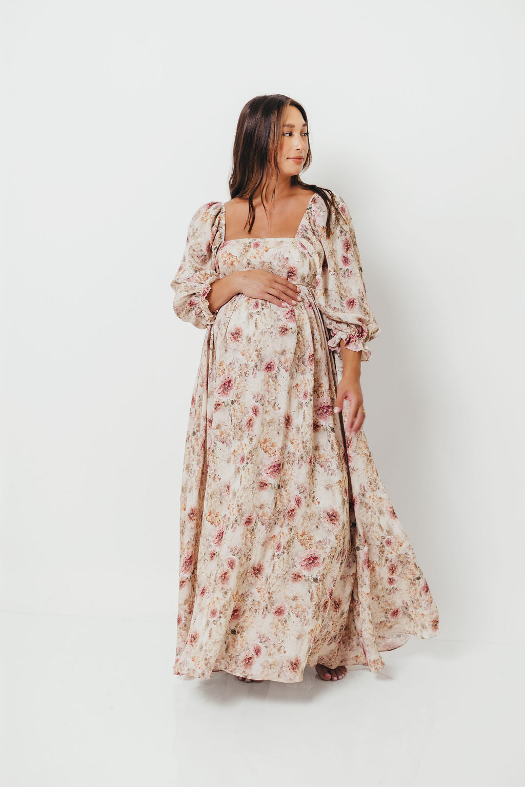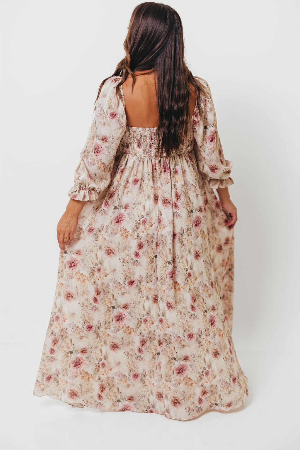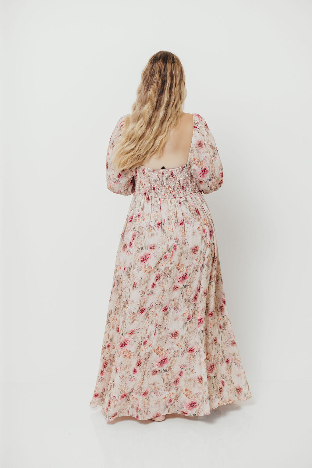 Mona Maxi Dress with Smocking in Pink/Beige Multi Floral - Bump Friendly