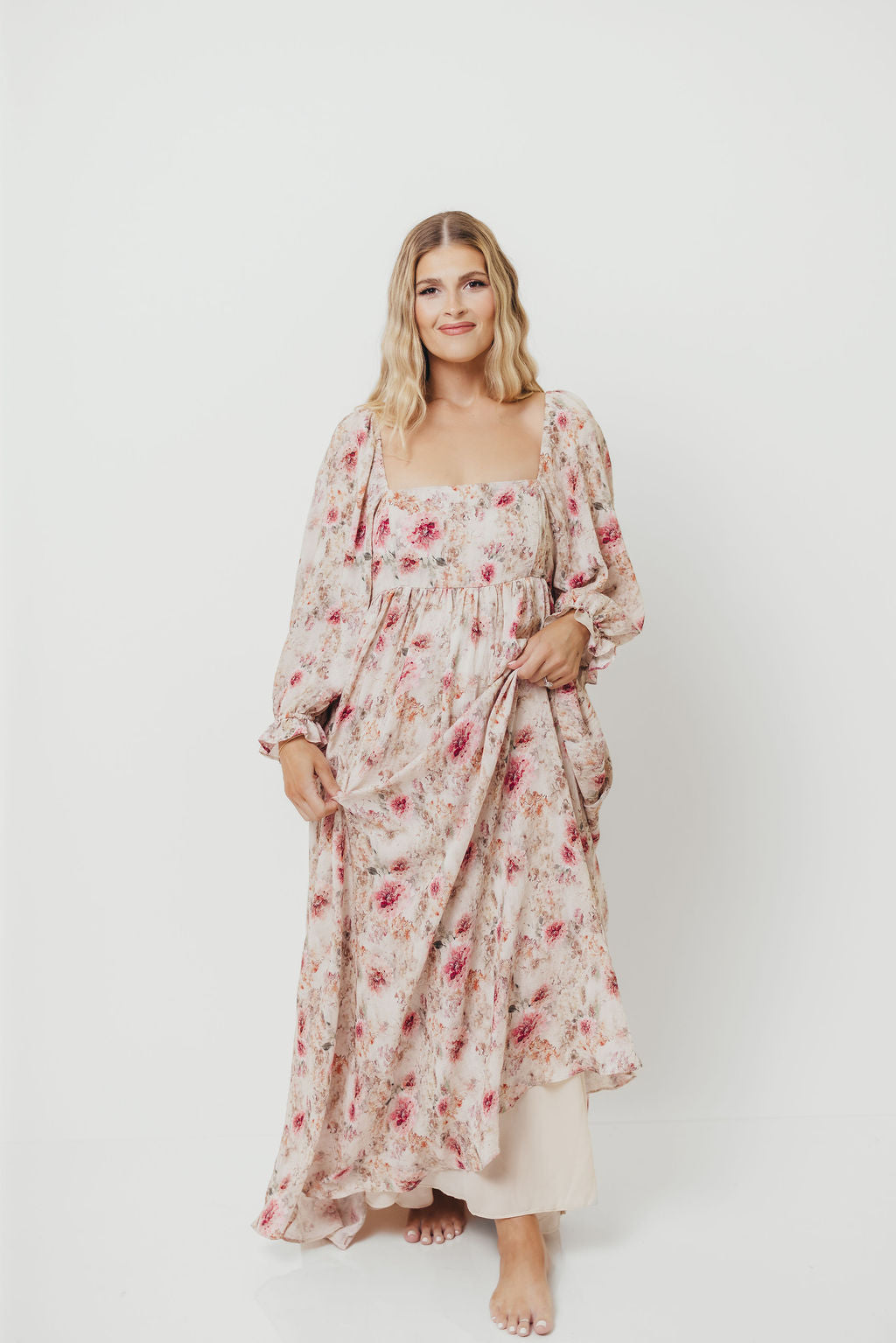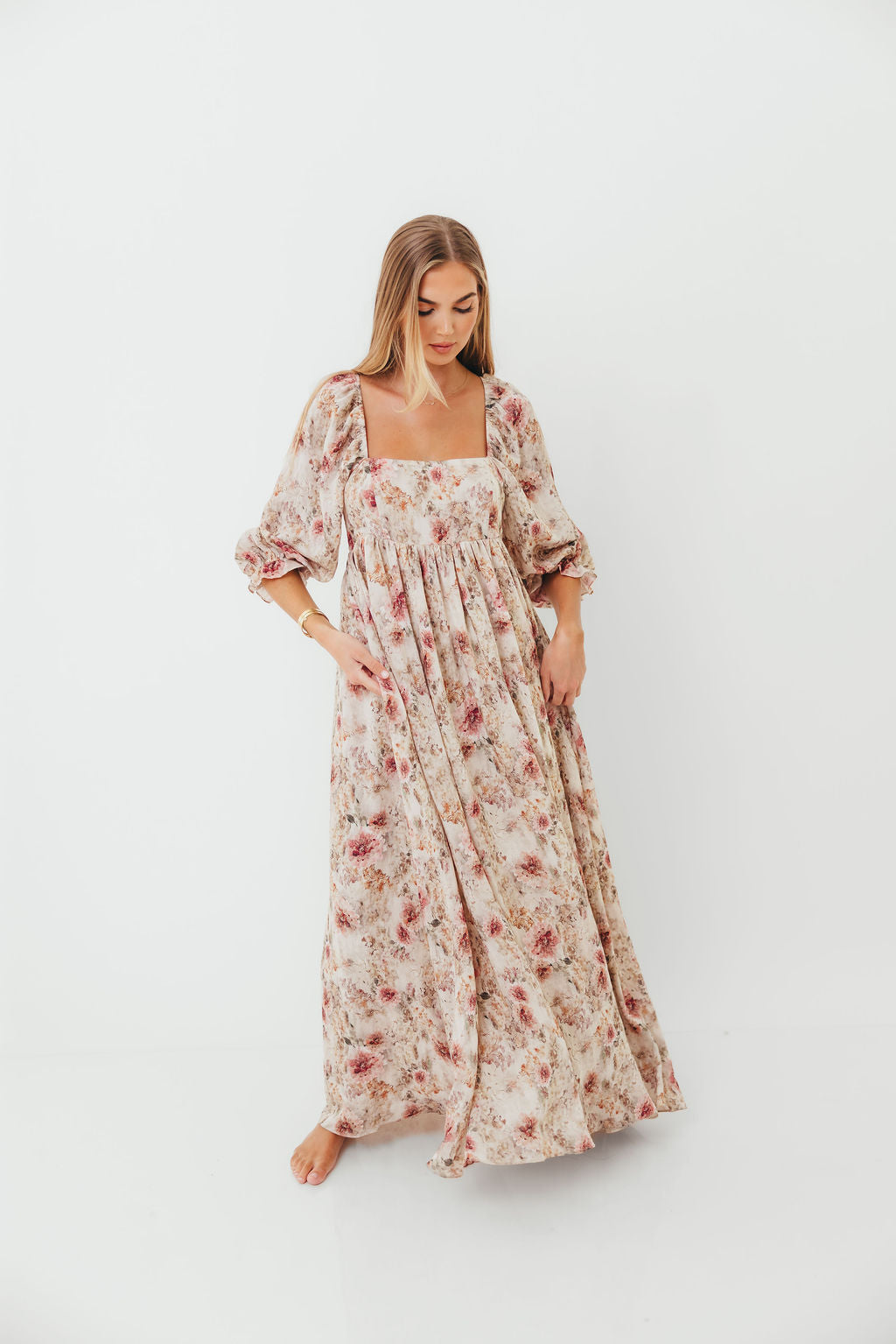 GARMENT DETAILS: Empire-waisted maxi dress in a pastel floral pattern. Features square neckline, sheer 3/4 length puffed sleeves, and bust darts, with a stretchy, smocked back panel. Lined.